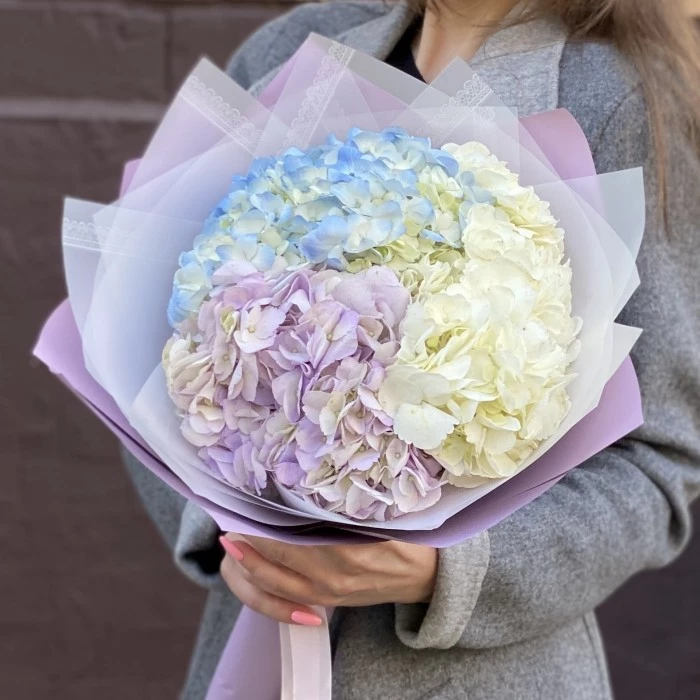 Букет из 3 разноцветных гортензий в стильной корейской упаковке.