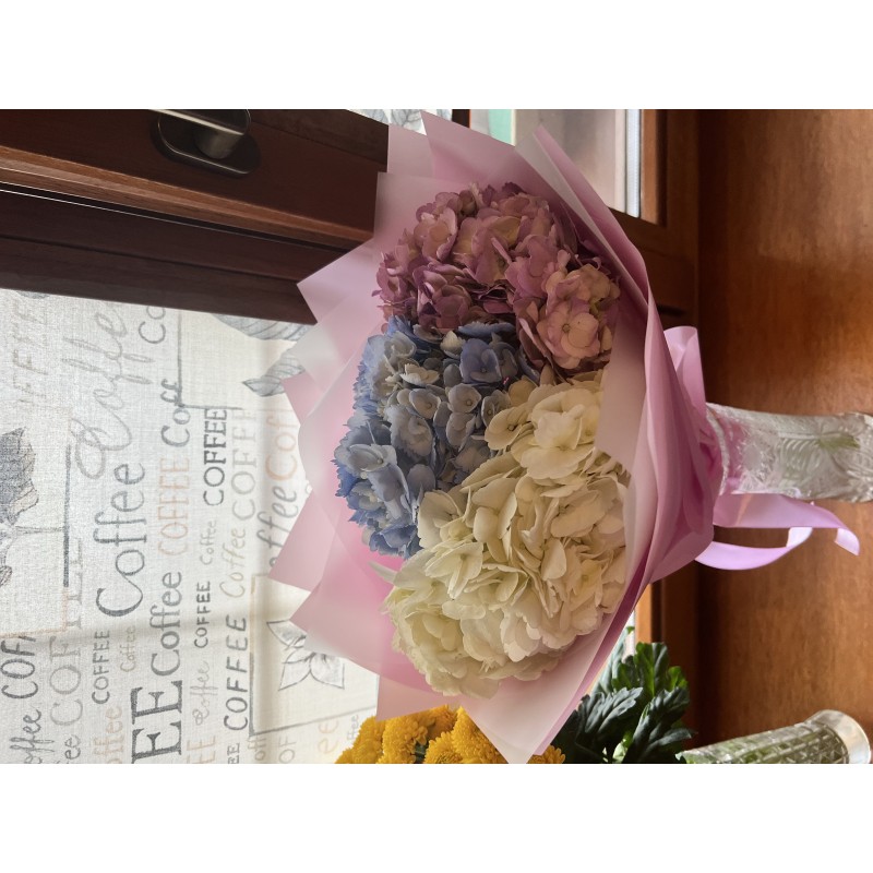 Надежда о заказе: Букет из 3 гортензий миксЗаказ 324618. Чудесный букет! Подарили великолепные эмоции! Курьер доставил вовремя! Вежливо и приятно! Спасибо!