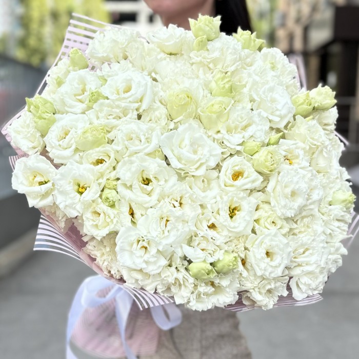 Нежная и романтичная белая махровая эустома в стильной упаковке.