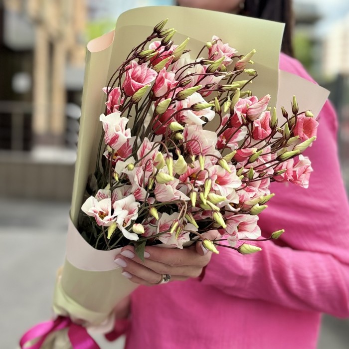 Букет из 5 бело-розовых крашеных эустом. Такой букет универсальный и подойдет в качестве презента для любимого человека. Еще его можно взять первоклашке, выпускнику для подарка учителю или воспитателю. Букет очень легкий поэтому его сможет торжественно нести даже выпускник детского садика.