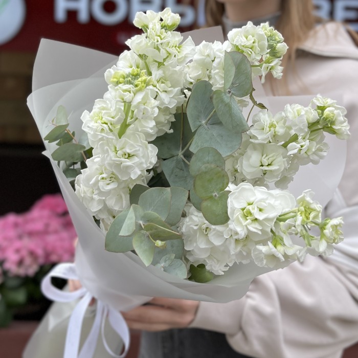 5 белых маттиол с добавлением эвкалипта — это нежное сочетание ароматных цветов и свежей зелени, создающее атмосферу чистоты и гармонии. Такой букет отлично подойдет для особого подарка или украшения интерьера.