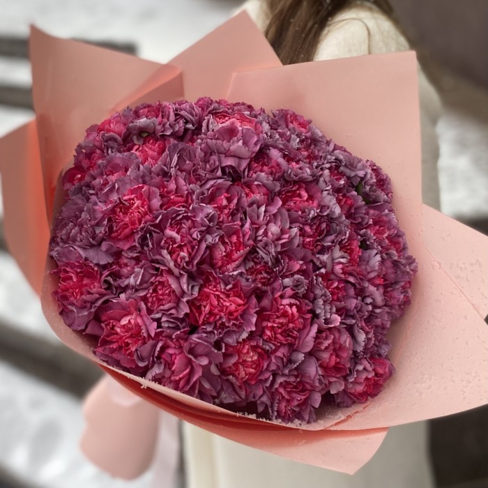 Интересное дизайнерское решение этого букета – насыщенные оттенки гвоздик не оттеняются нежной зеленью. Выглядит такая композиция строго, но одновременно изысканно.