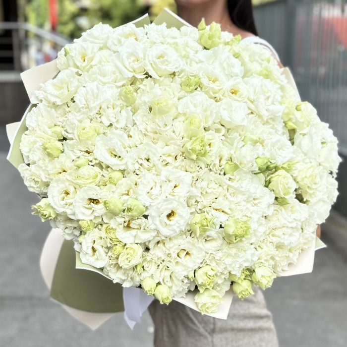Нежная и романтичная белая махровая эустома в стильной упаковке.
