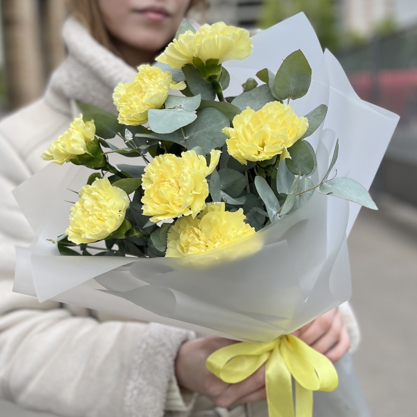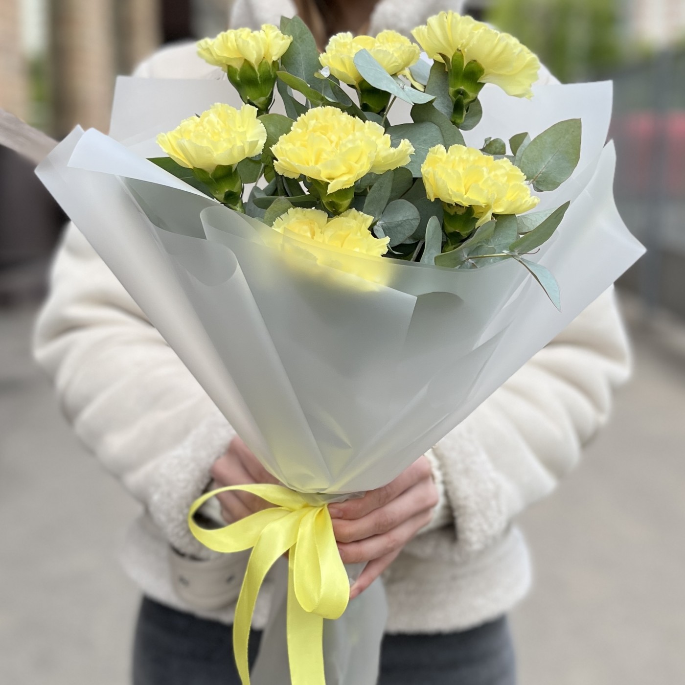 Букет из 7 желтых гвоздик с эвкалиптом — это яркая и свежая композиция, которая наполнит любой интерьер солнечным настроением и природной гармонией. Такой букет отлично подойдет для подарка, украшения или просто чтобы поднять настроение.