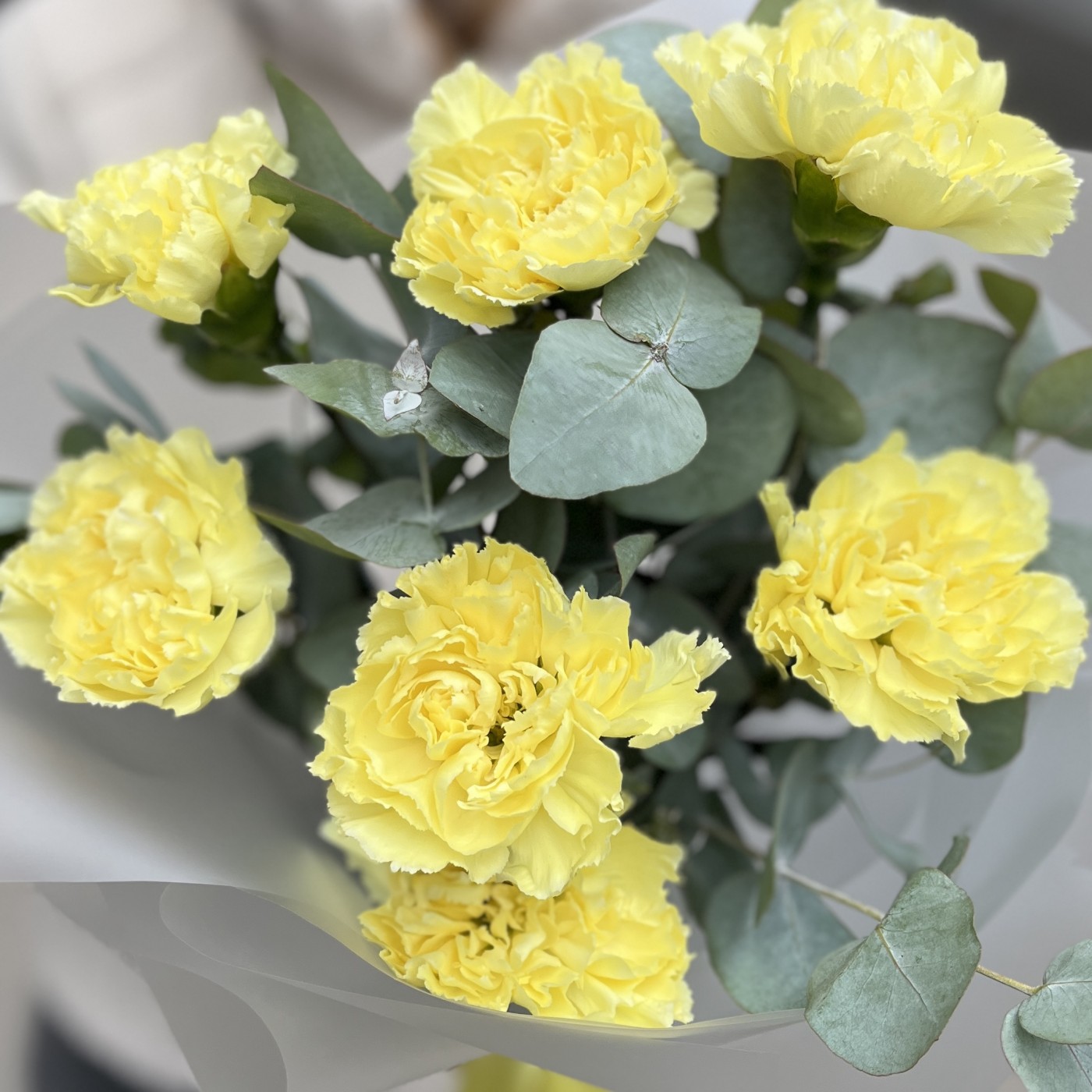 Букет из 7 желтых гвоздик с эвкалиптом