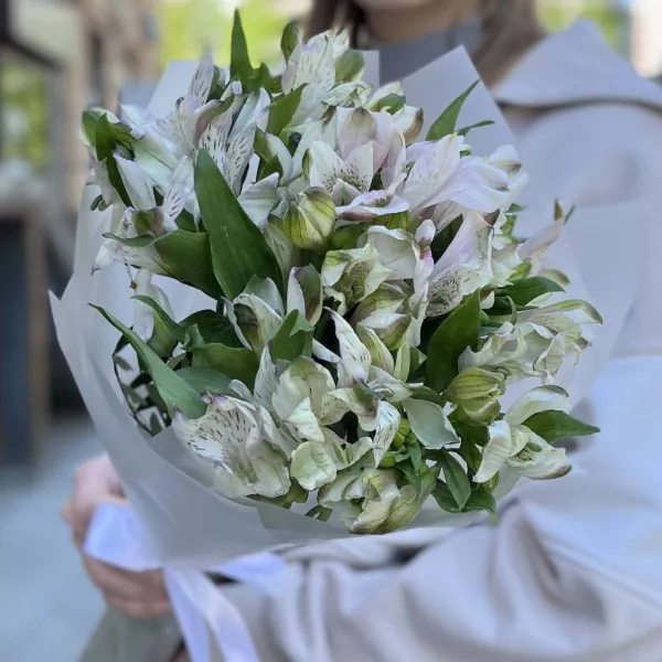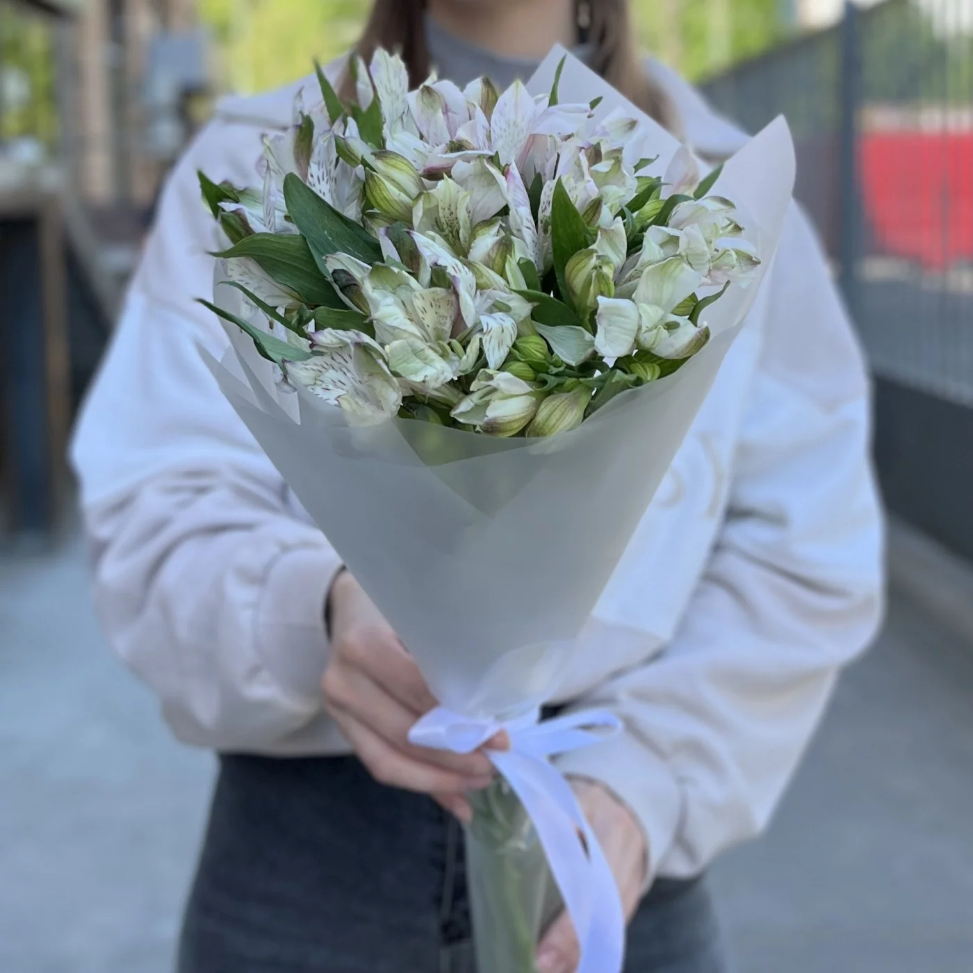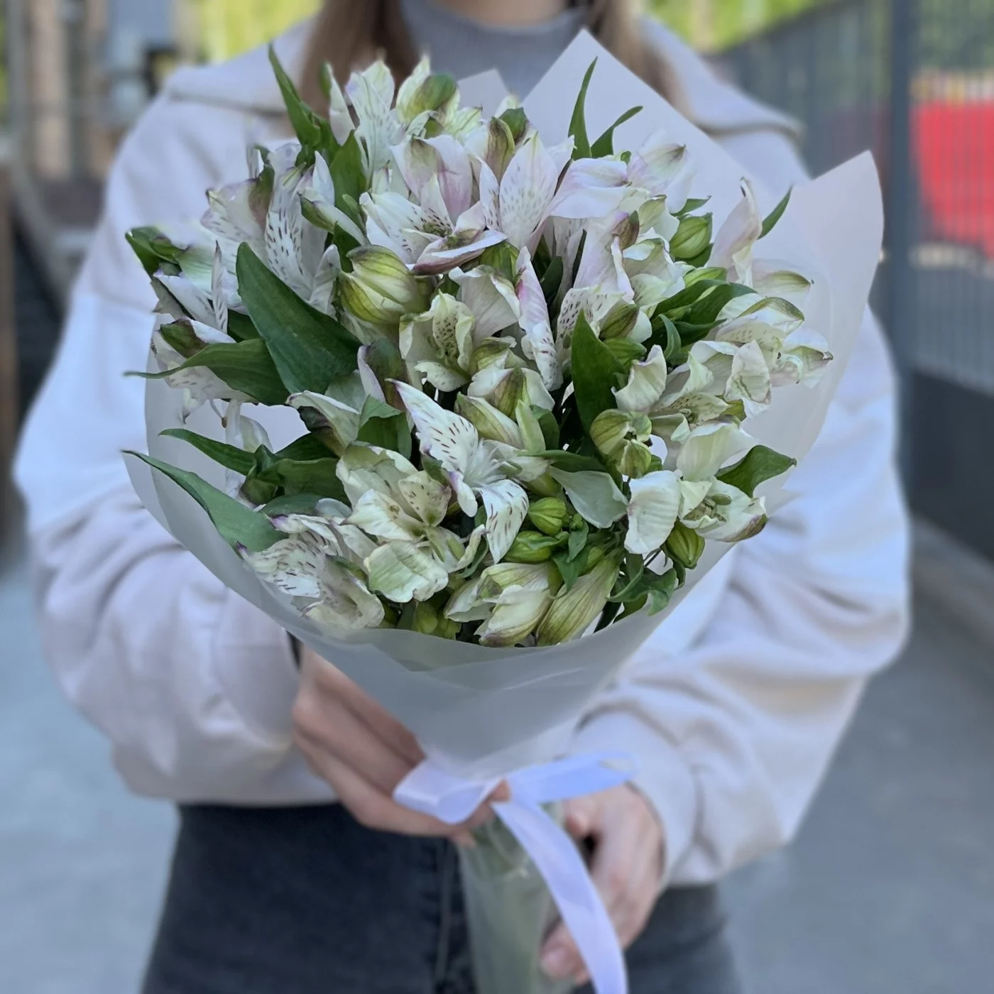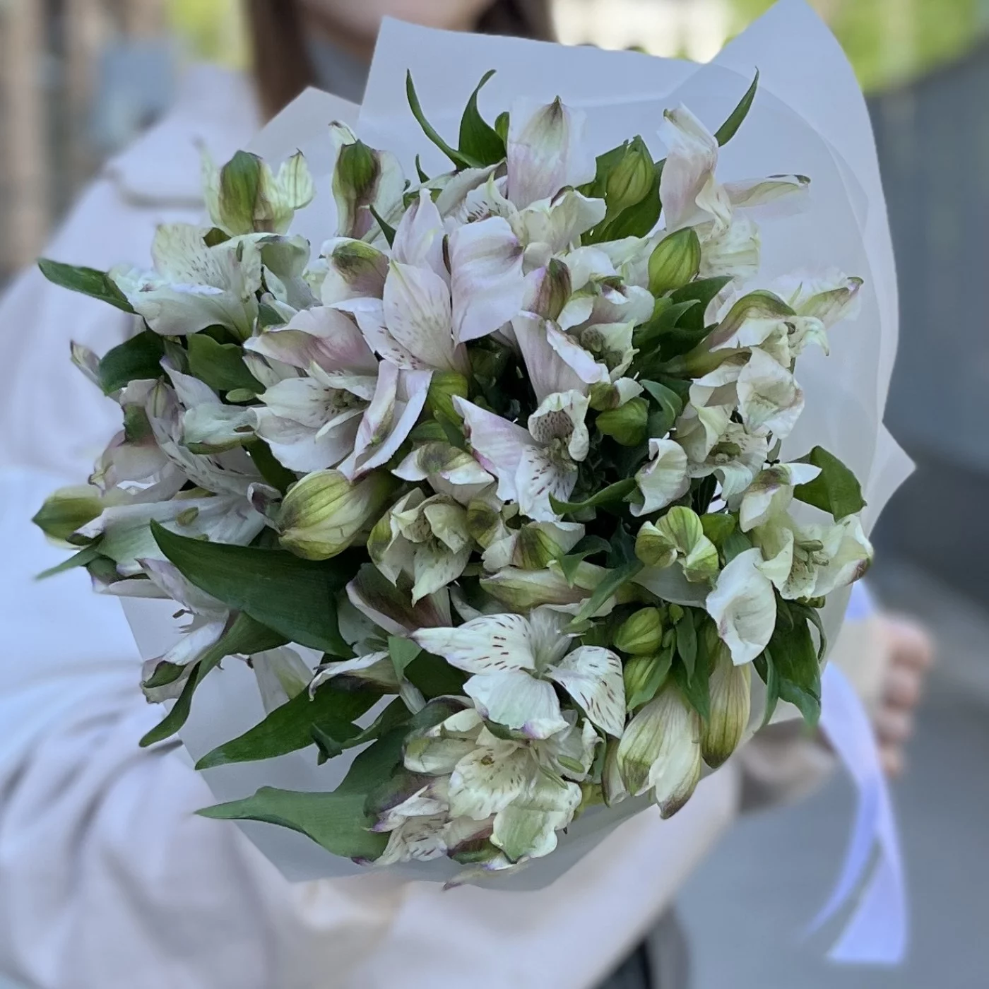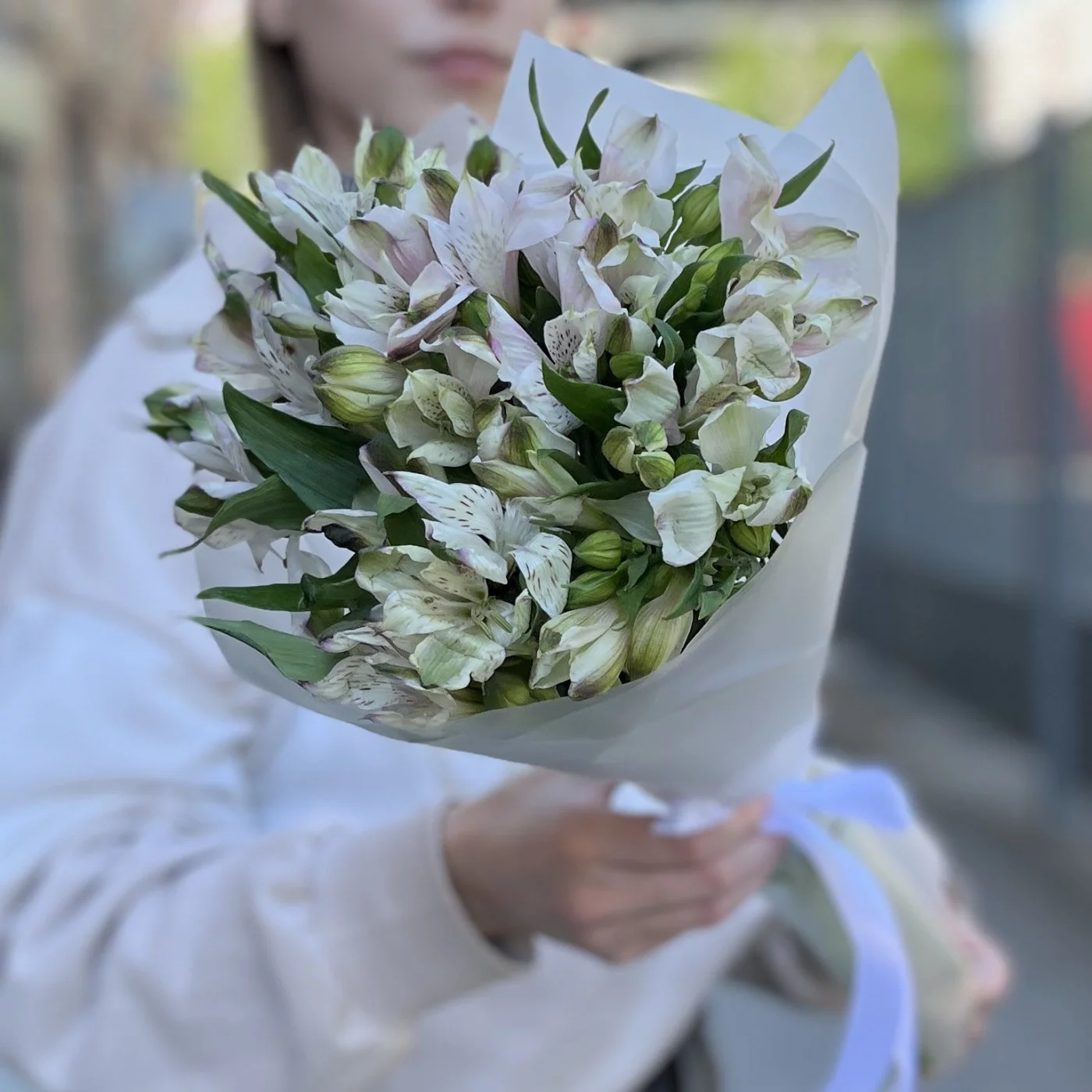 Букет из 9 бело-фиолетовых альстромерий — это великолепная и яркая композиция, которая станет настоящим украшением любого события.