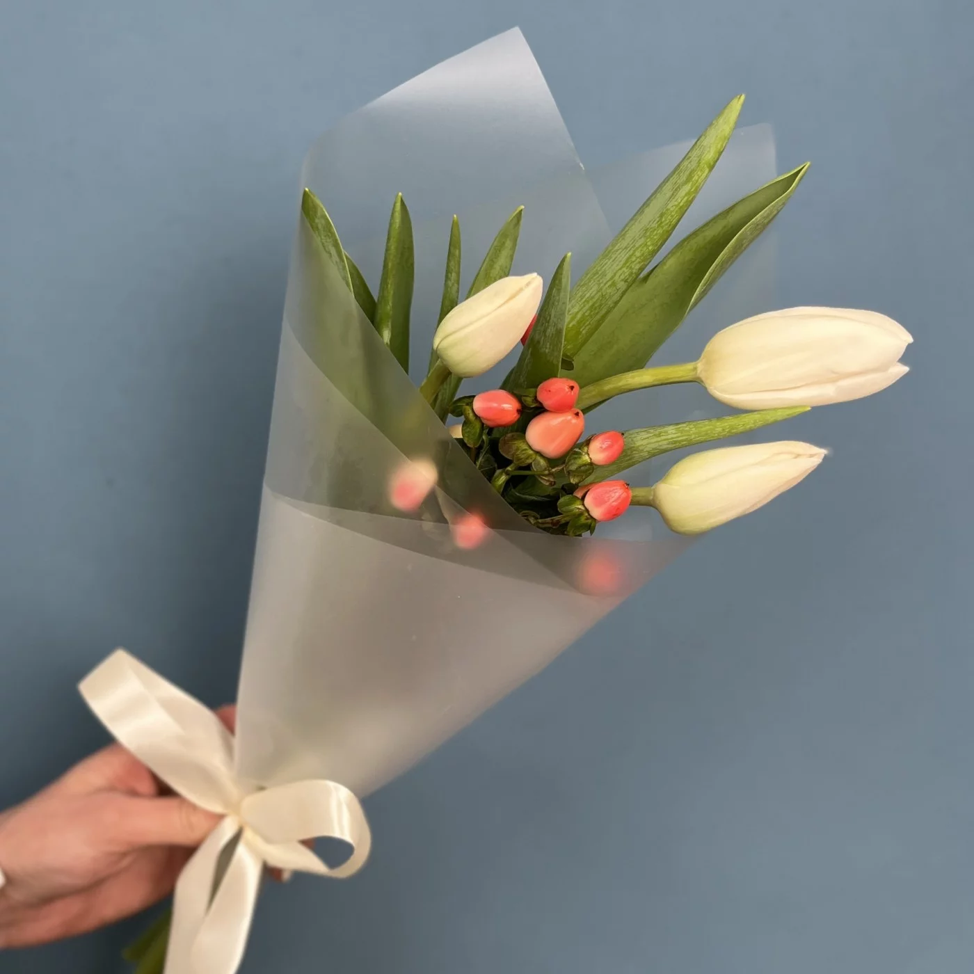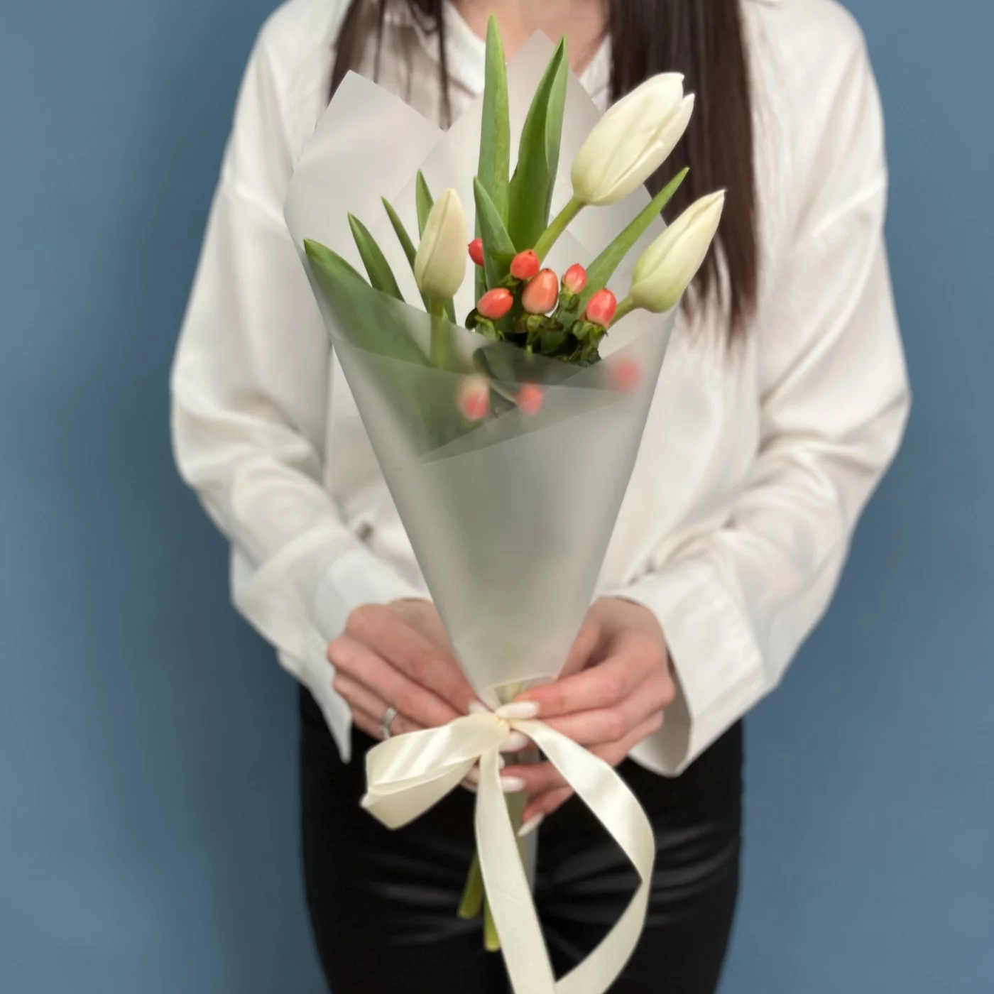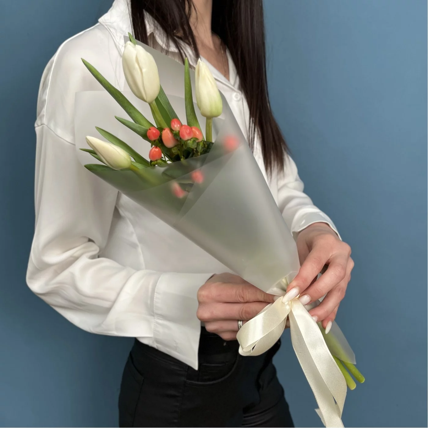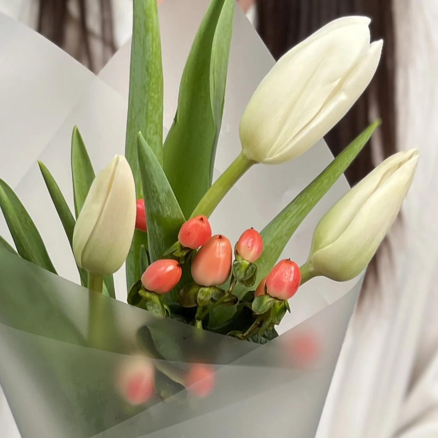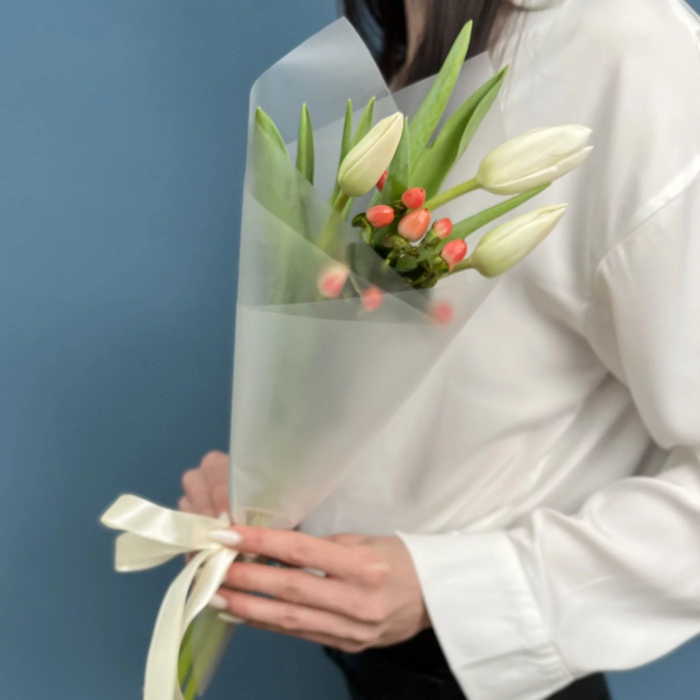 Букет из белых тюльпанов и розового гиперикума — это не только красивый, но и символичный подарок, который сможет передать ваши чувства и создать атмосферу нежности и радости.
