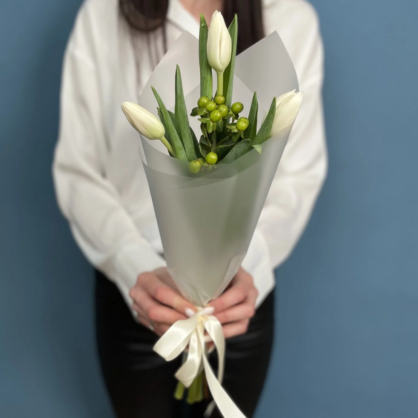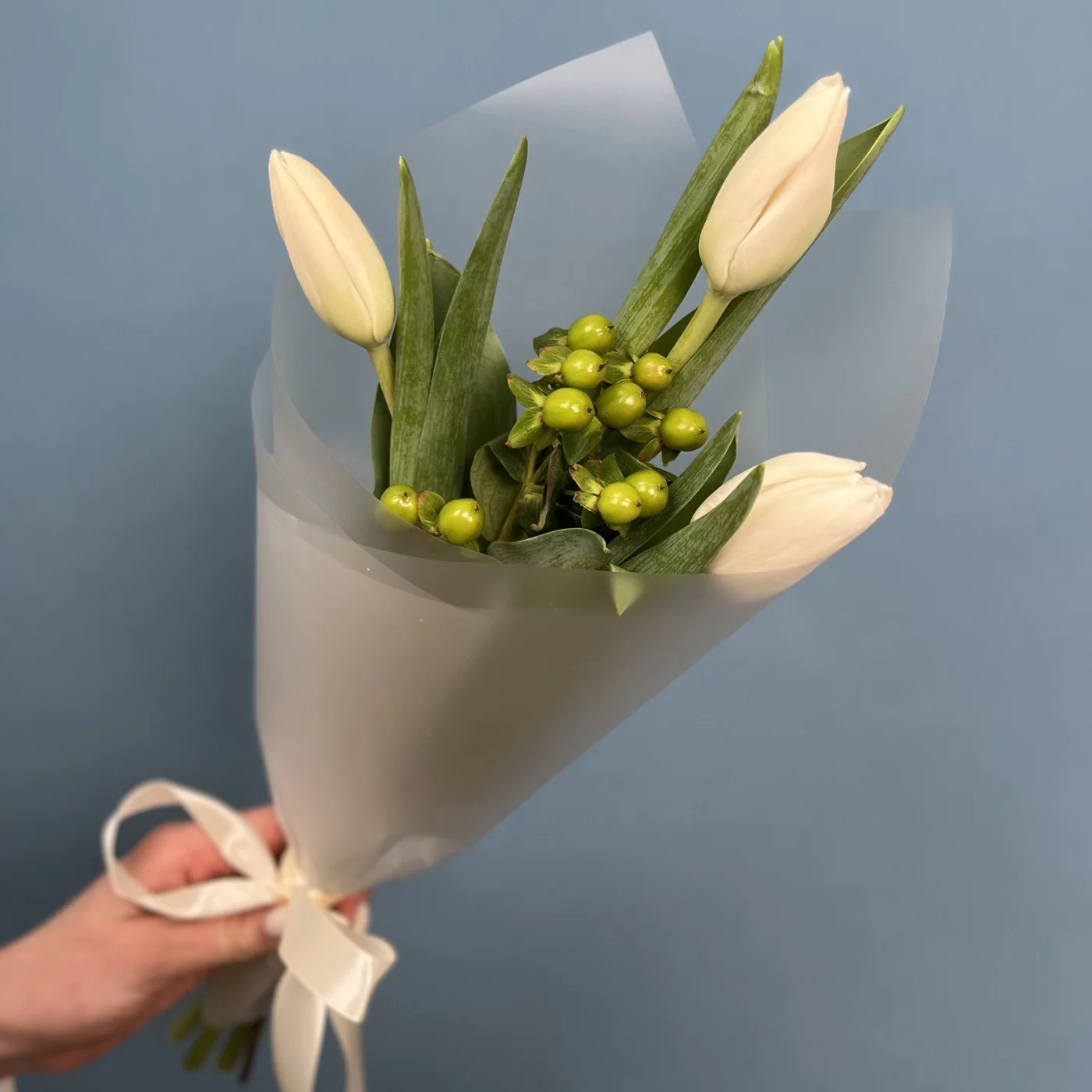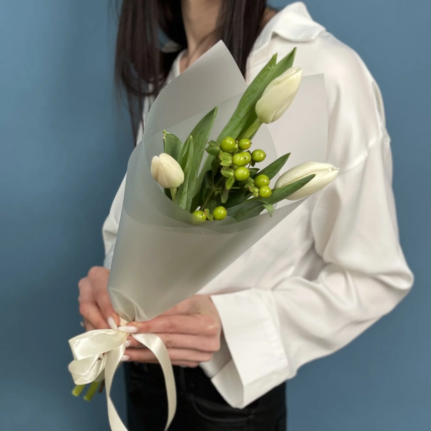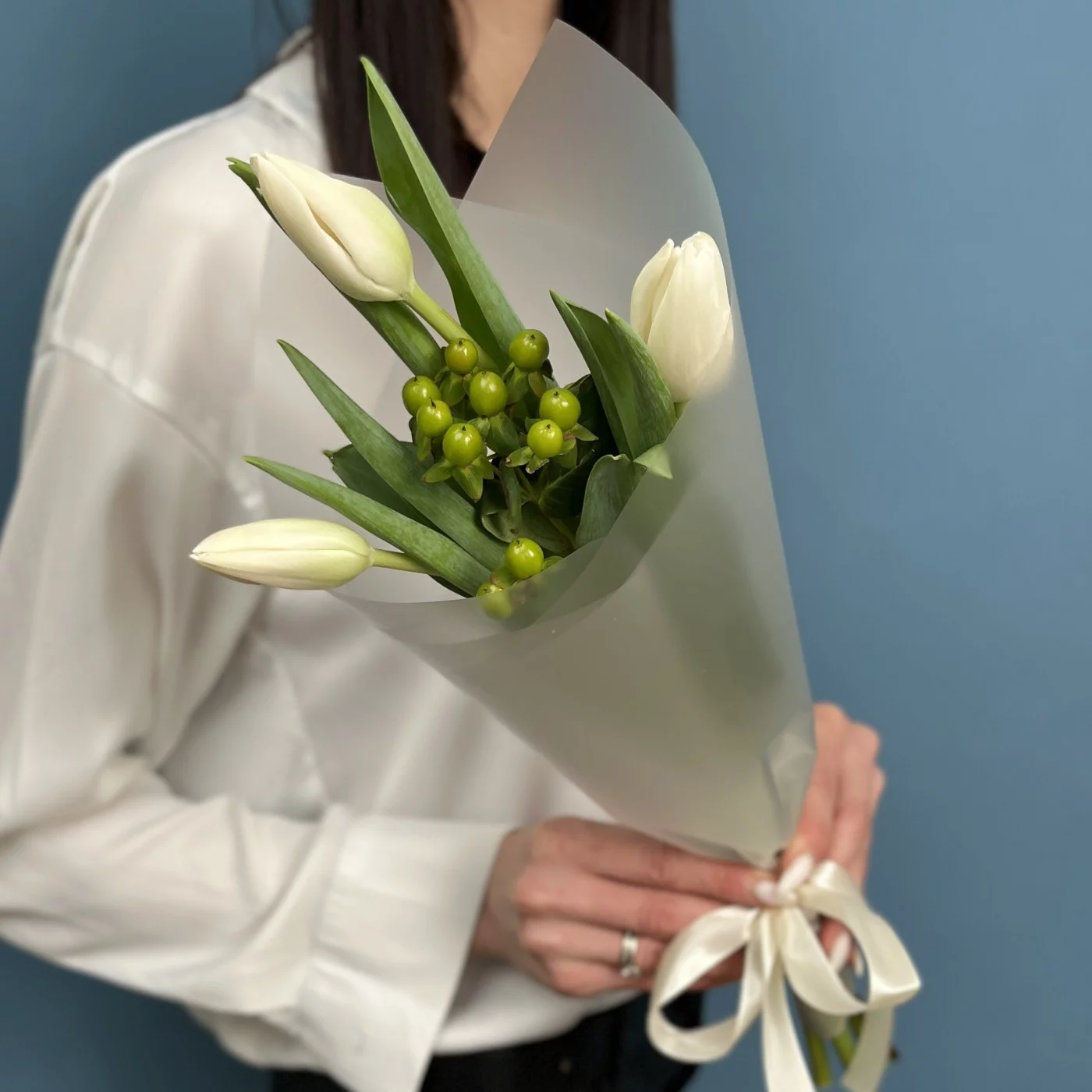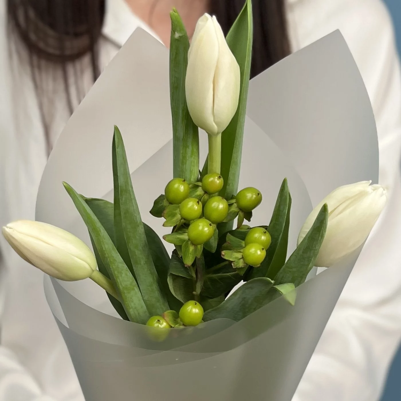 Букет из белых тюльпанов и зеленого гиперикума — это свежая и оригинальная композиция, которая отлично подойдет для различных мероприятий и поводов.