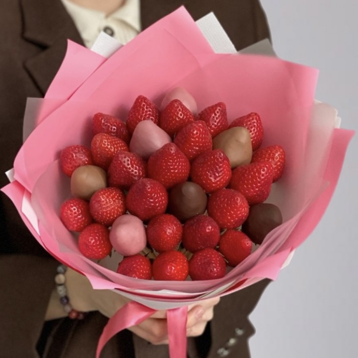 Букет из клубники в белом и молочном шоколаде со свежими ягодами. Очень красивый, вкусный и полезный букет. Универсальный букет который подойдет взрослым и детям. Приятный подарок на день рождения, 14 февраля или 8 марта. Дарите хорошее настроение своим любимым.