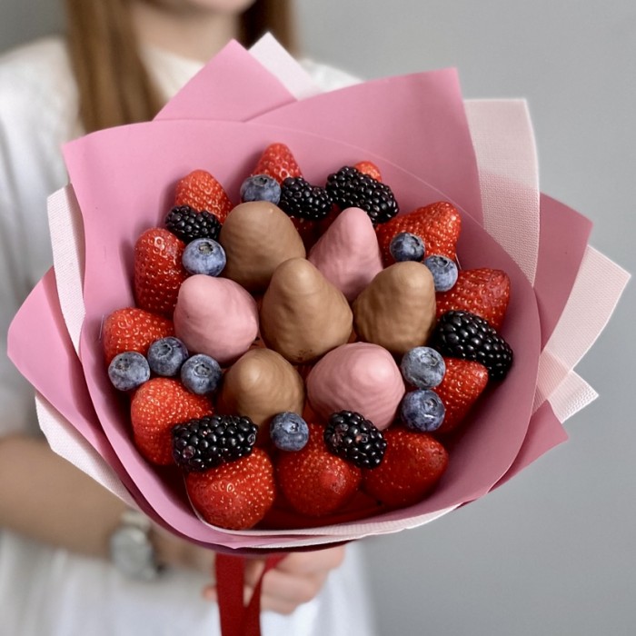 Букет из клубники в молочном и белом шоколаде и свежими ягодами: клубники, глубинки и ежевики. Очень красивый, вкусный и полезный букет. Универсальный букет который подойдет взрослым и детям. Приятный подарок на день рождения, 14 февраля или 8 марта. Дарите хорошее настроение своим любимым.