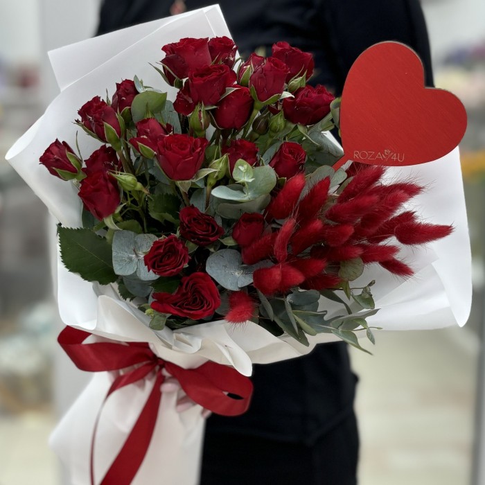 Cостав: роза кустовая красная 5 шт, эвкалипт - 3 шт, лагурус красный - 30 шт, упаковка.