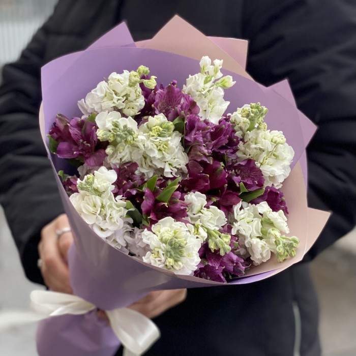 Букет из ароматных маттиол и альстромерий принесет радостное настроение своей получательнице. Эти цветы станут прекрасным комплиментом женской красоте и расскажут о ваших светлых чувствах.