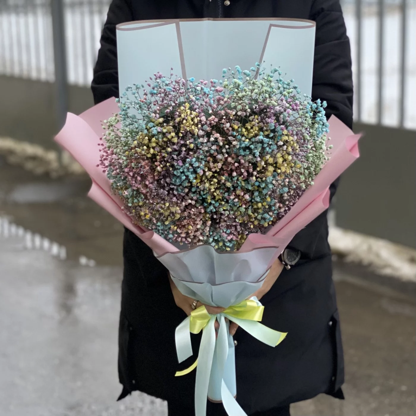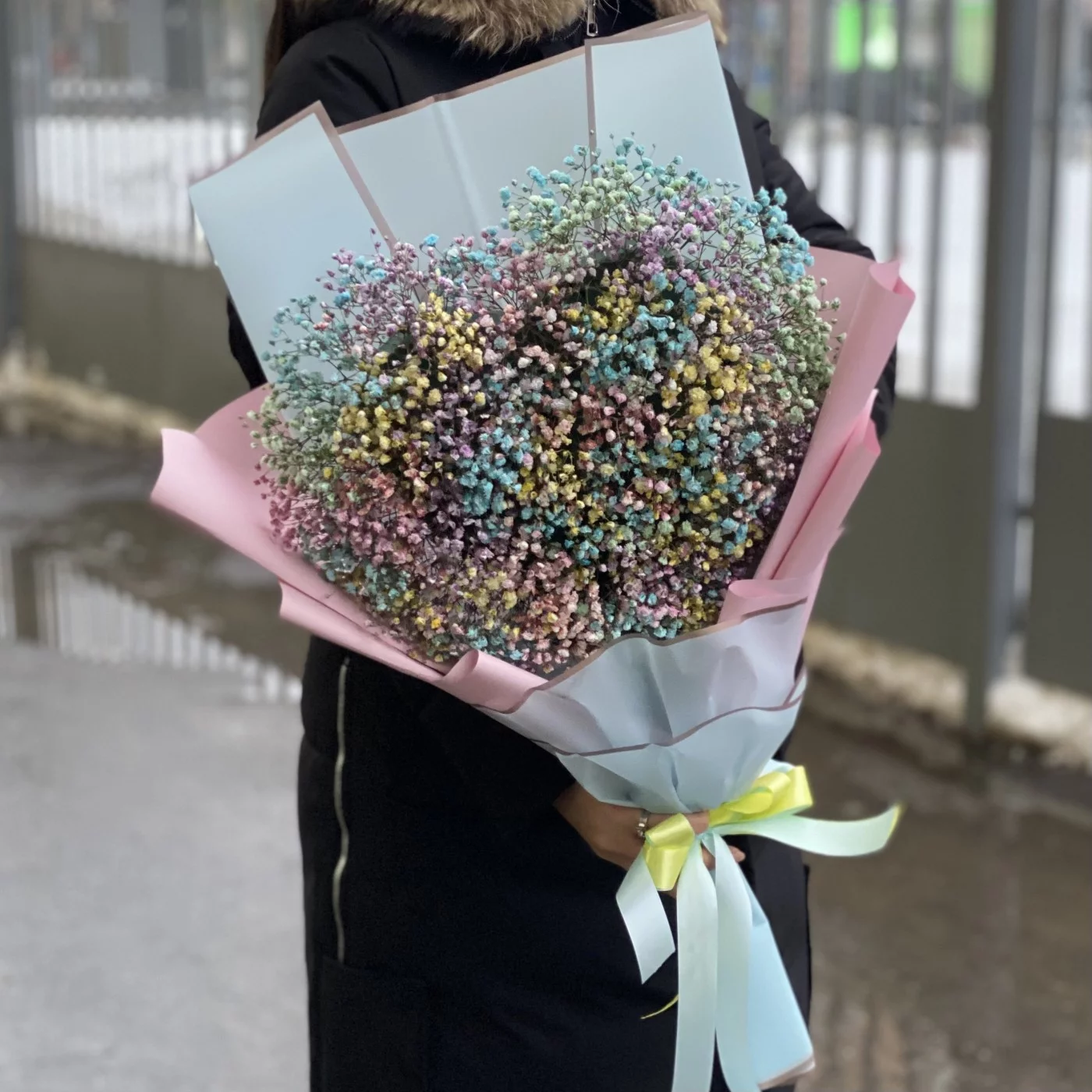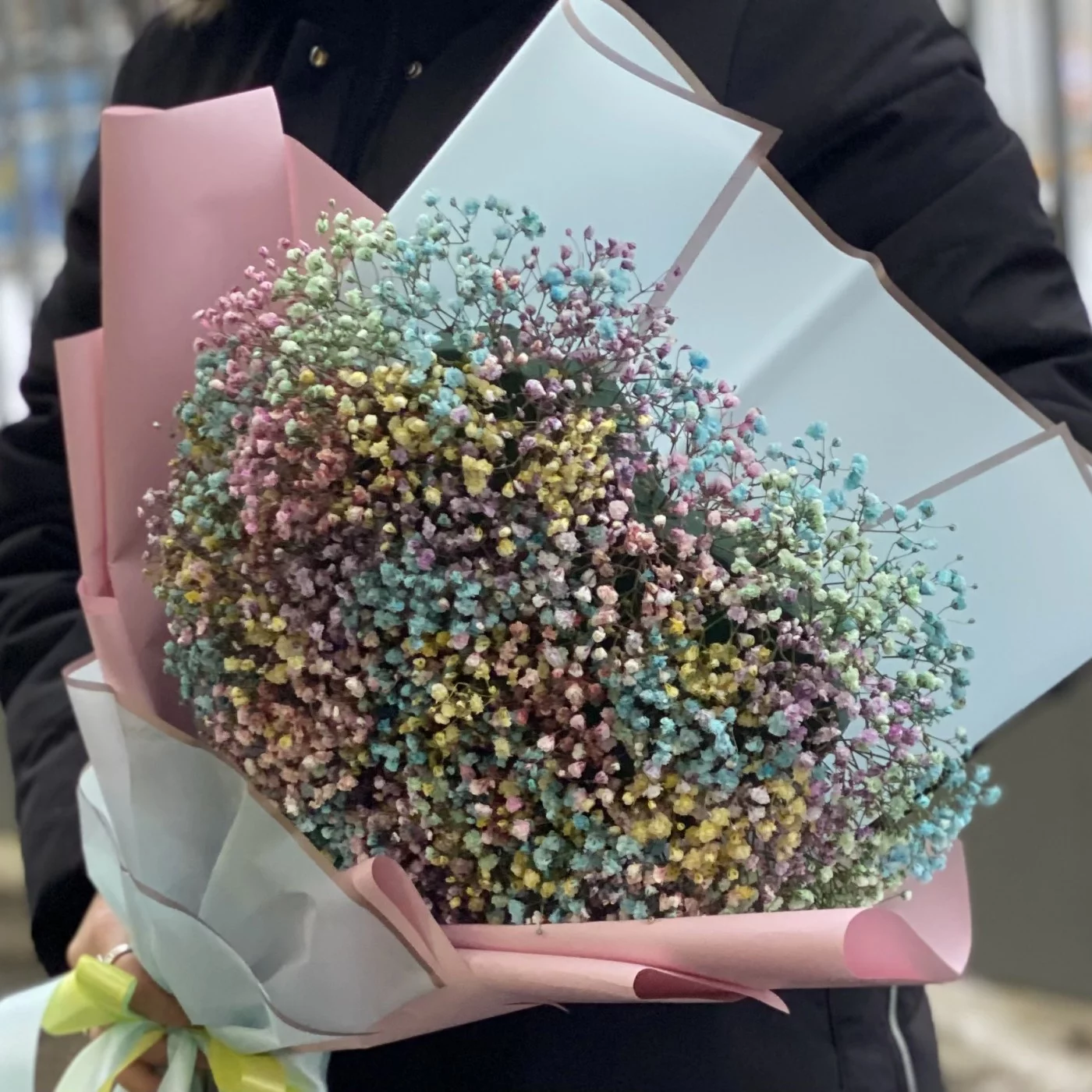 Милый, объемный букет из радужной гипсофилы прекрасен! Дополните букет воздушными разноцветными шарами и покорите сердце девушки на первом свидании или дне рождения.