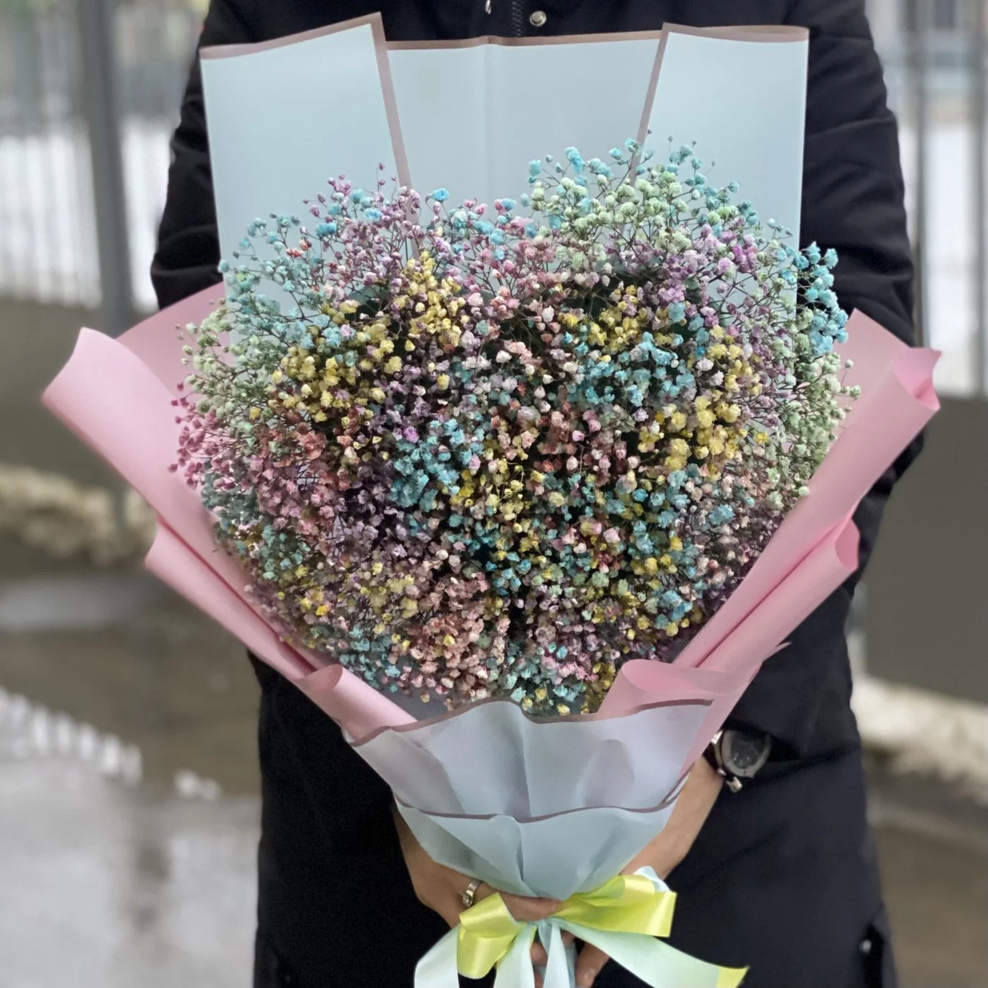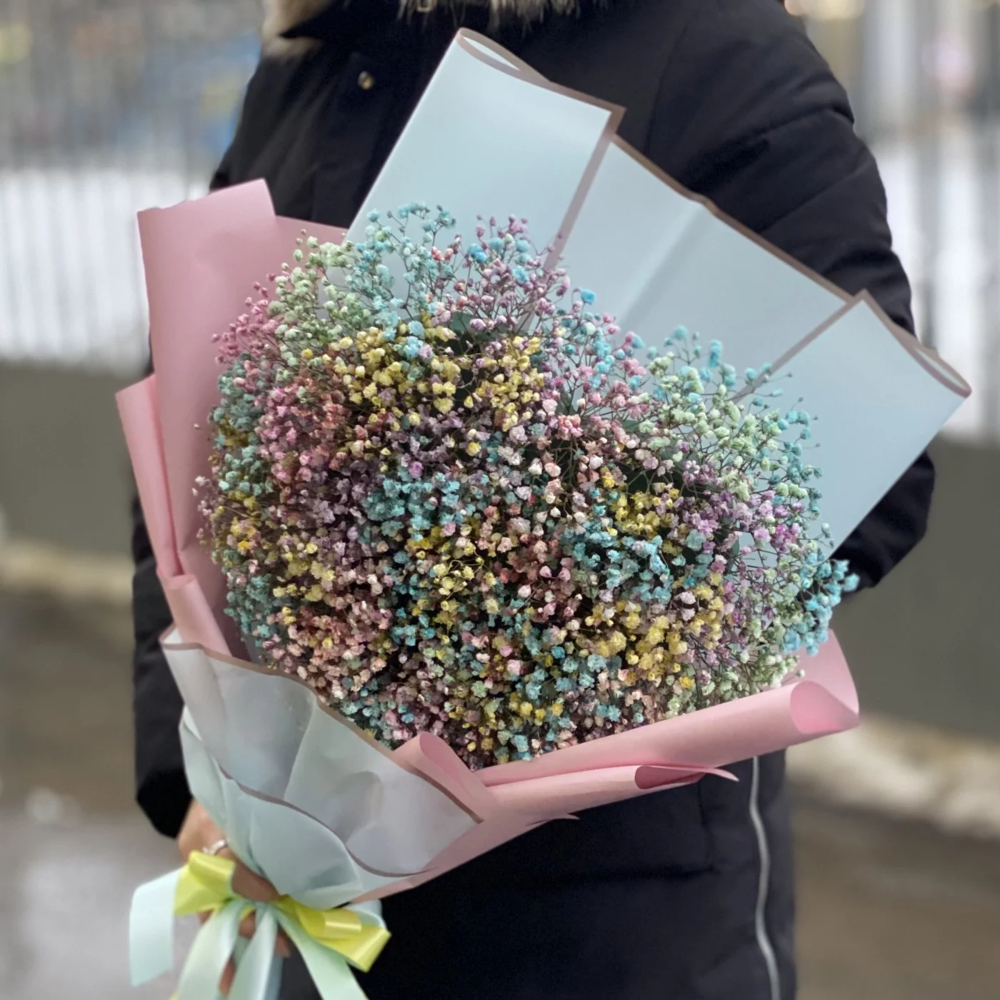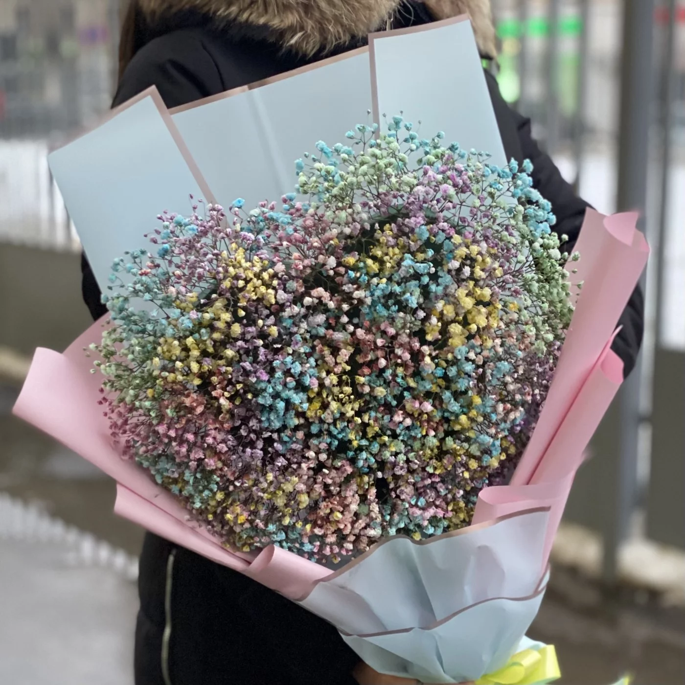 Милый, объемный букет из радужной гипсофилы прекрасен! Дополните букет воздушными разноцветными шарами и покорите сердце девушки на первом свидании или дне рождения.