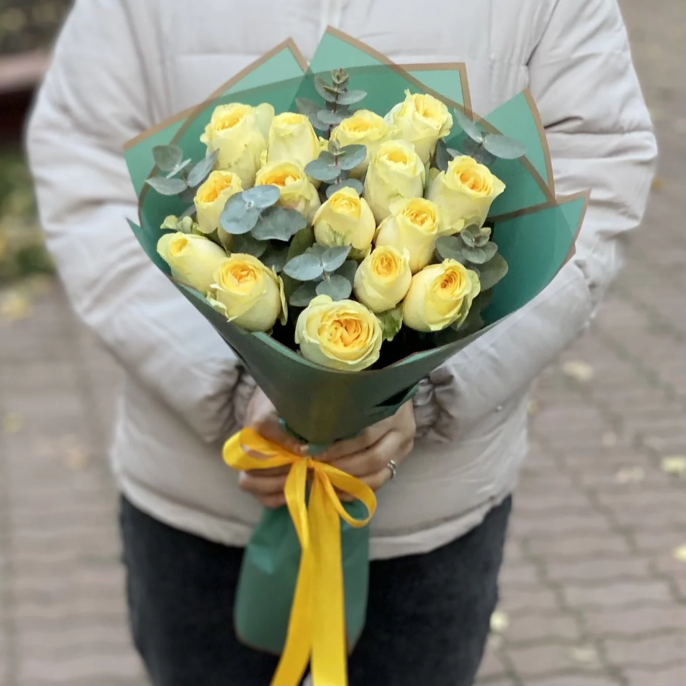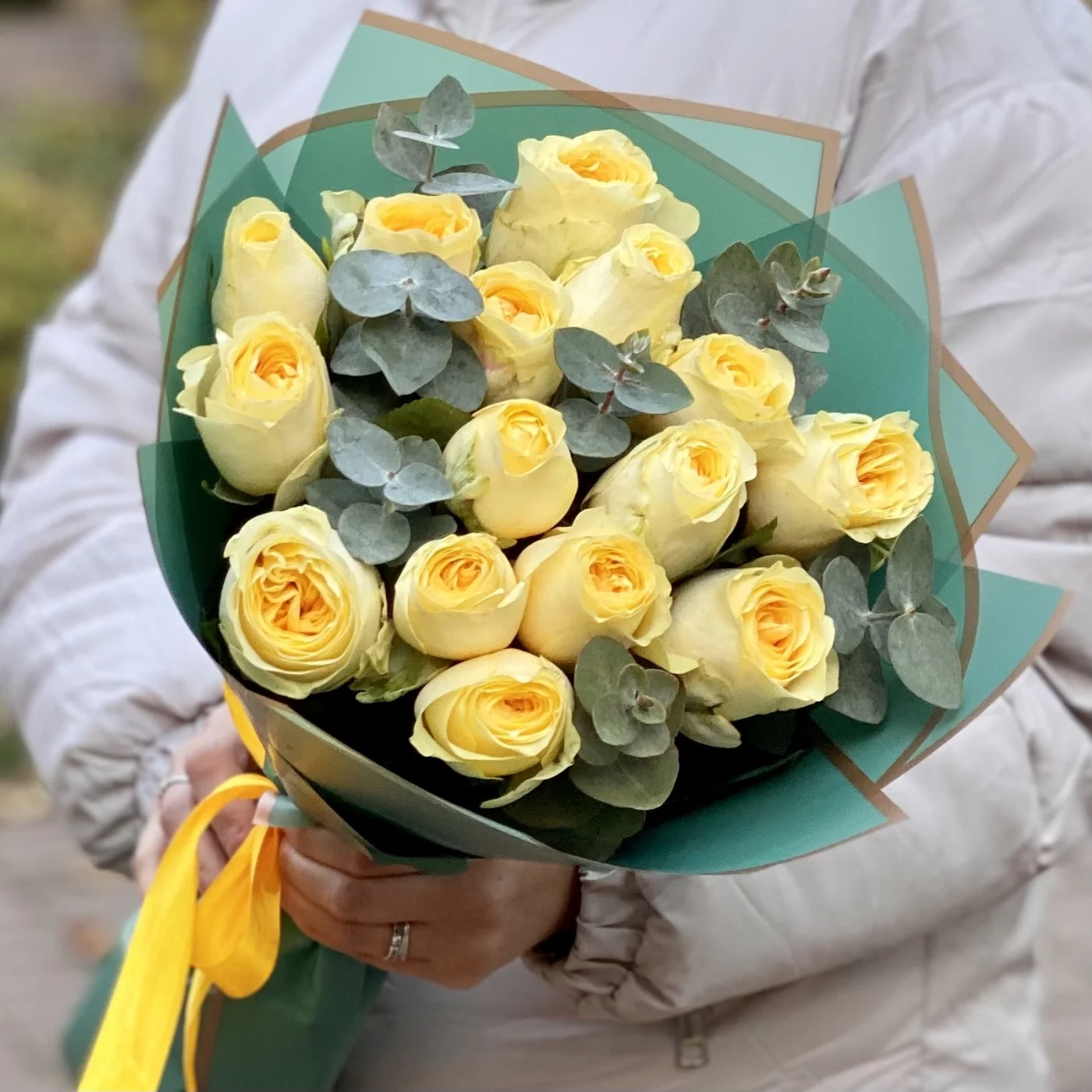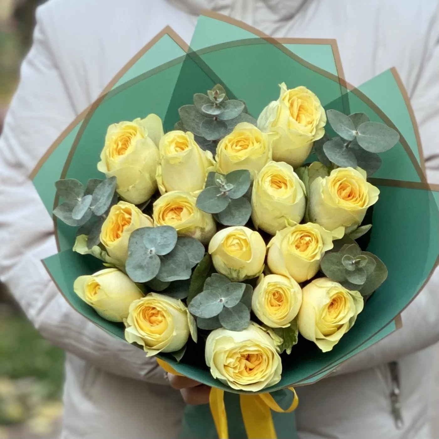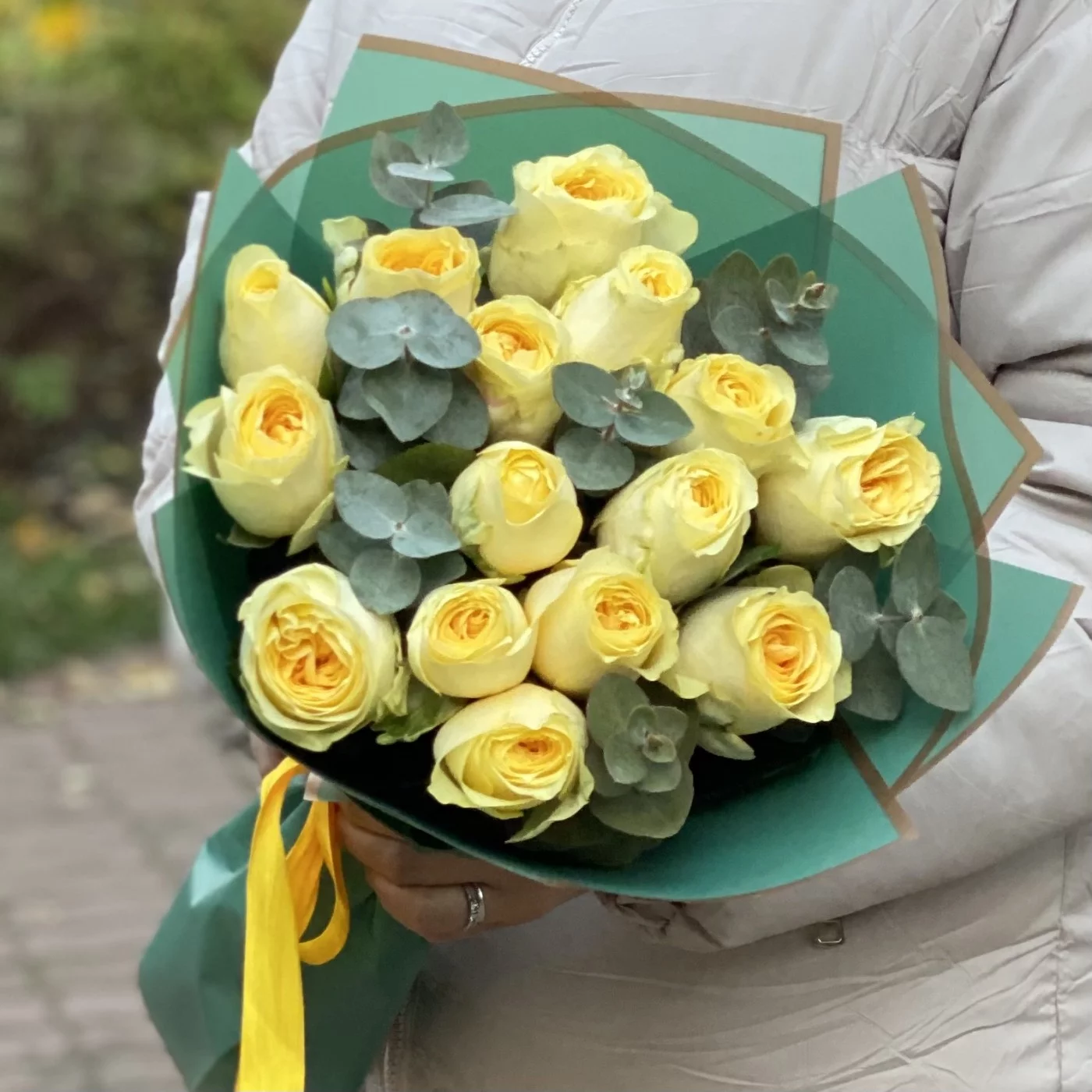 Букет из роз Баттеркап с эвкалиптом 35 см