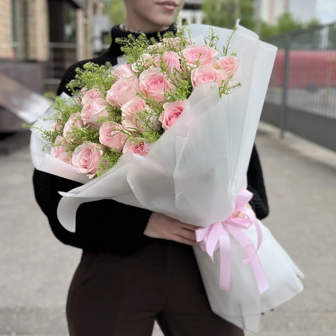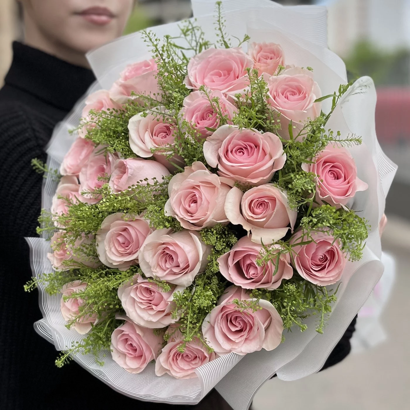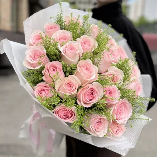 Букет из розовых роз на Жемчужную свадьбу — это изысканный символ любви и нежности, идеально подходящий для этого важного события. Розовые розы олицетворяют гармонию и заботу, а их мягкие оттенки создают атмосферу уюта и романтики. Такой букет станет прекрасным дополнением к празднику, подчеркивая значимость совместной жизни и крепкие чувства. Он оформлен с зелеными акцентами в виде гринбелла, создавая элегантный и стильный образ для этого особенного дня.