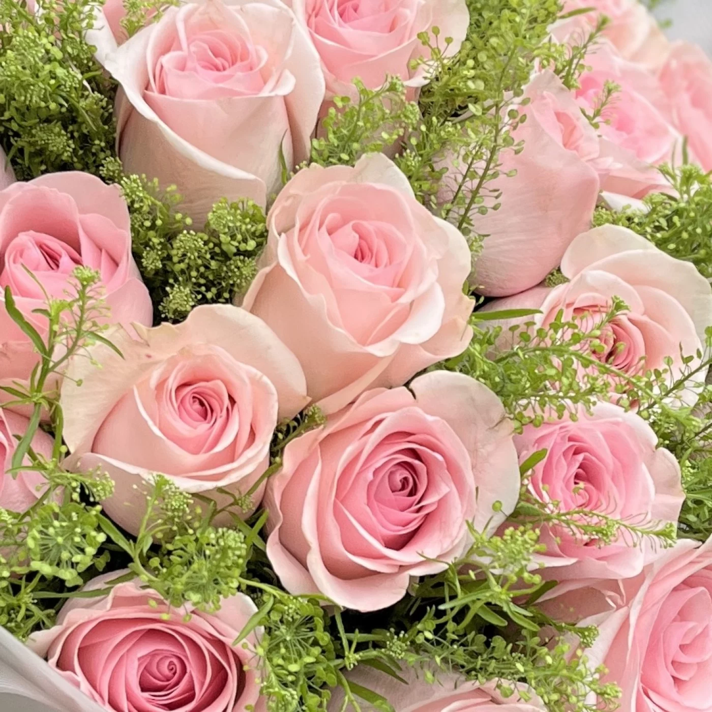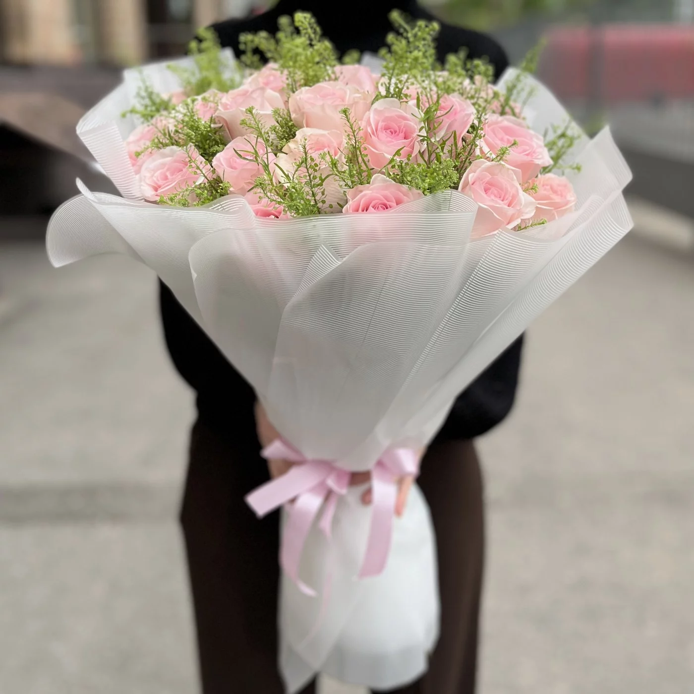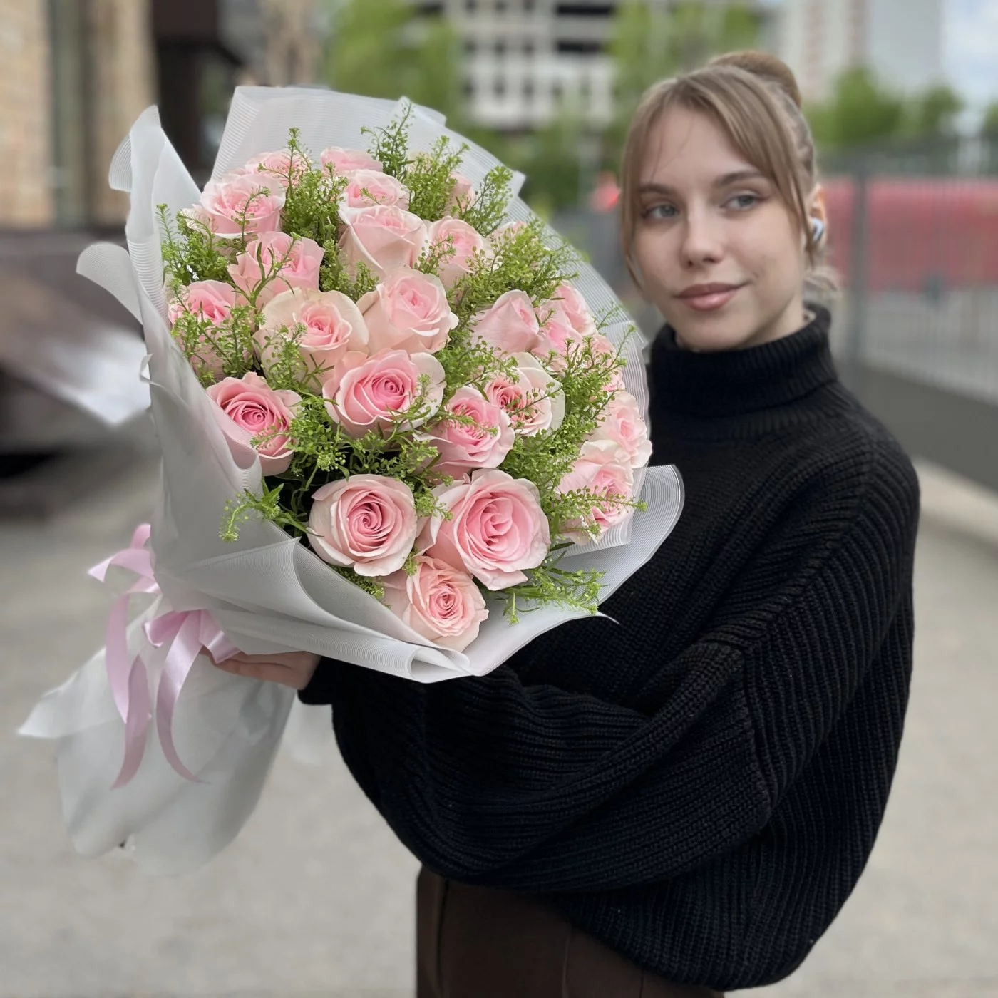 Букет из розовых роз на Жемчужную свадьбу — это изысканный символ любви и нежности, идеально подходящий для этого важного события. Розовые розы олицетворяют гармонию и заботу, а их мягкие оттенки создают атмосферу уюта и романтики. Такой букет станет прекрасным дополнением к празднику, подчеркивая значимость совместной жизни и крепкие чувства. Он оформлен с зелеными акцентами в виде гринбелла, создавая элегантный и стильный образ для этого особенного дня.
