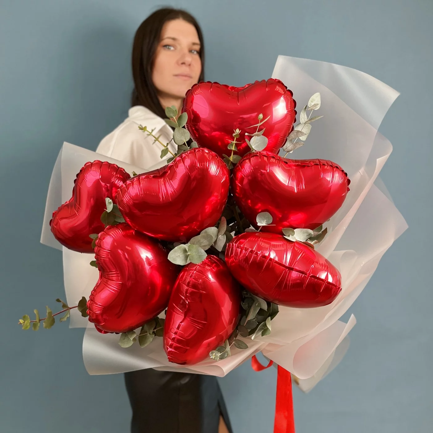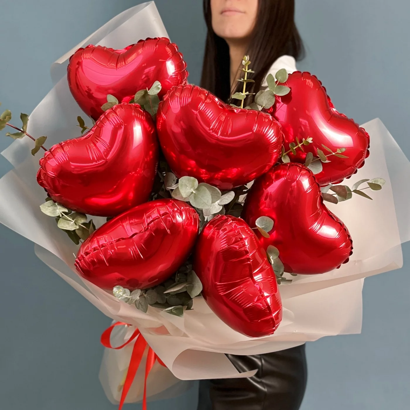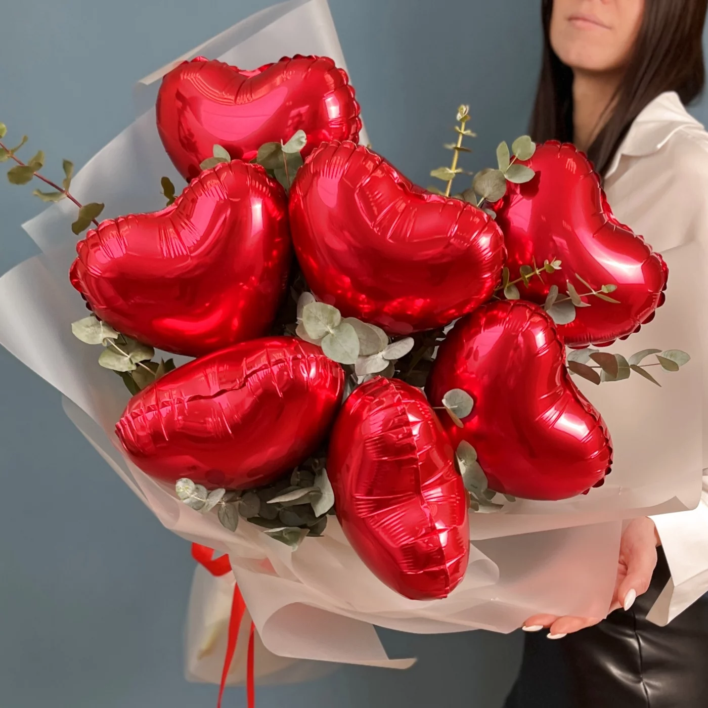 Букет из шаров в форме сердца с эвкалиптом — это стильный и необычный подарок, который сочетает в себе яркость воздушных шаров и свежесть зелени. Такой букет станет отличным дополнением к любому празднику или важному событию.