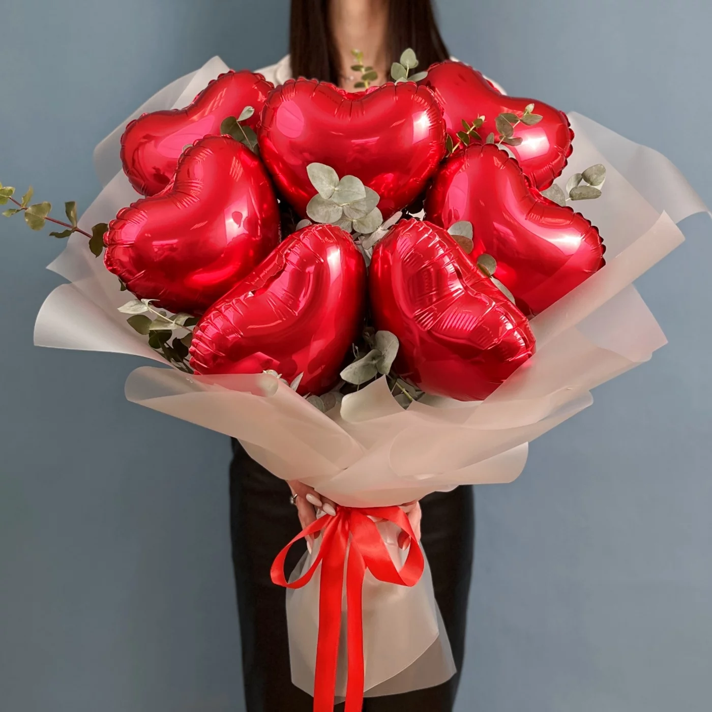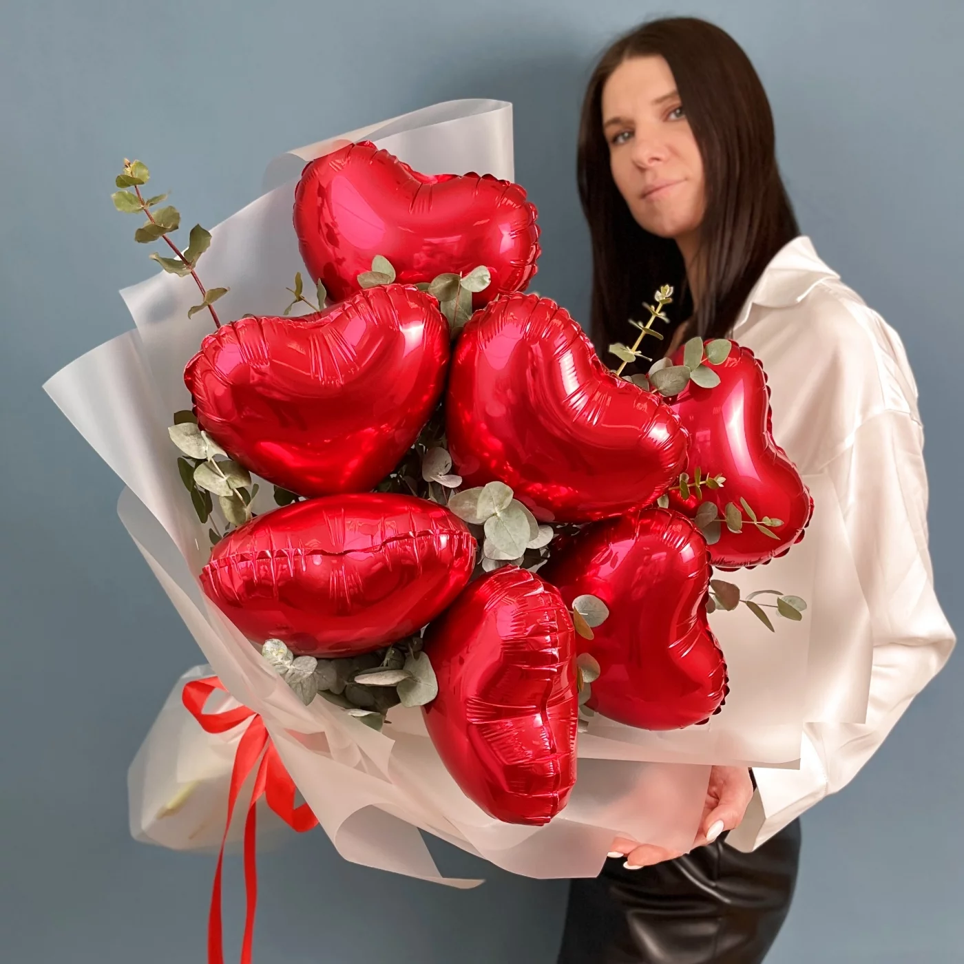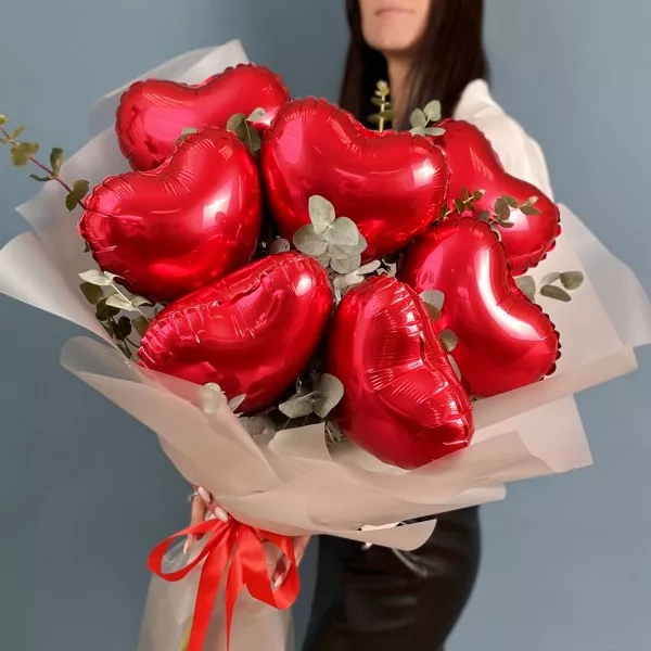 Букет из шаров в форме сердца с эвкалиптом — это стильный и необычный подарок, который сочетает в себе яркость воздушных шаров и свежесть зелени. Такой букет станет отличным дополнением к любому празднику или важному событию.