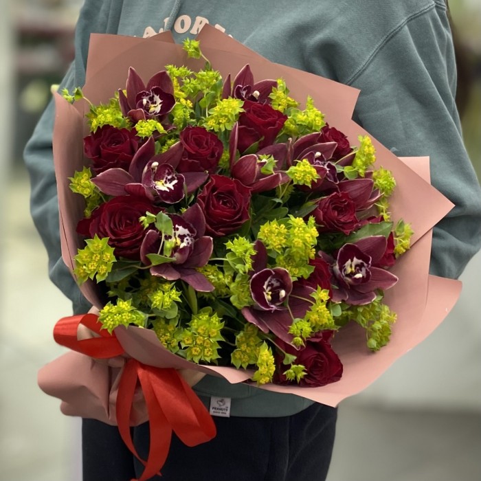 Предлагаем приятно удивить вашего адресата букетом из орхидей шоколадных оттенков. Их изящество изысканно подчеркивают вишневые розы, нежный буплерум, глянцевый писташ. Такой подарок на 23 февраля обязательно запомнится своей оригинальностью. Хотя цветы для мужчины – не совсем обычно, темно-красные розы и орхидеи помогут развеять все мифы! Ваш любимый будет в восторге от такой действительно «мужской» и излучающей силу и мощь композиции.