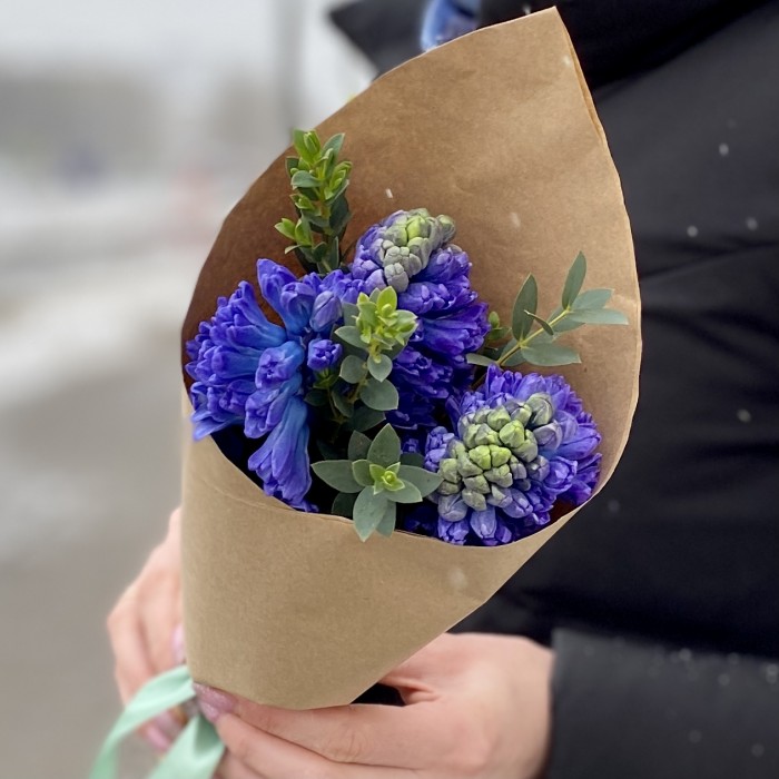 Гиацинты имеют тонкий, сладкий аромат весны. Корпоративный букет из синих гиацинтов и эвкалипта, прекрасно подойдет сотрудницам в качестве знака внимания на 8 марта.