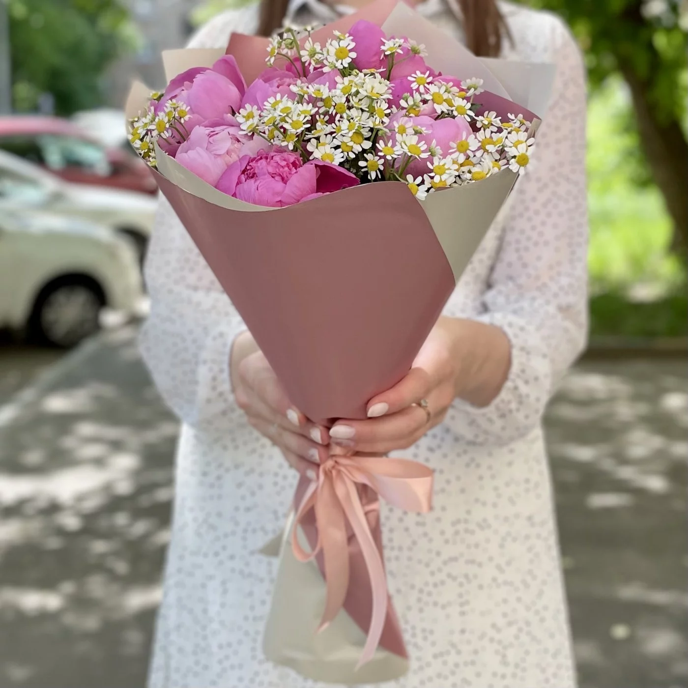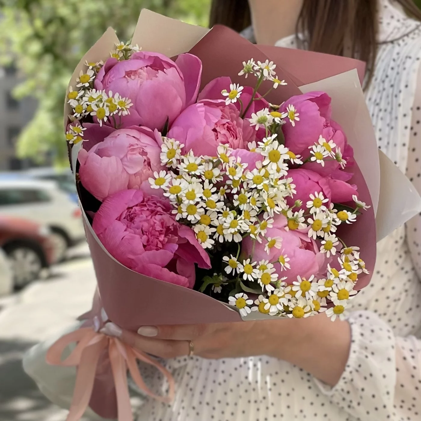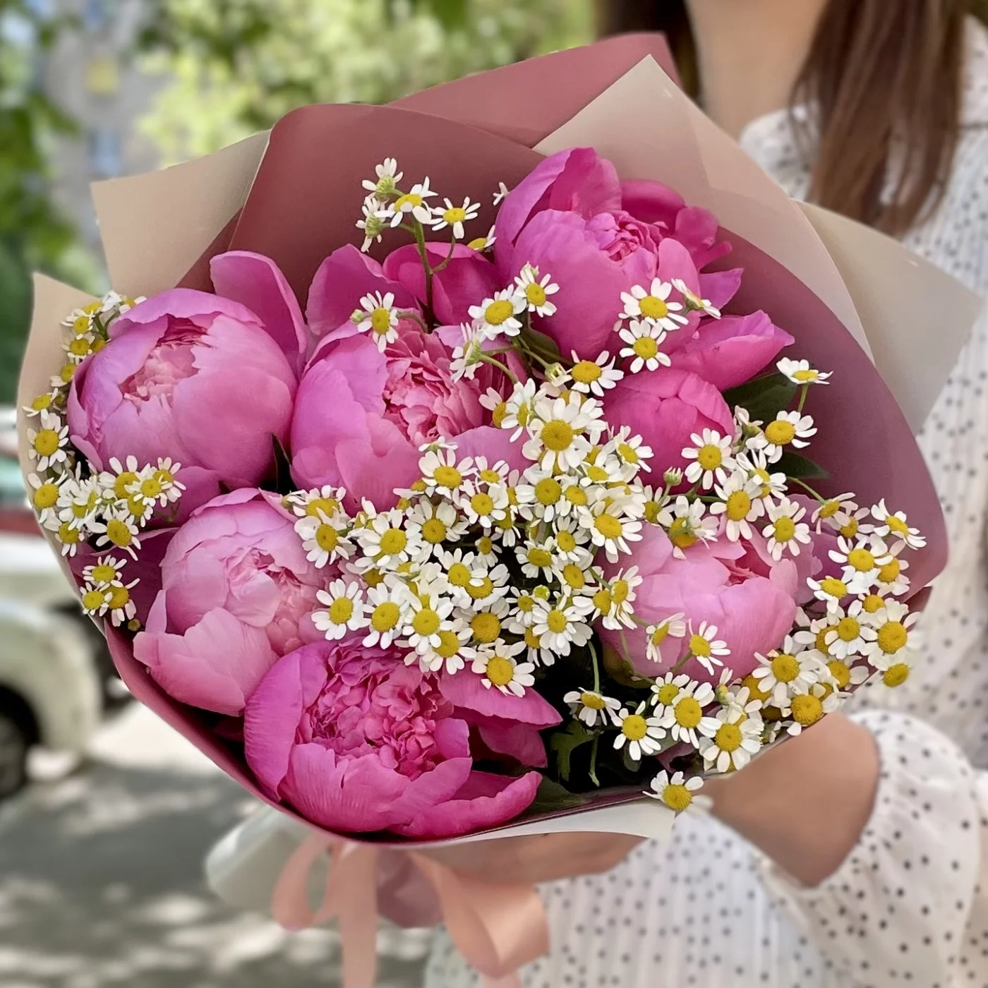 Букет ярко-розовых пионов с ромашками