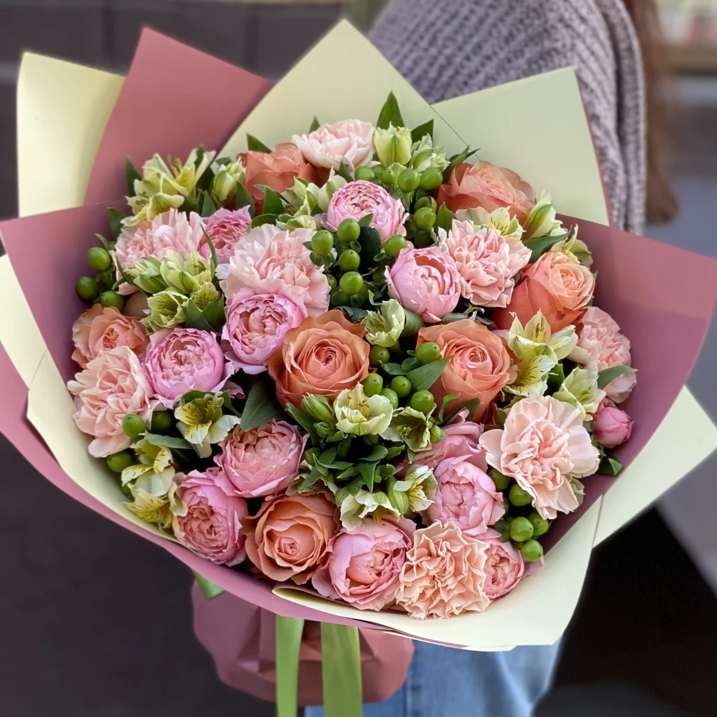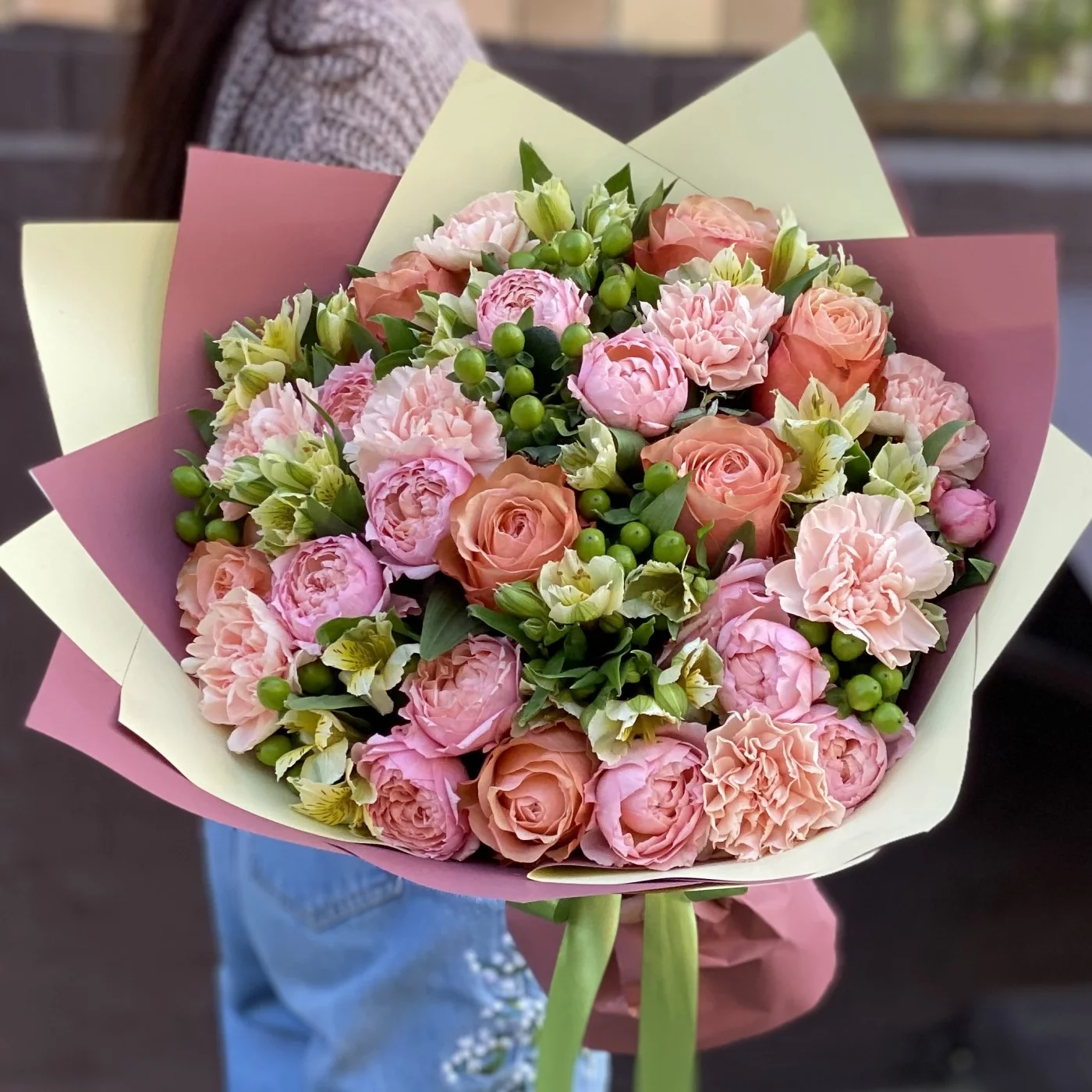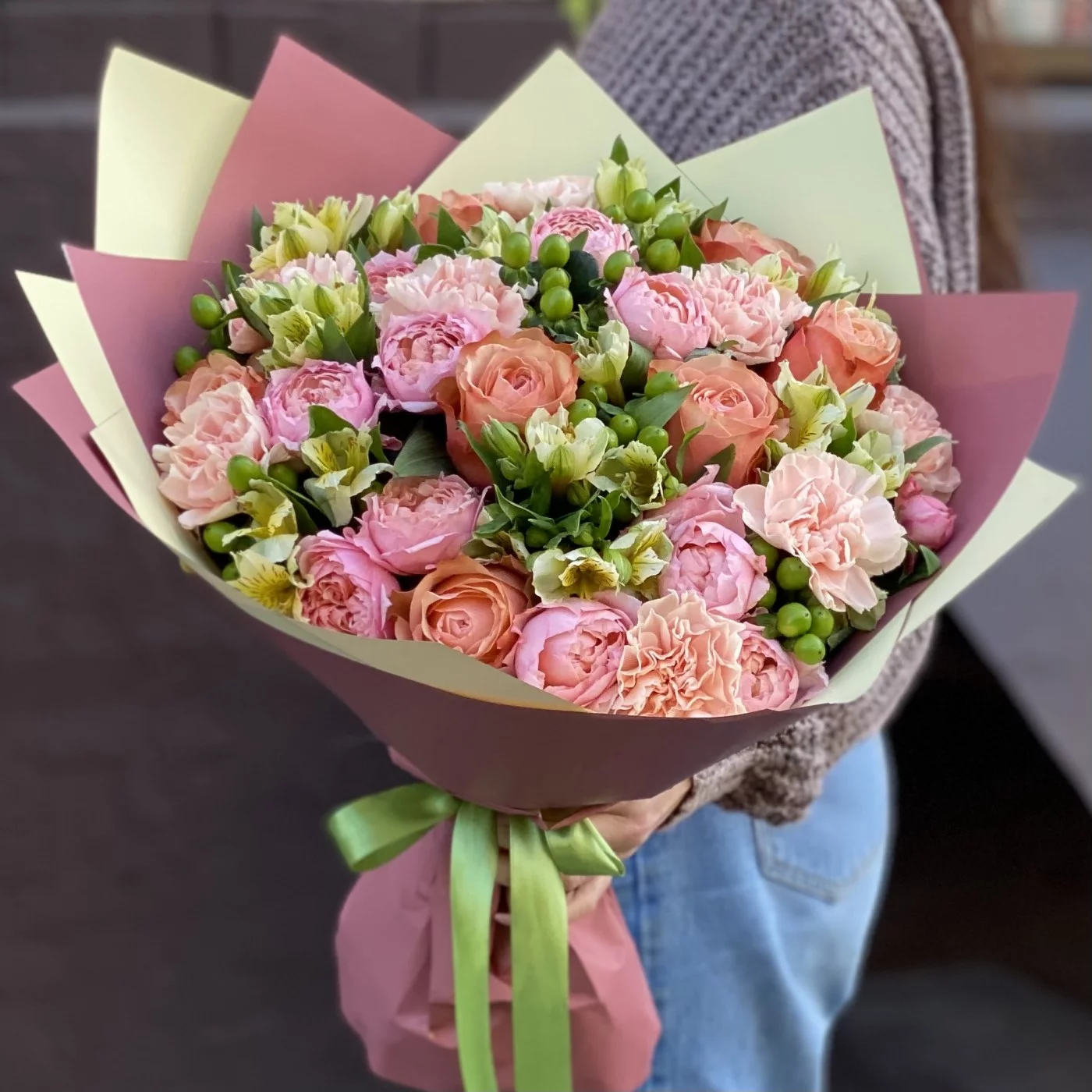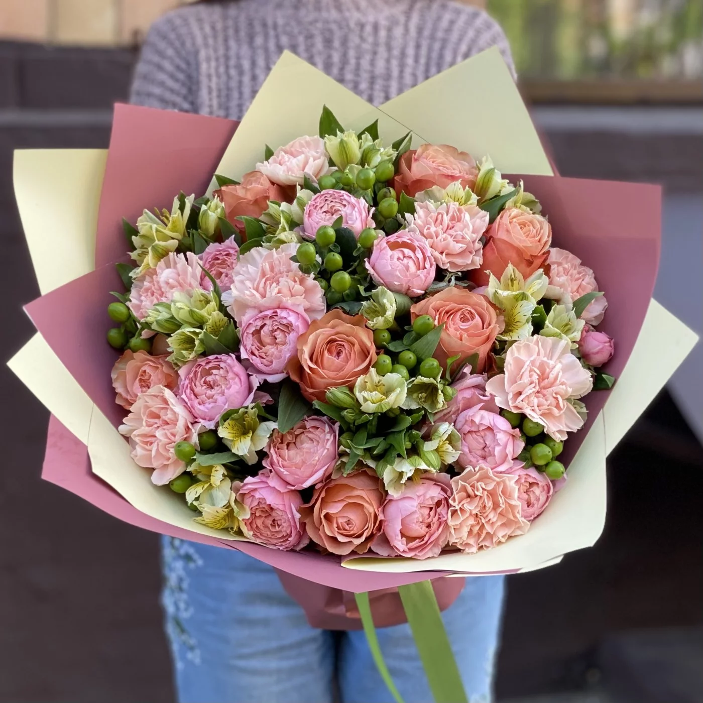 Карамельный букет с пионовидными розами и диантусами. Букет упакован в стильную корейскую пленку.