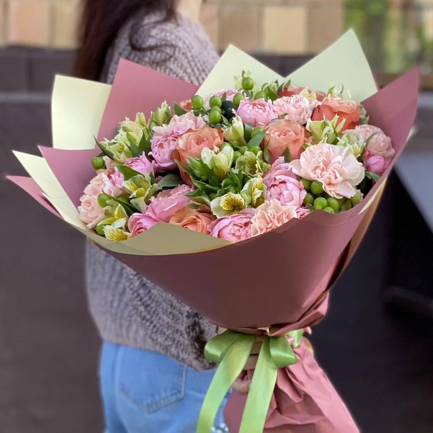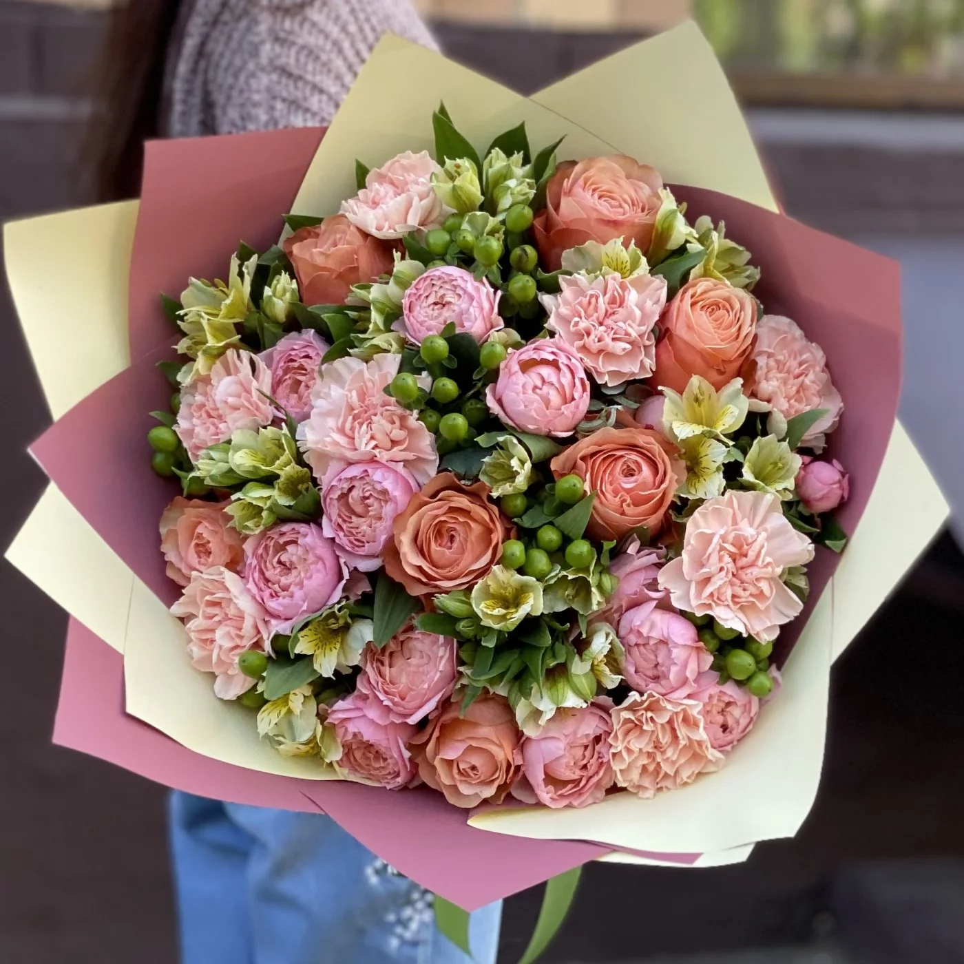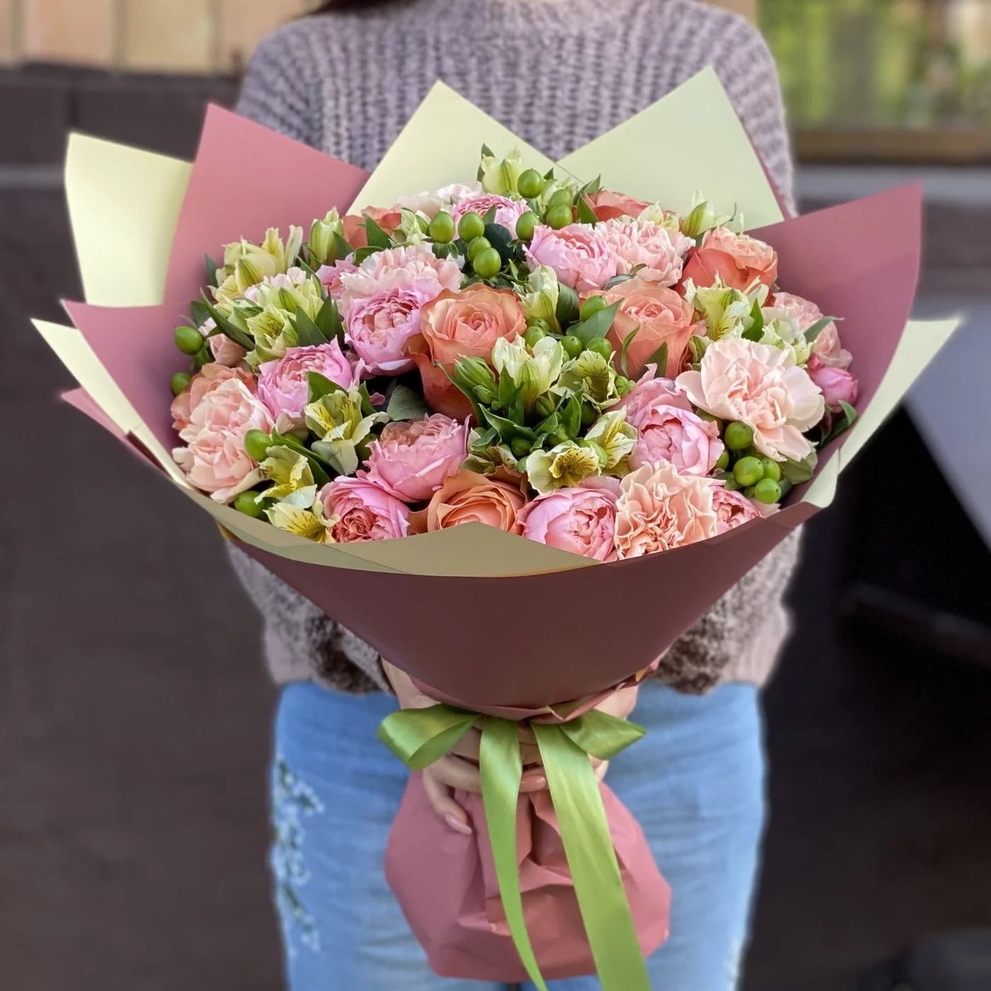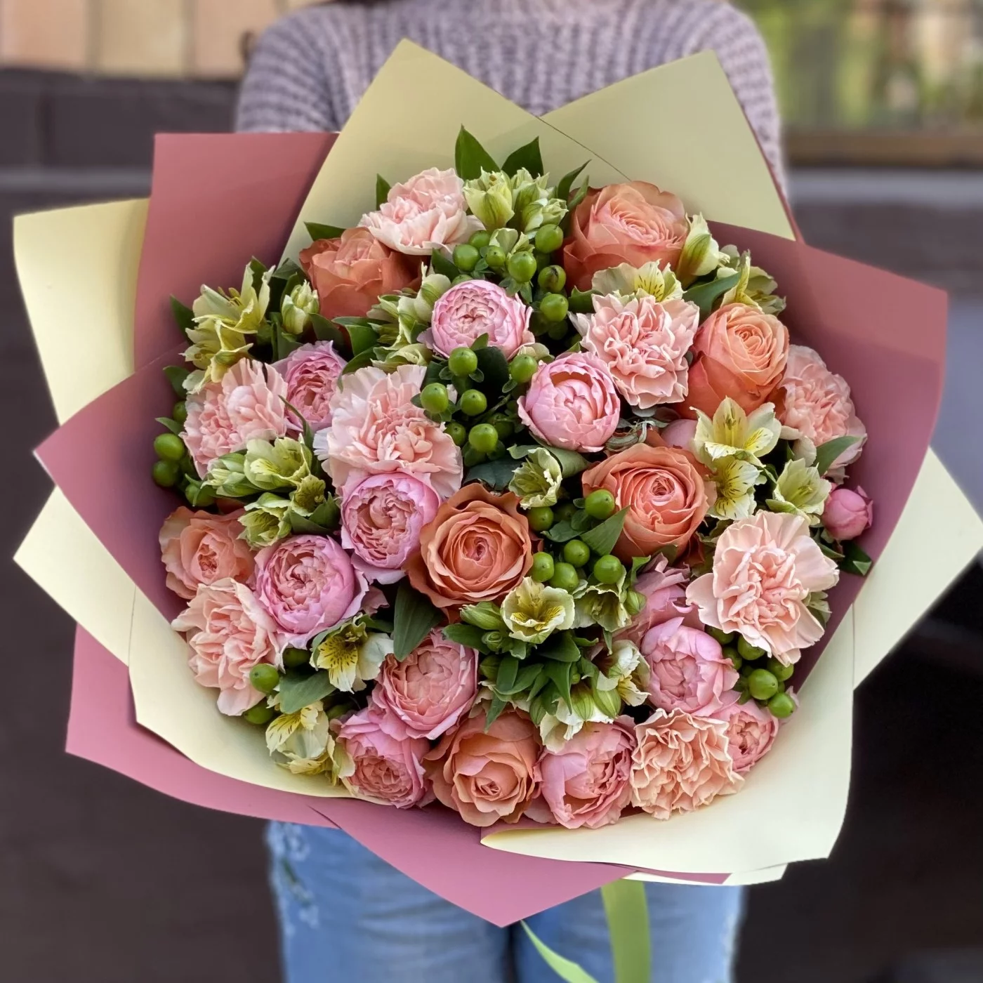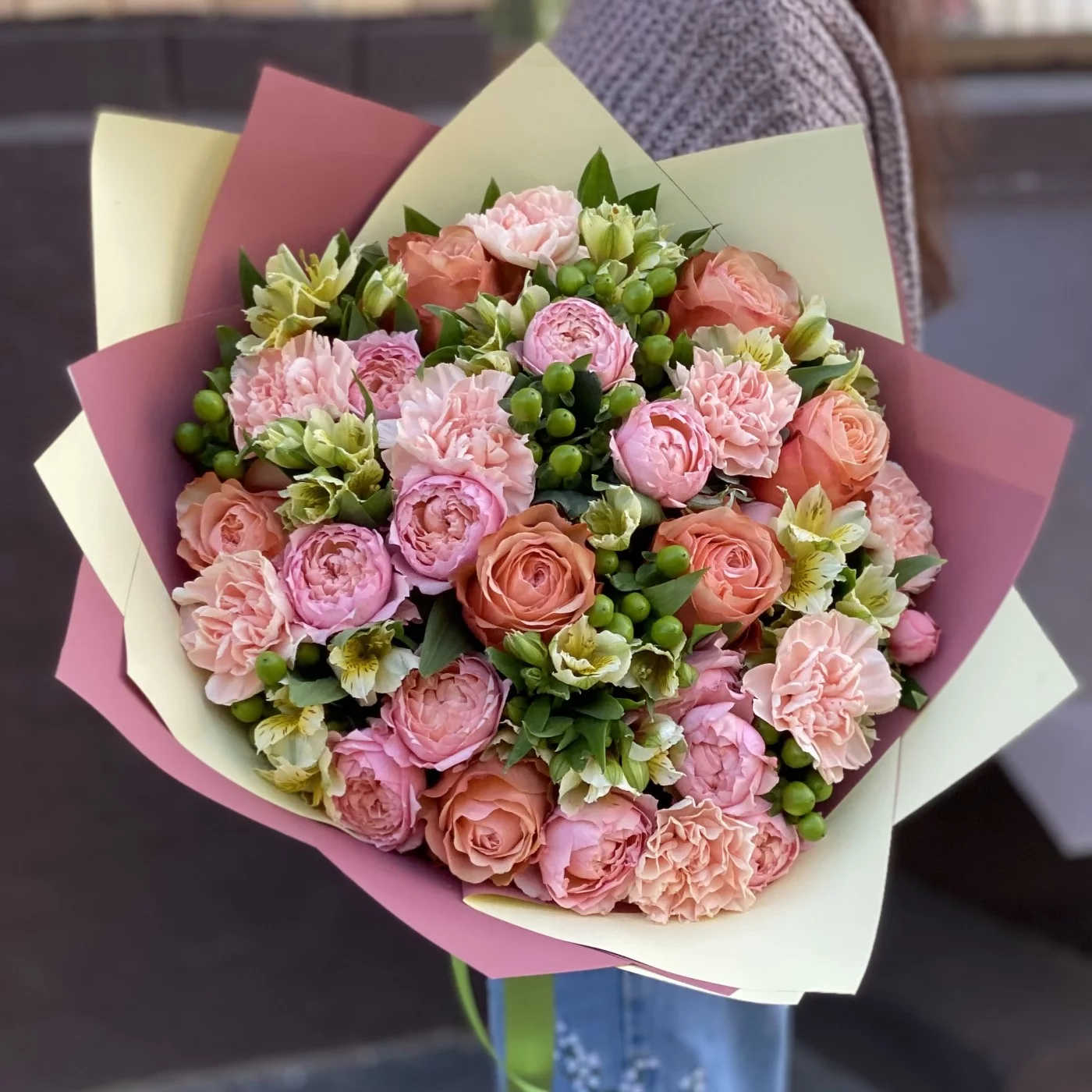 Карамельный букет с пионовидными розами и диантусами. Букет упакован в стильную корейскую пленку.
