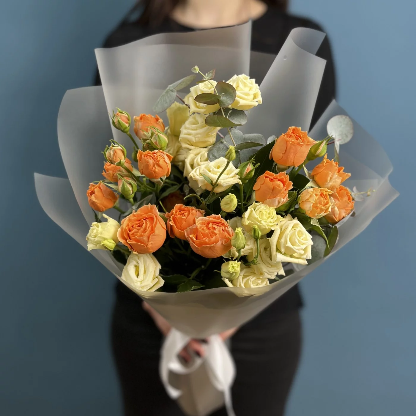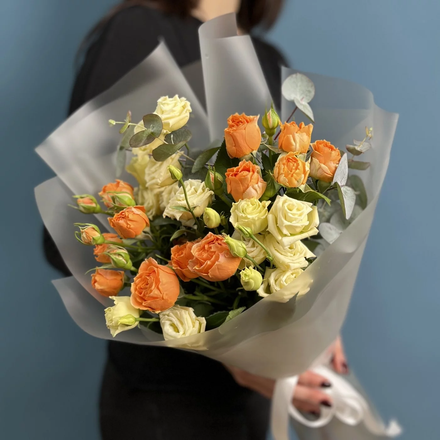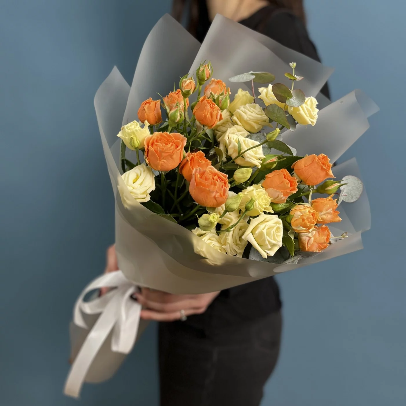 Кремовые эустомы символизируют чистоту и нежность, в то время как розы Коралл Блоссом добавляют яркость и динамичность.