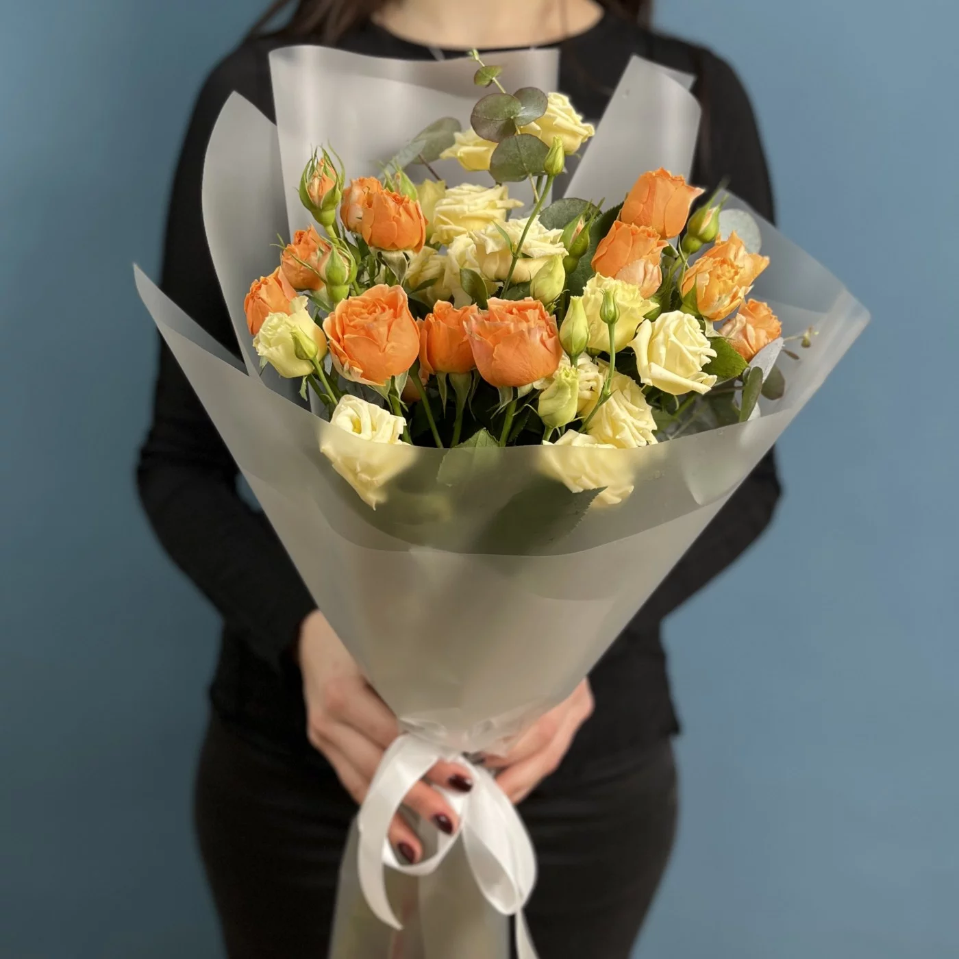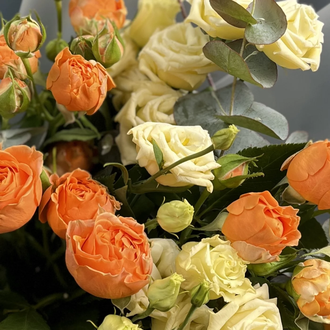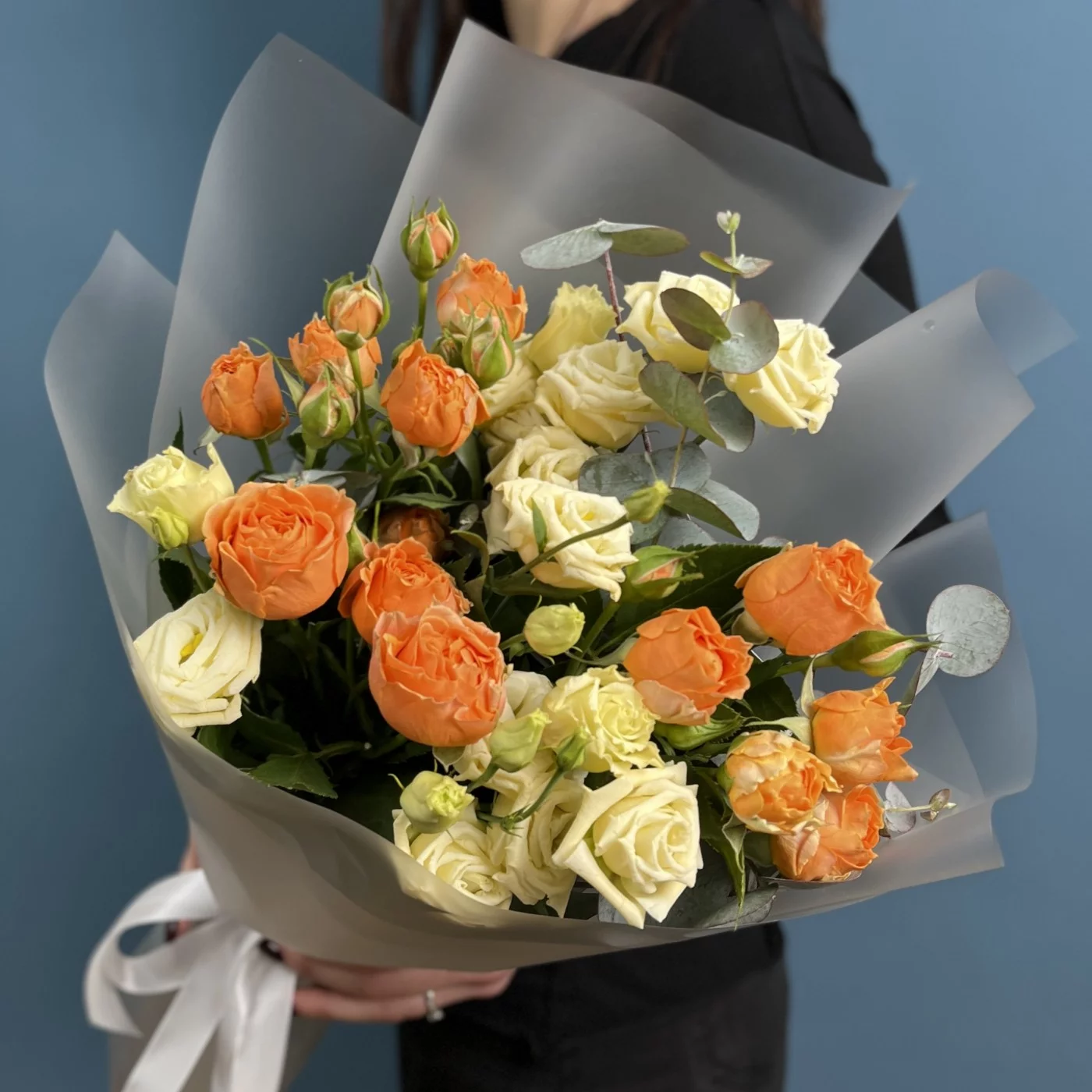 Кремовые эустомы символизируют чистоту и нежность, в то время как розы Коралл Блоссом добавляют яркость и динамичность.