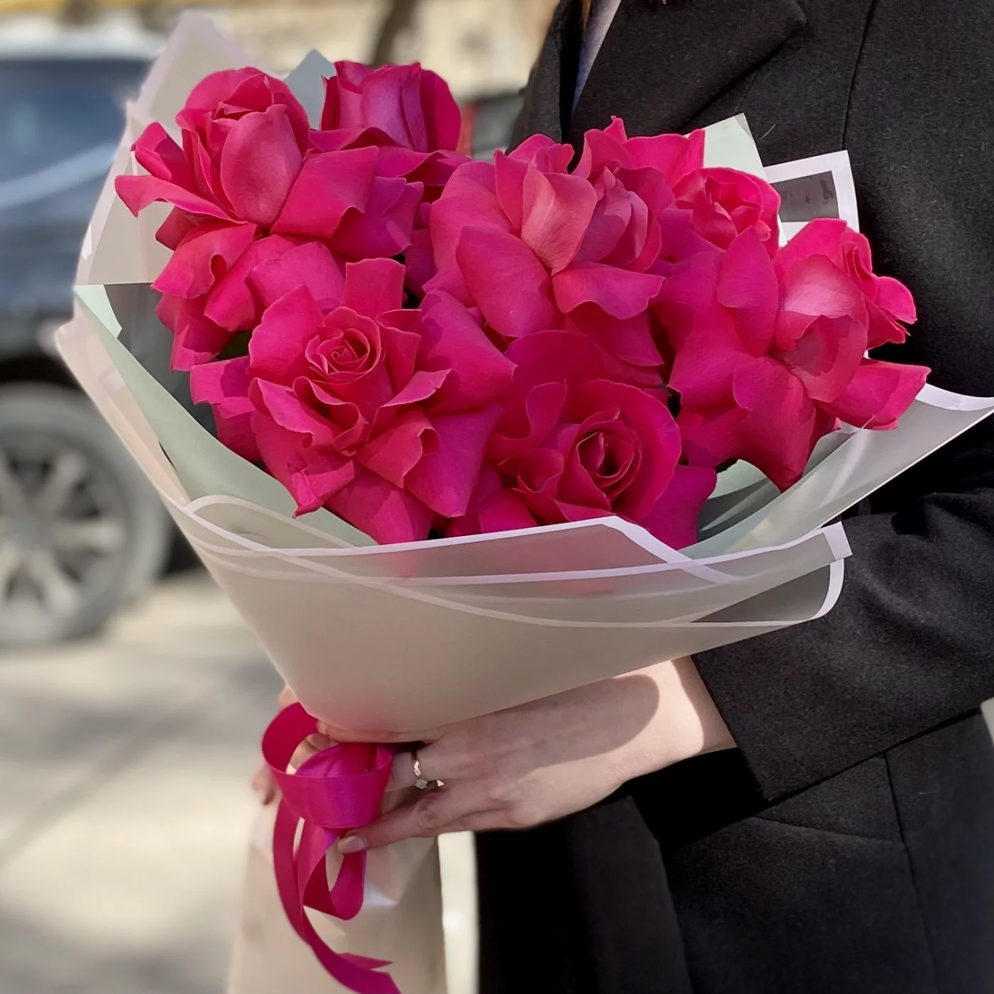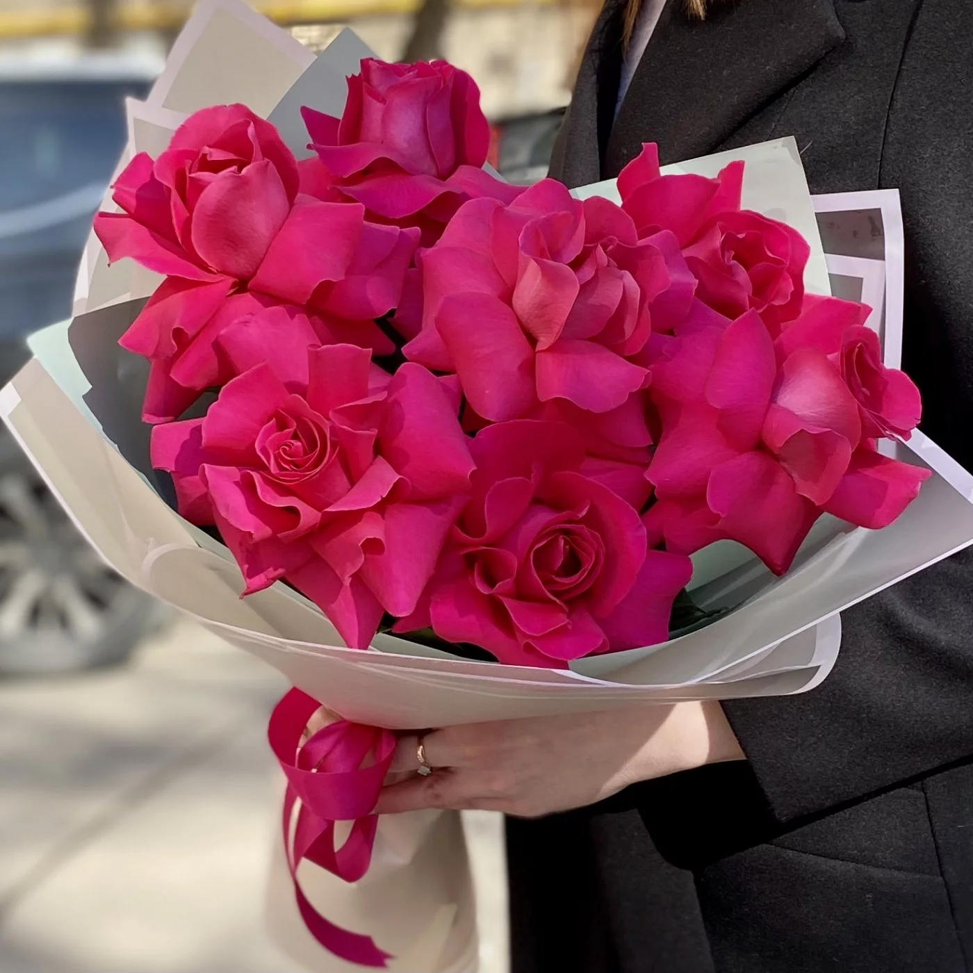 Букет из крупных, малиновых роз сорта Пинк Флоид. Шикарный вариант подарка на любое мероприятие. Розы упакованы в стильную упаковку. Порадуйте получателя прекрасным букетом.