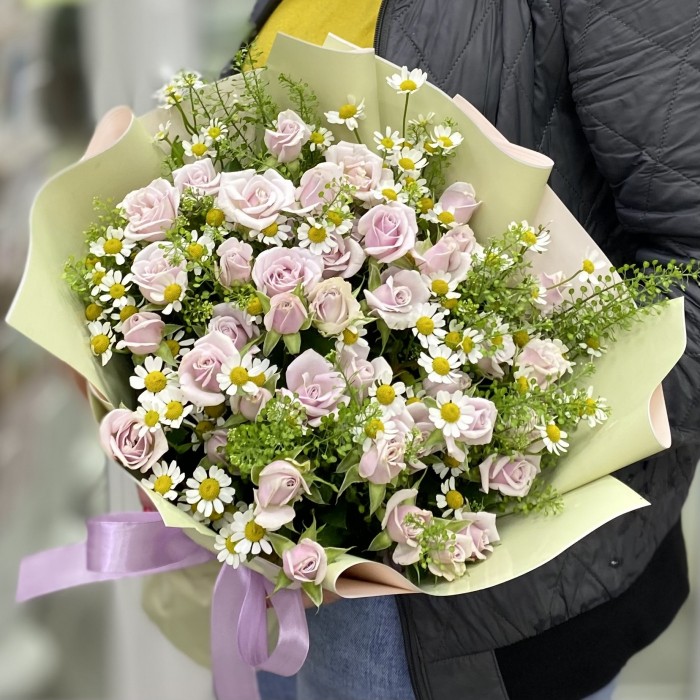 Нежный букет из кустовых роз сорта Сильвер Шедоу с ароматной ромашкой в стильной упаковке.