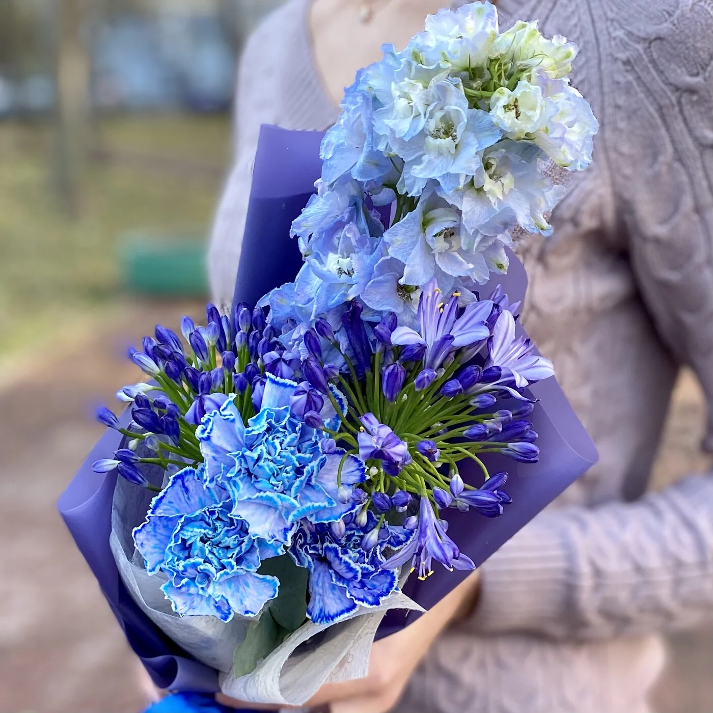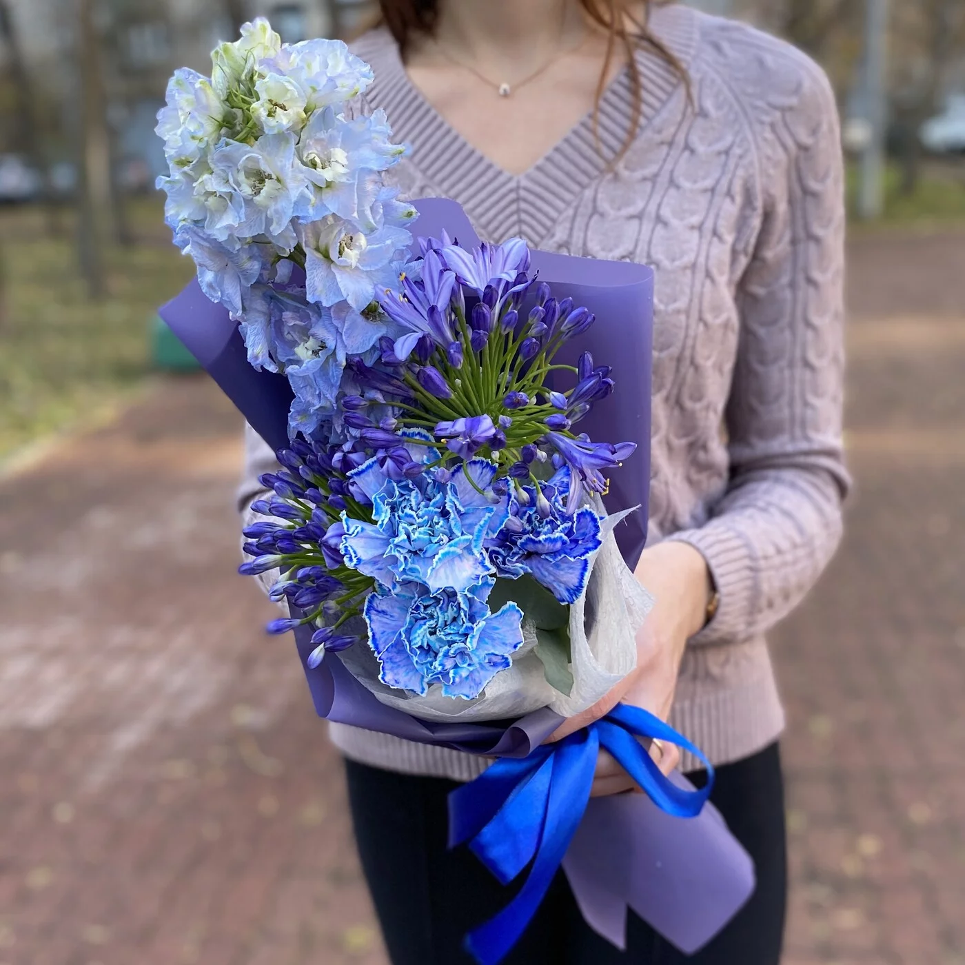 Небольшой детский букет в синих тонах. Такой букет подойдет мальчику на день рождения, в подарок учителю или в качестве комплимента дорогому человеку. Необычная цветовая гамма и стильная упаковка.