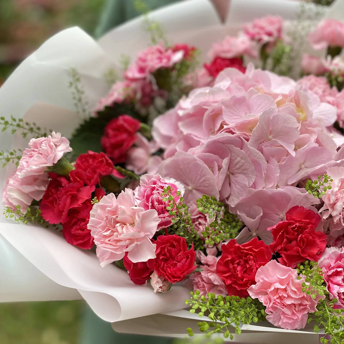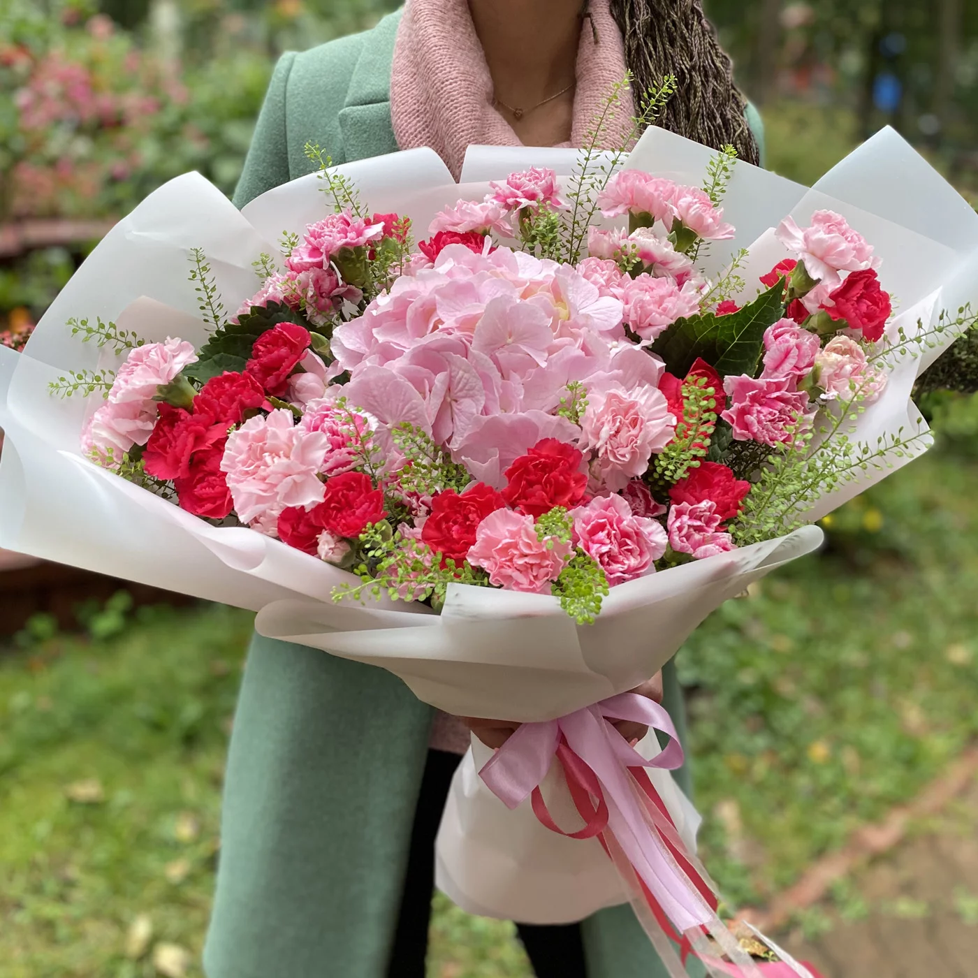 Необыкновенный, яркий, объемный букет с безупречной гортензией и милейшей кустовой гвоздикой – то, что нужно, чтобы порадовать именинницу в день рождения или прийти на первое свидание.