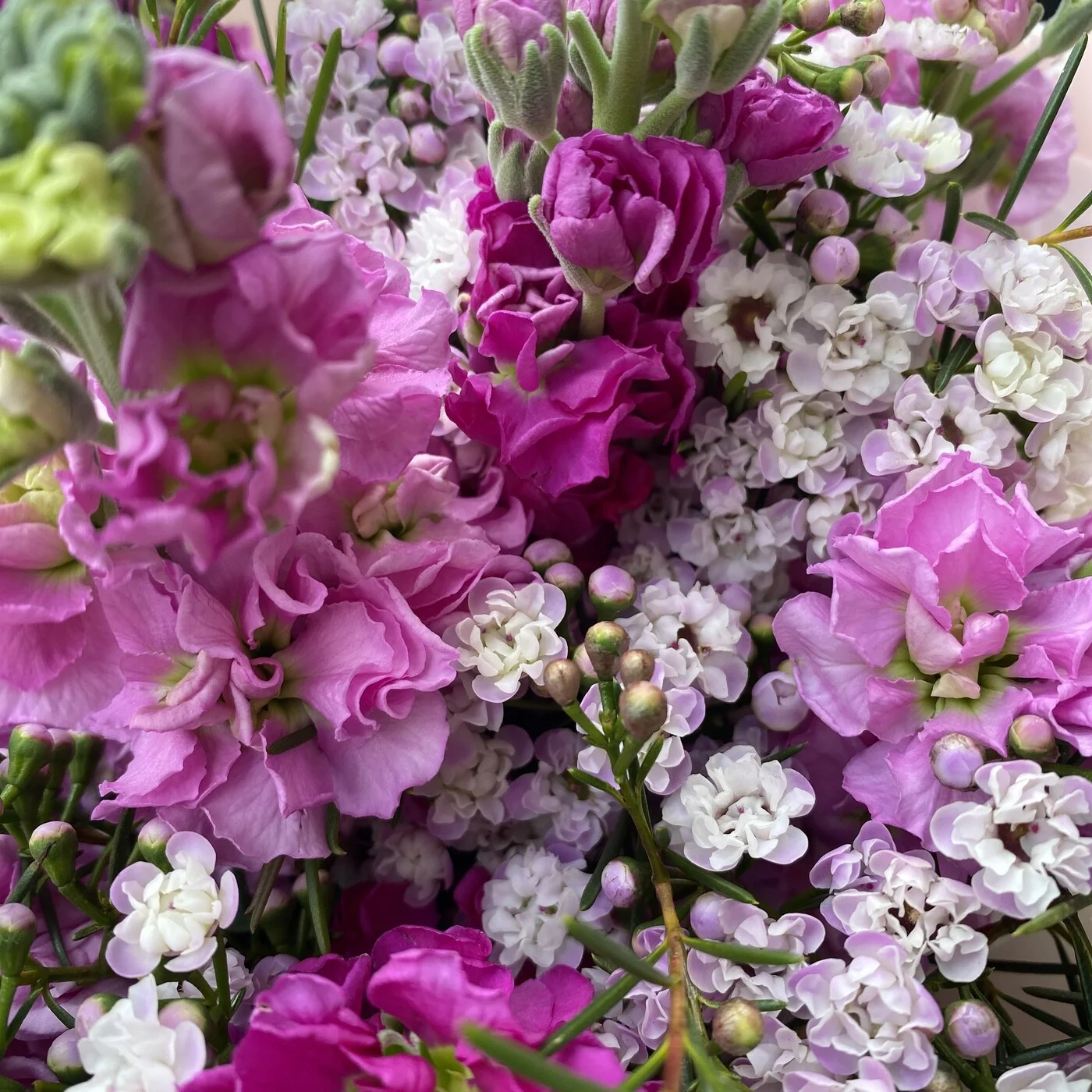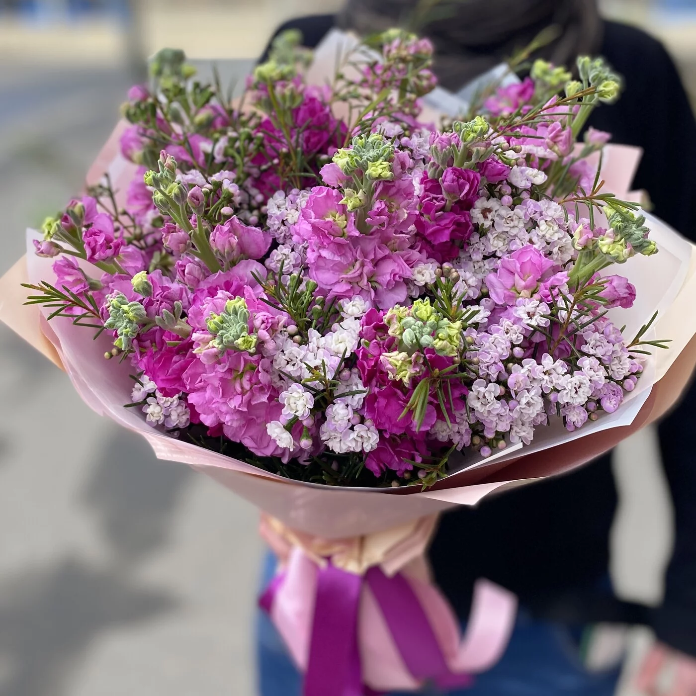 Букет из ароматных розовых и малиновых маттиол и шамелациума. Такой букет можно преподнести в качестве комплимента или подарить ребенку на день рождения.