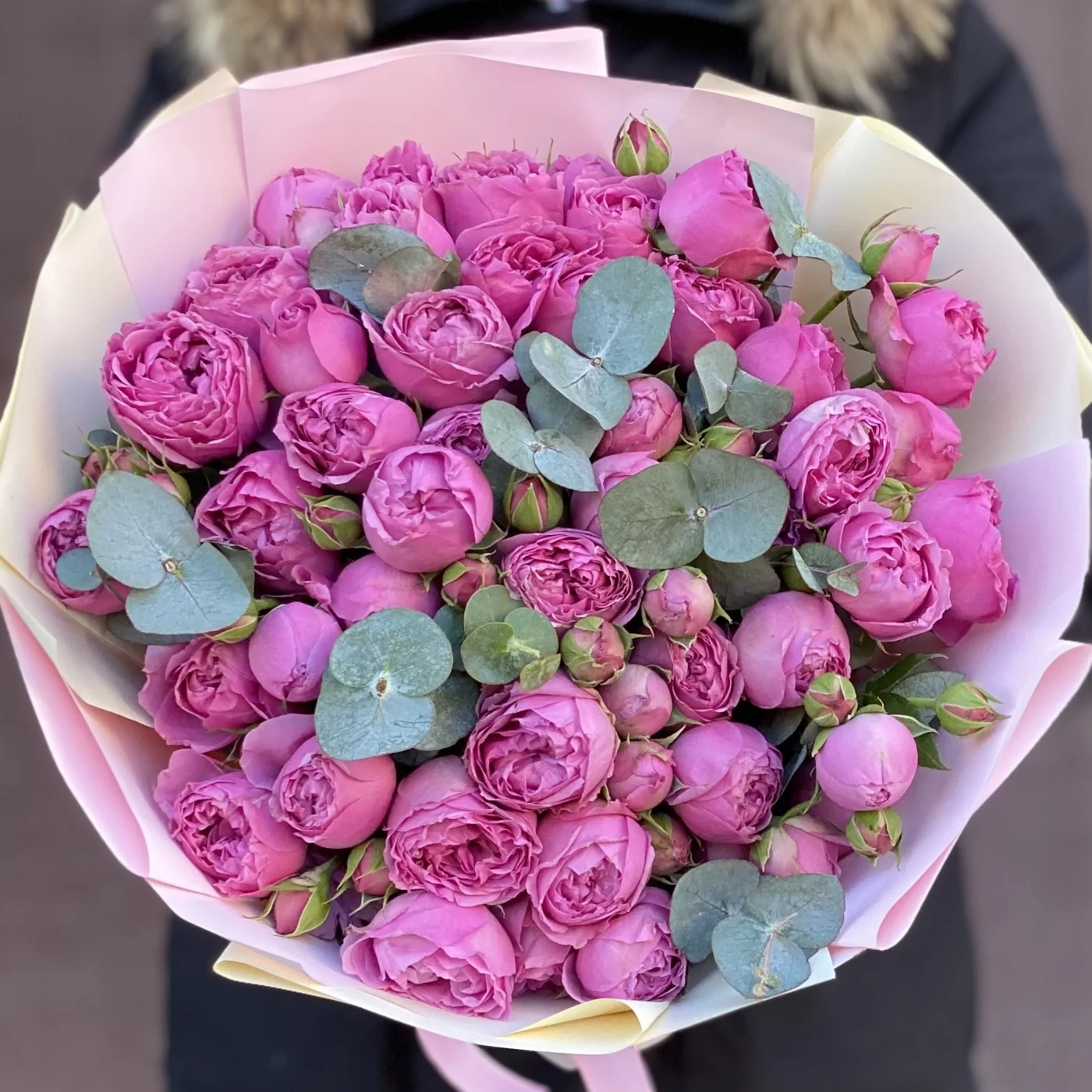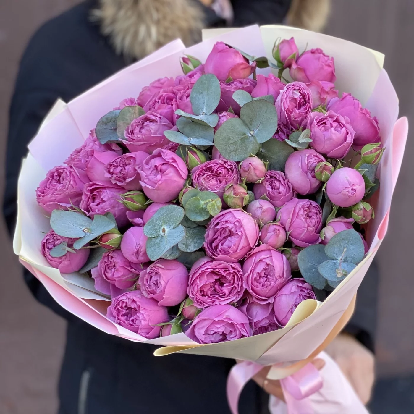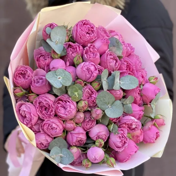 Букет Мисти баблс. Прекрасное сочетание пионовидных роз и эвкалипта. Приятный сюрприз своим родным и близким.