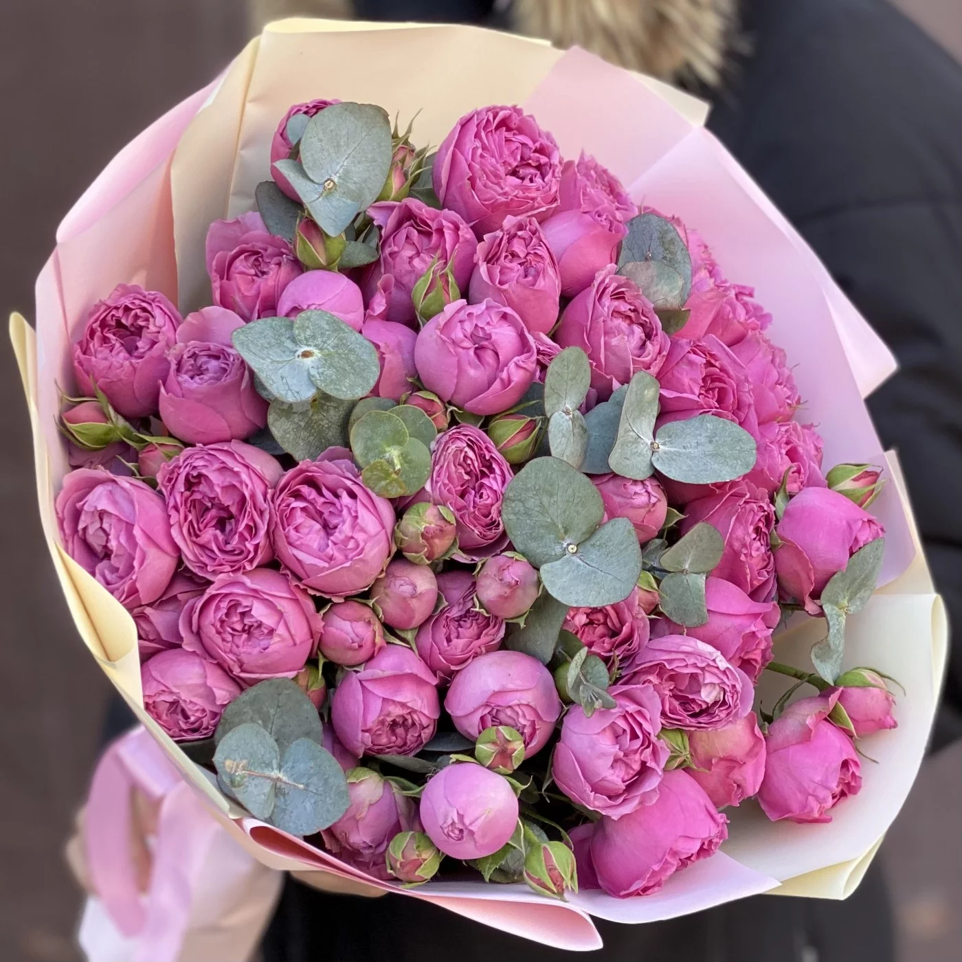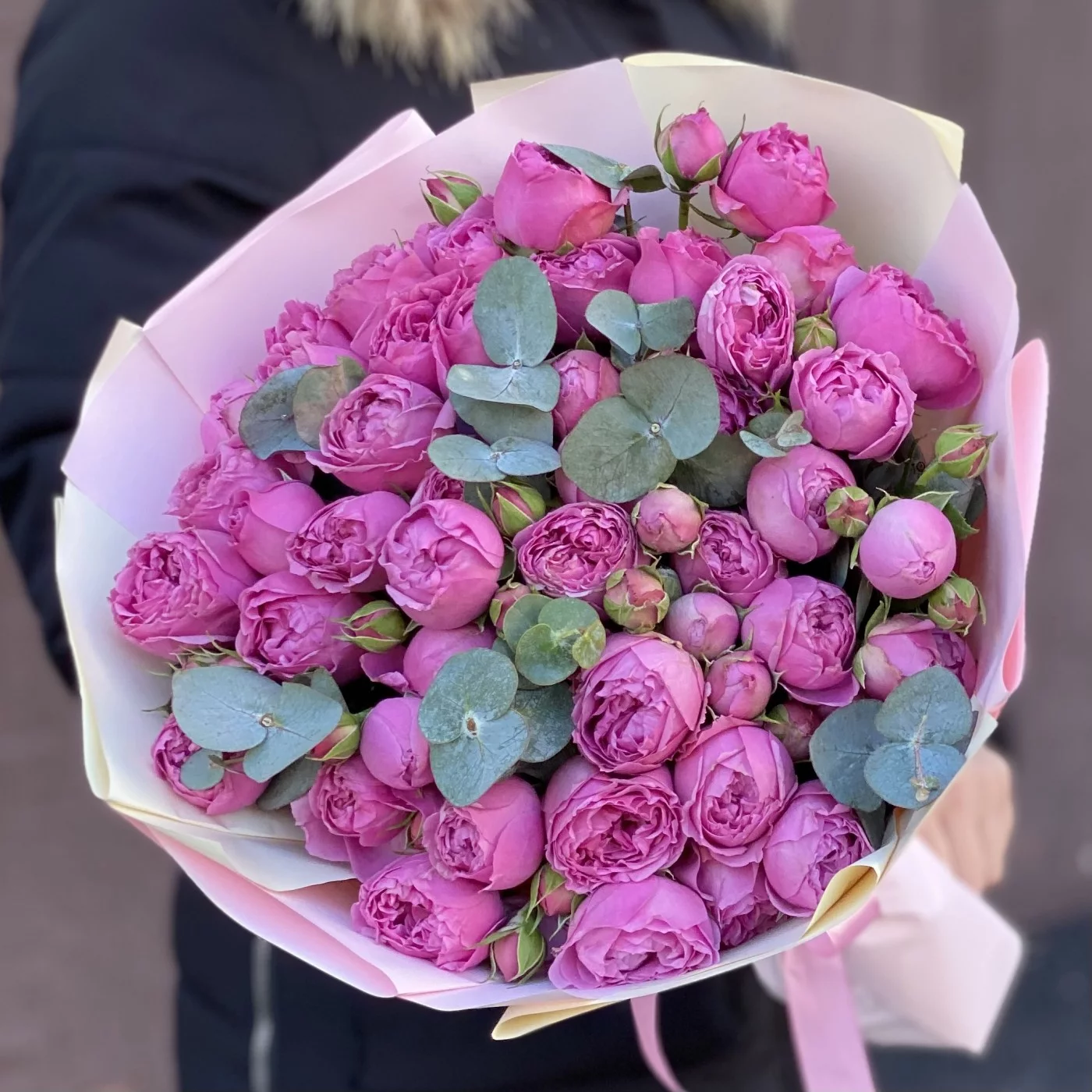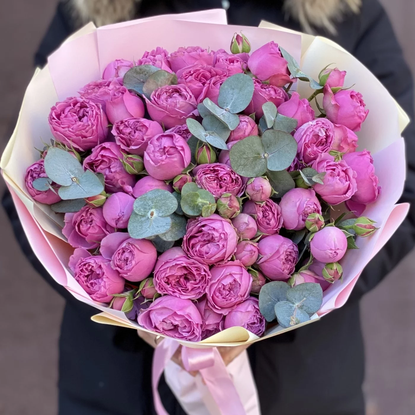 Букет Мисти баблс. Прекрасное сочетание пионовидных роз и эвкалипта. Приятный сюрприз своим родным и близким.