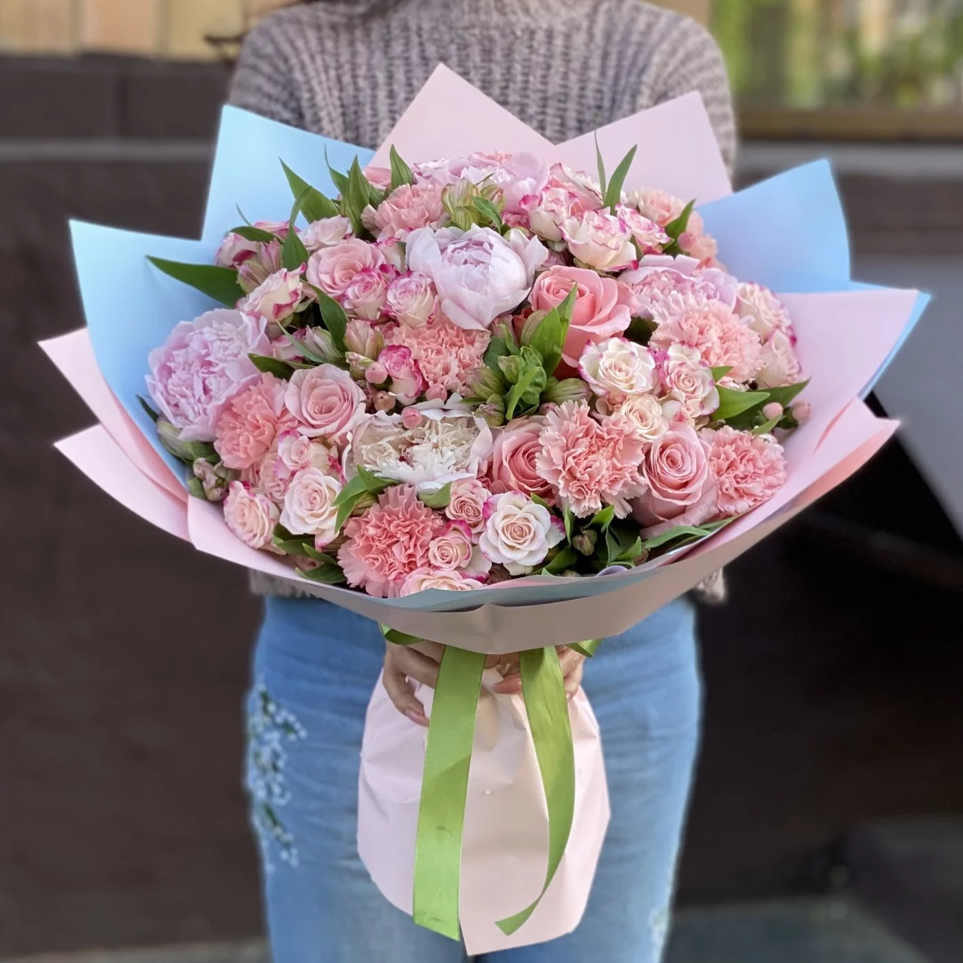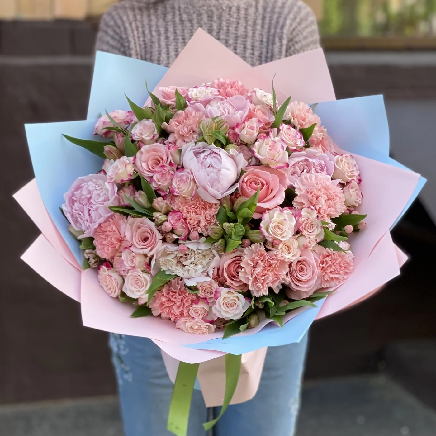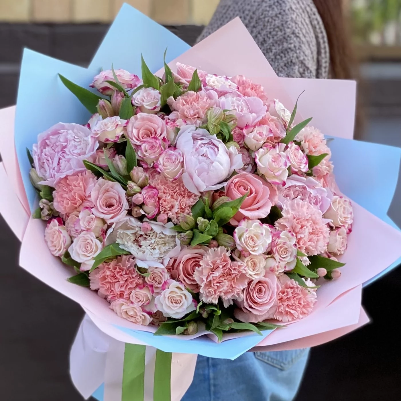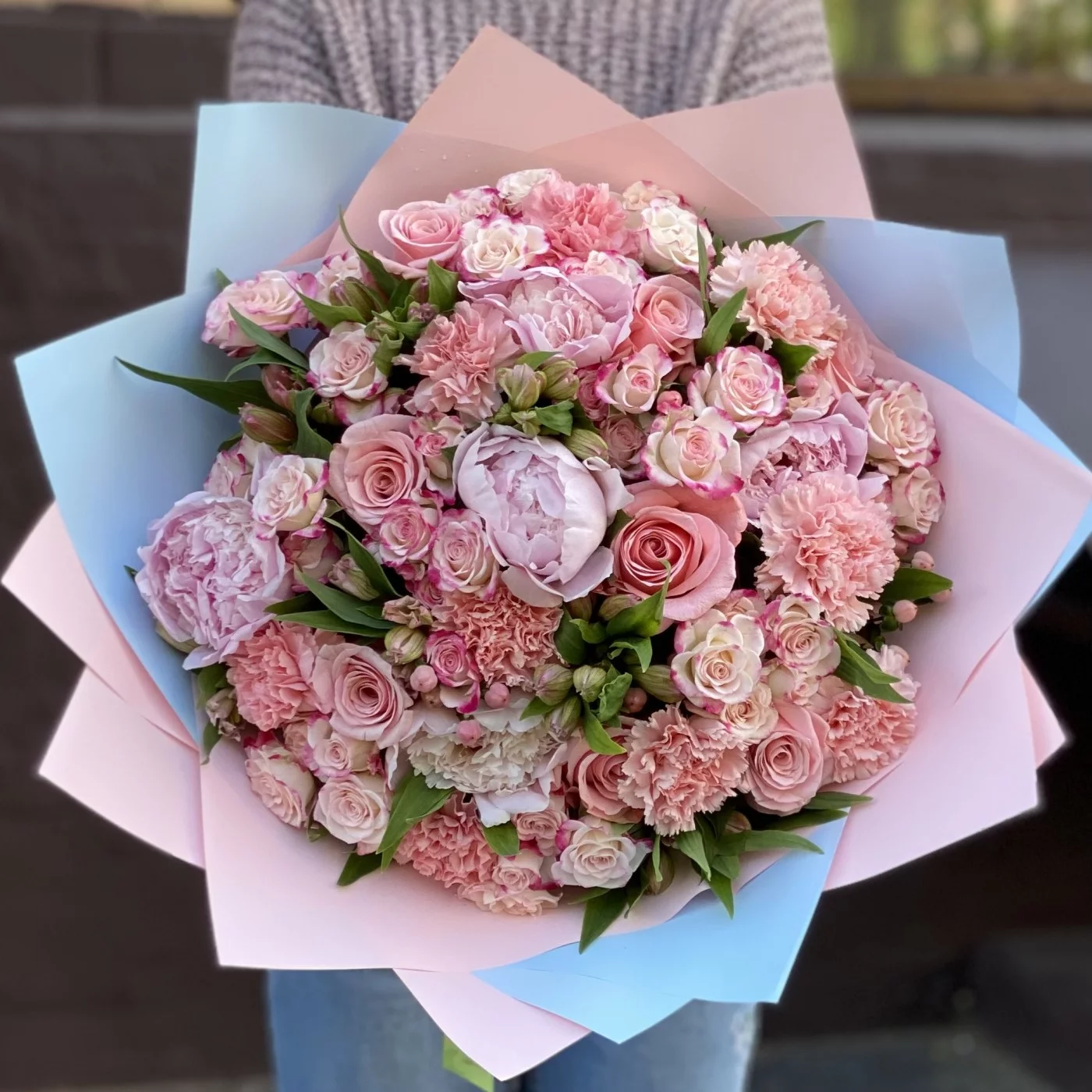 Трогательную нежность кустовой розы подчеркивают пышные бутоны пионов, а изящность гвоздик удачно сочетается с острыми зелеными листьями.. Компактный, но в то же время роскошный букет! Идеальный вариант для самых романтичных особ! Станет приятным сюрпризом для любимой женщины, дочери или мамы.
