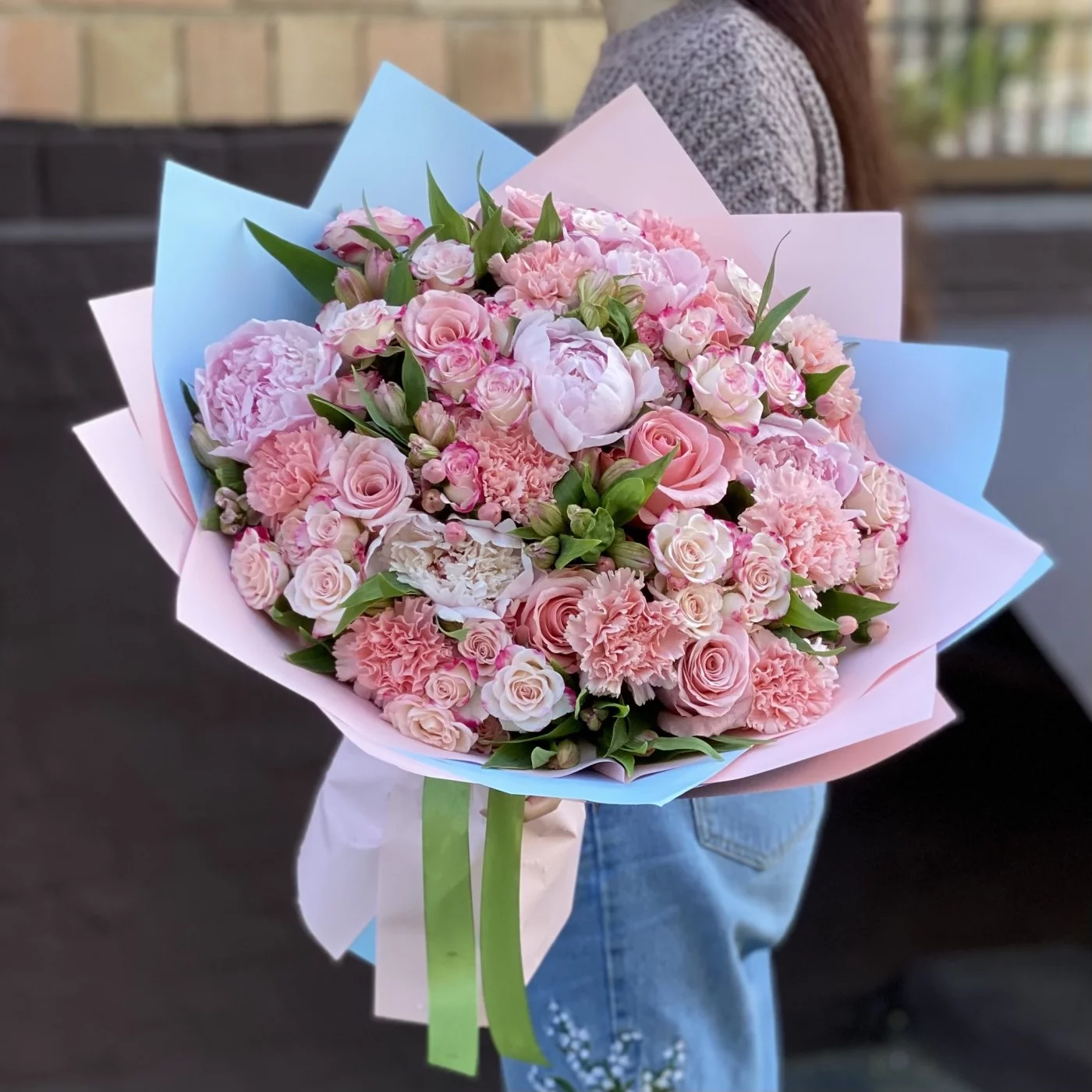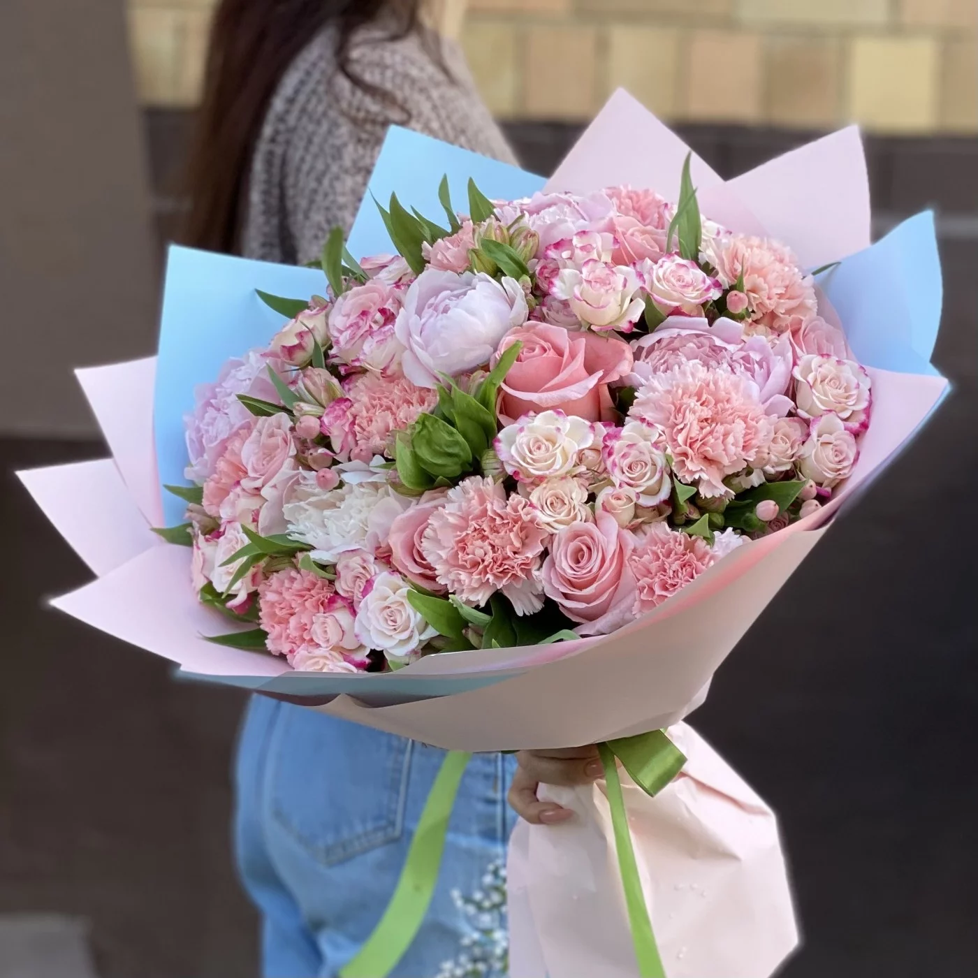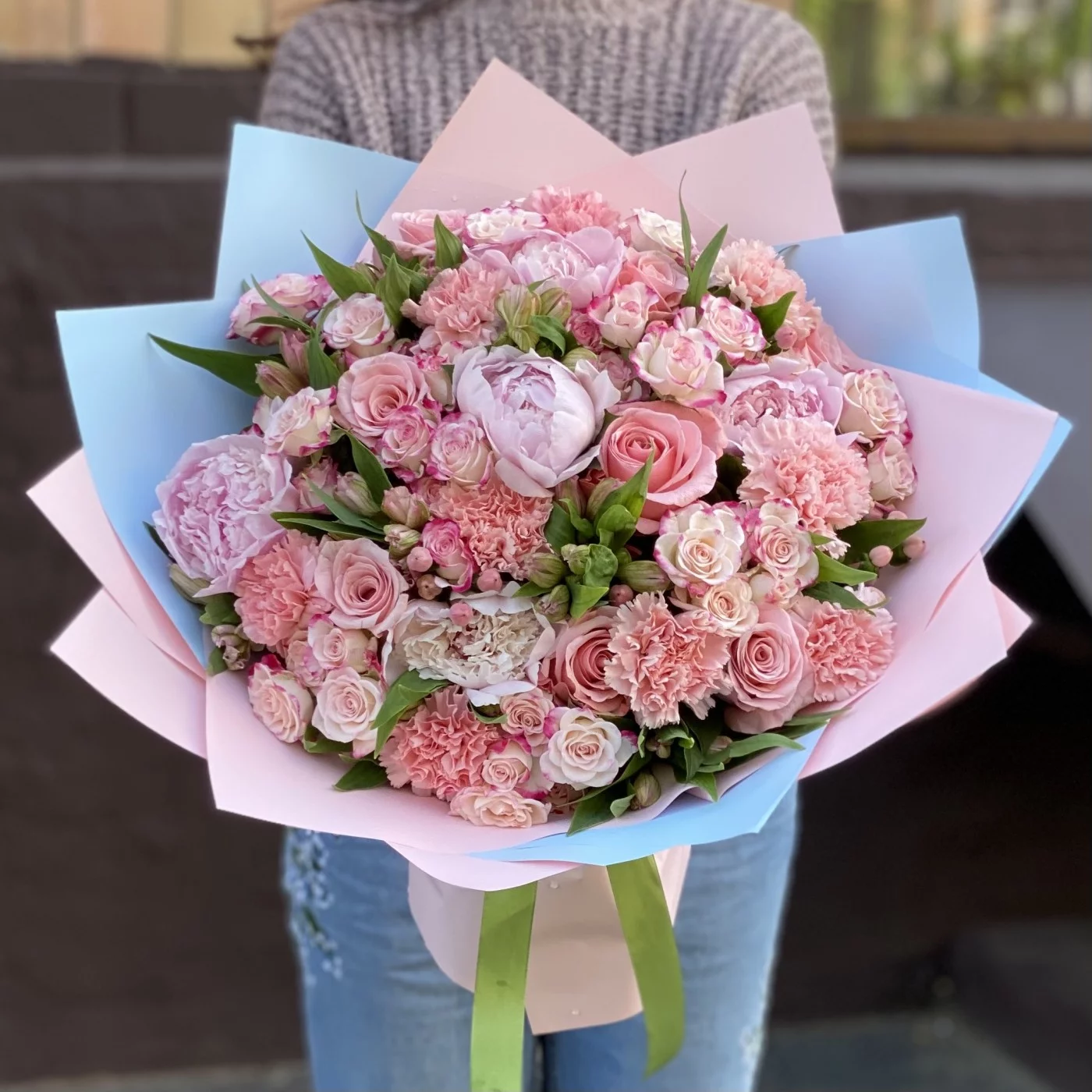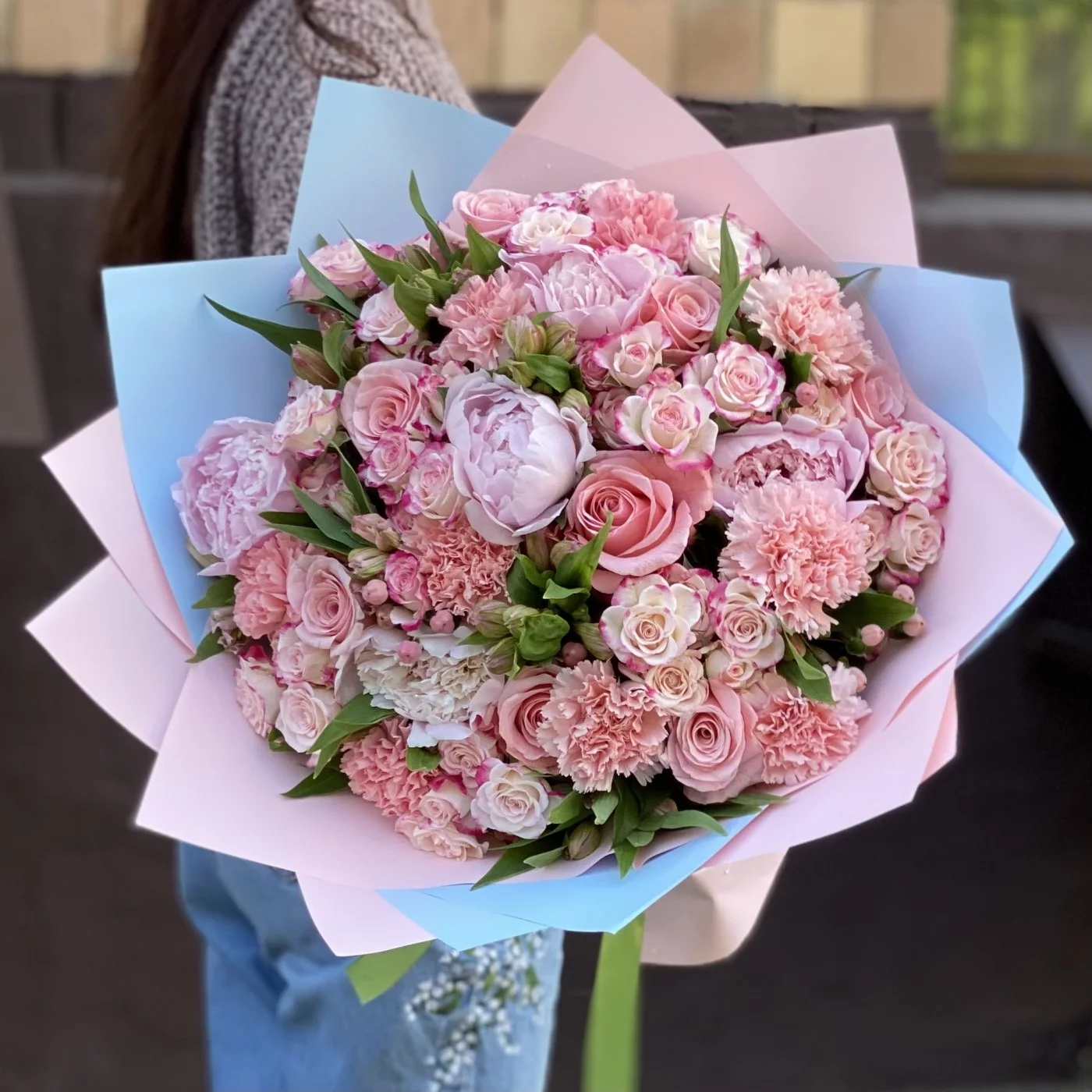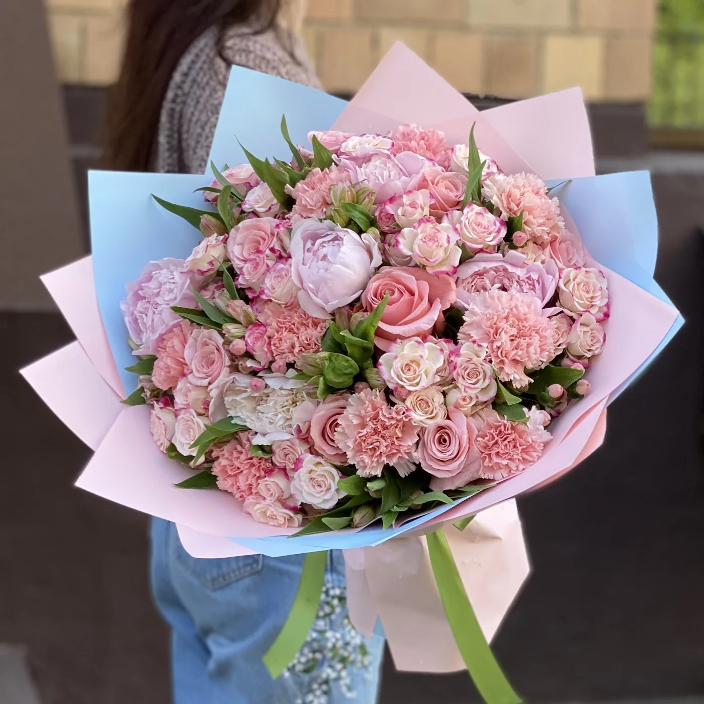 Трогательную нежность кустовой розы подчеркивают пышные бутоны пионов, а изящность гвоздик удачно сочетается с острыми зелеными листьями.. Компактный, но в то же время роскошный букет! Идеальный вариант для самых романтичных особ! Станет приятным сюрпризом для любимой женщины, дочери или мамы.
