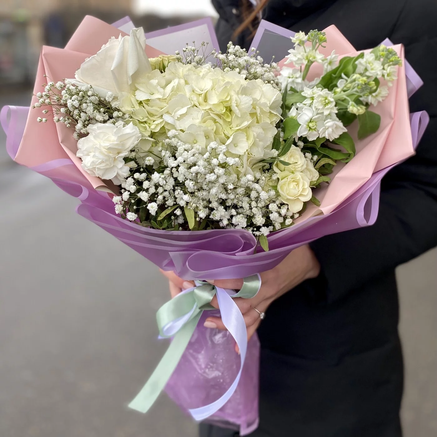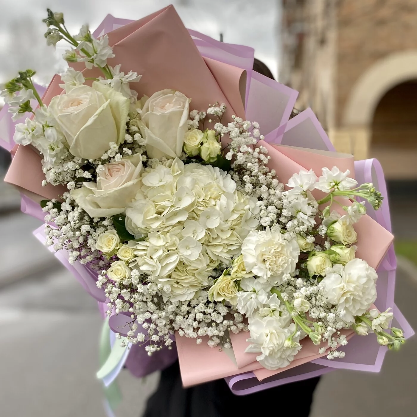 Купить нежный букет на день рождения женщине, маме, любимой. В состав букета входят белая гортензия, ароматная пионовидная роза и маттиола – сочетание этих ароматов делает этот букет незабываемым.
