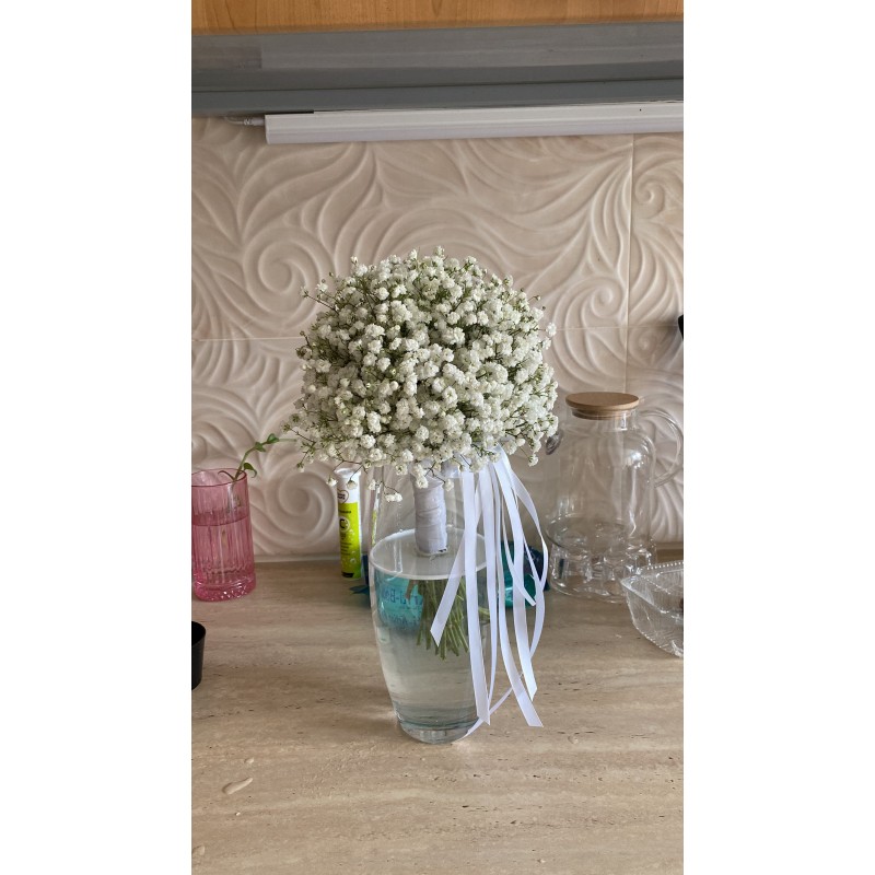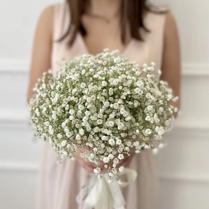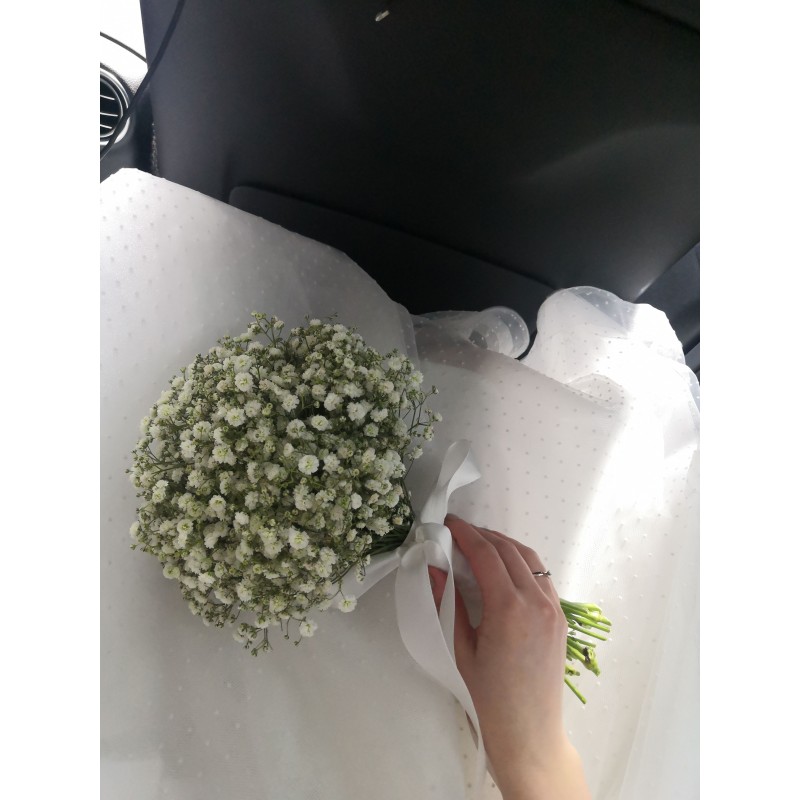Букет невесты нежные облака. Легкий и нежный букет напоминает воздушные облака. Такой букет очень удобен, он невесомый и вам будет несложно ходить с ним весь день. Прекрасно смотрится на свадебной фотосессии. Гипсофила имеет свойство превращаться в сухоцвет, по этому он может остаться в вазе у подружки невесты на долгую память об этом прекрасном дне. Вы можете заказать отдельно бутоньерку для жениха в стиль букета.