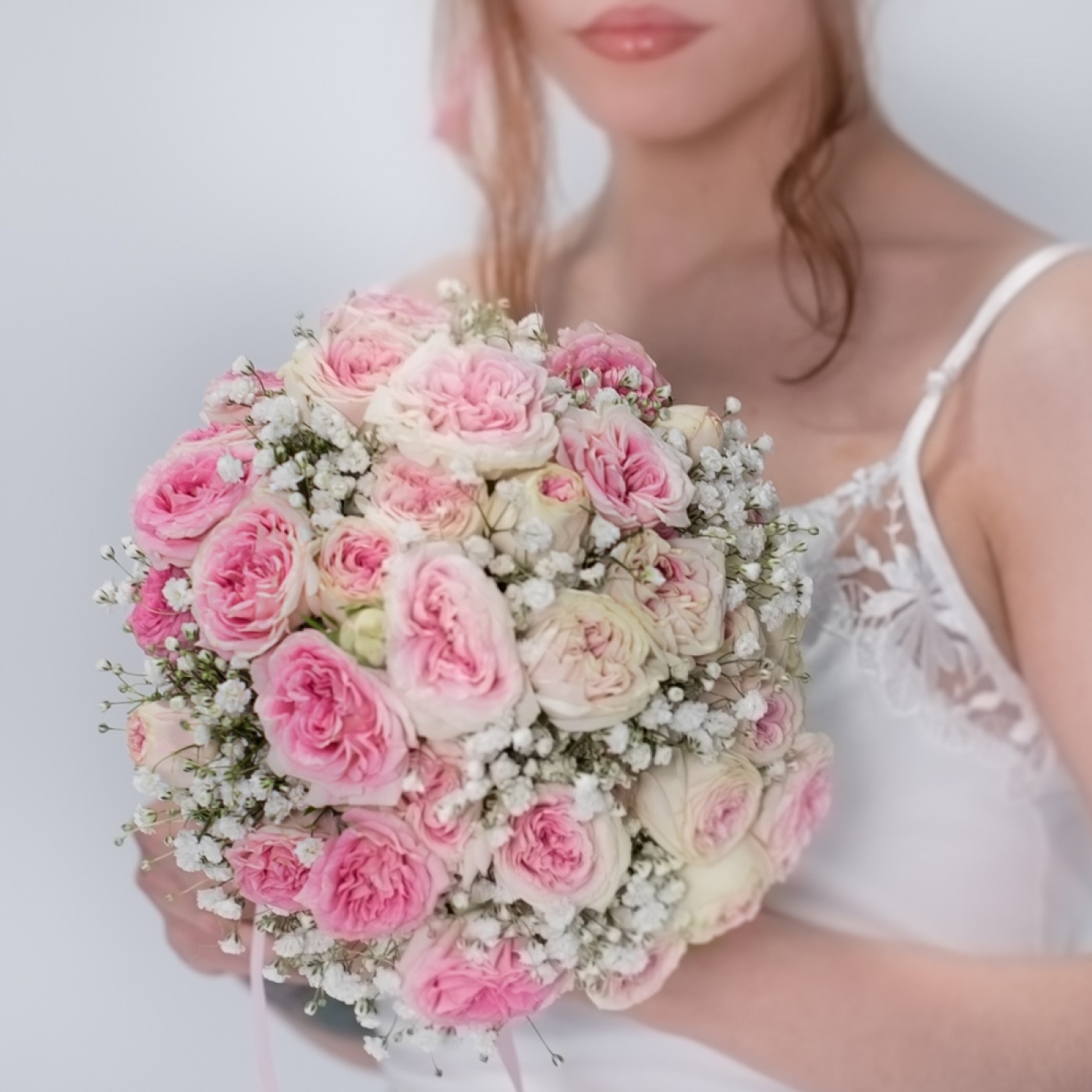 Потрясающий букет невесты из нежно-розовых кустовых пионовидных роз Джелатто с гипсофилой .