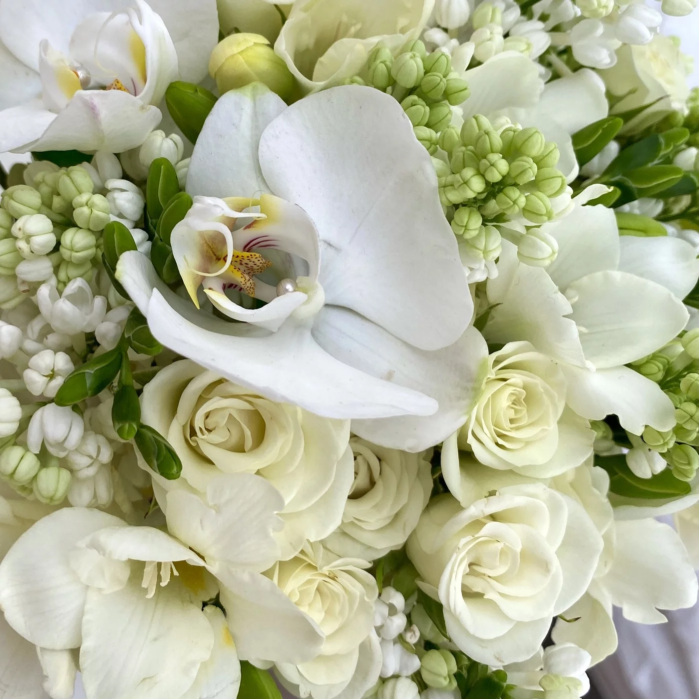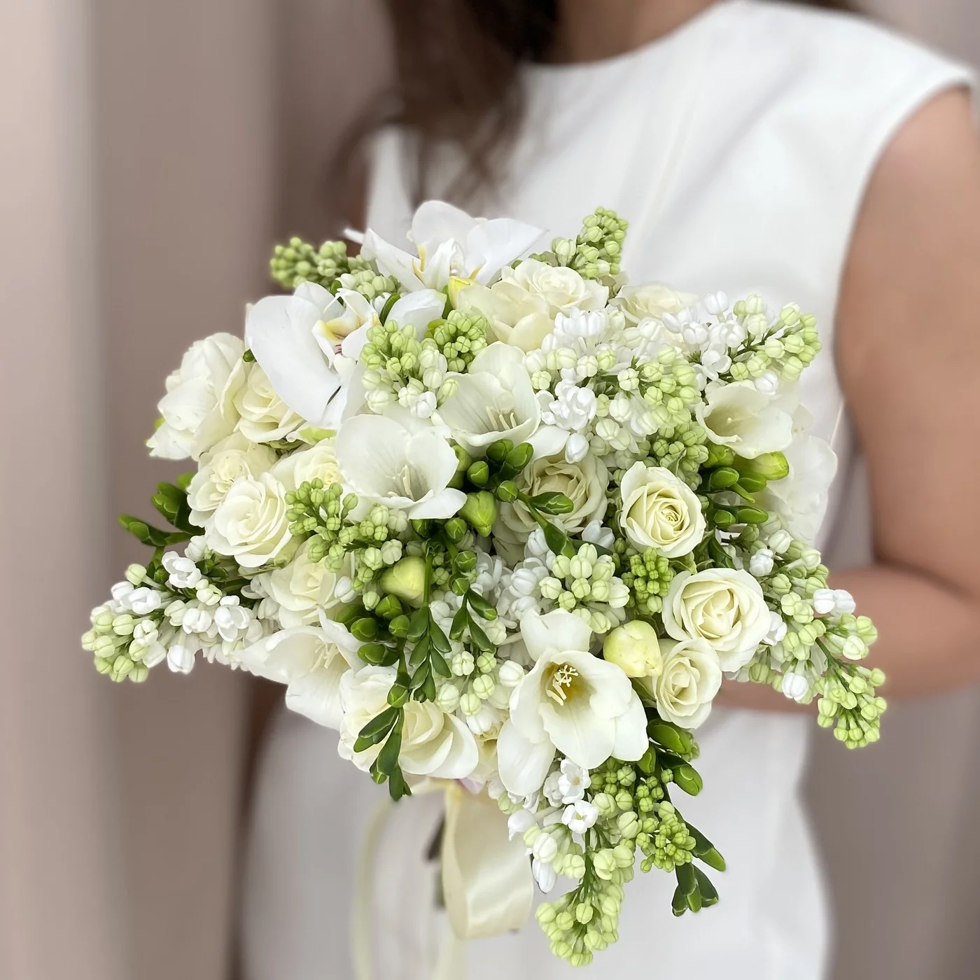 Букет невесты Аромат любви. С одной стороны это стандартный, белый букет невесты, но если посмотреть на его необычный состав, то сразу понимаешь его необычность и красоту. С таким букетом вы будите просто неотразимы. В состав входит сирень которая, оставляет за вами приятный, ароматный шлейф нежности и весны. Дополнительно к букету вы можете заказать бутоньерку для своего будущего мужа в стиль букета.