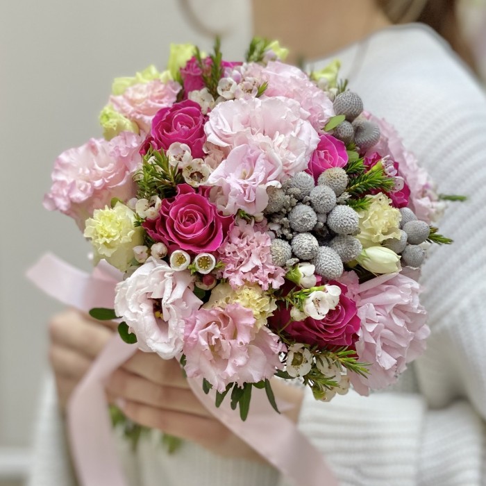 Нежно-розовый букет с розами и махровыми эустомами прекрасно подойдет к образу невесты. Отдельно вы можете заказать бутоньерку для жениха в стиль букета.
