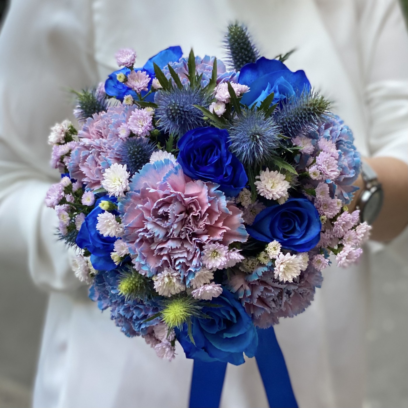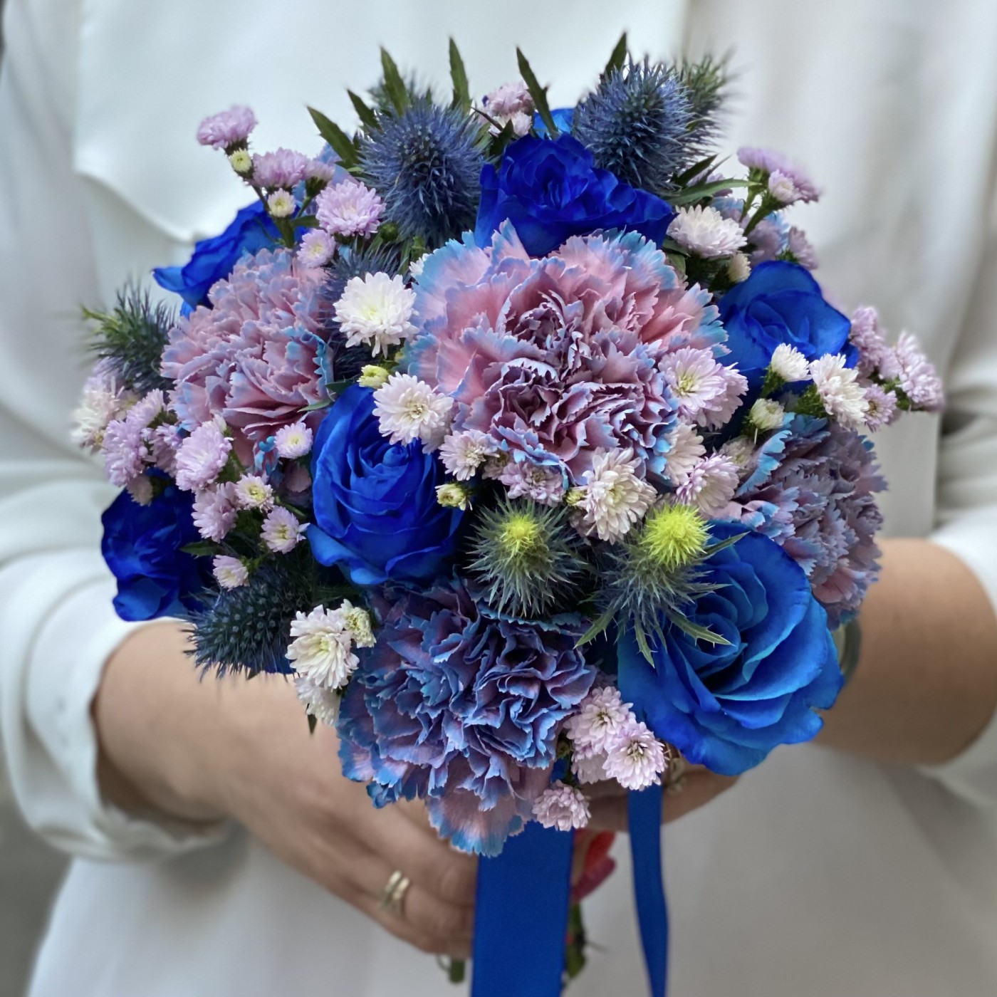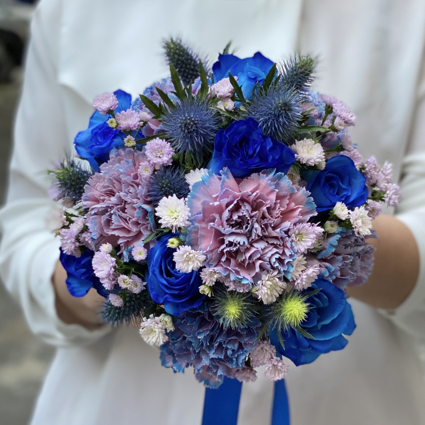 Букет невесты из синих роз и необычных гвоздик сорта Пинк блю молли подойдет для самой стильной невесты и несомненно станет изюминкой Вашего свадебного образа.