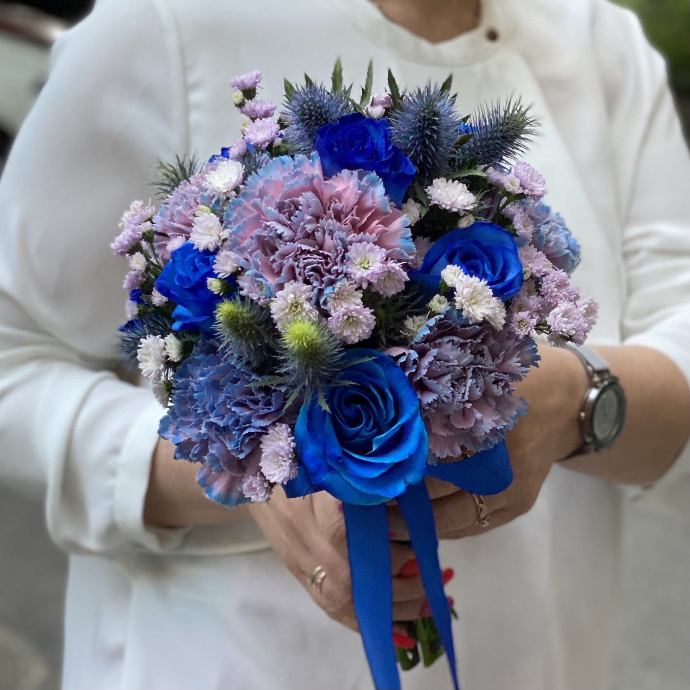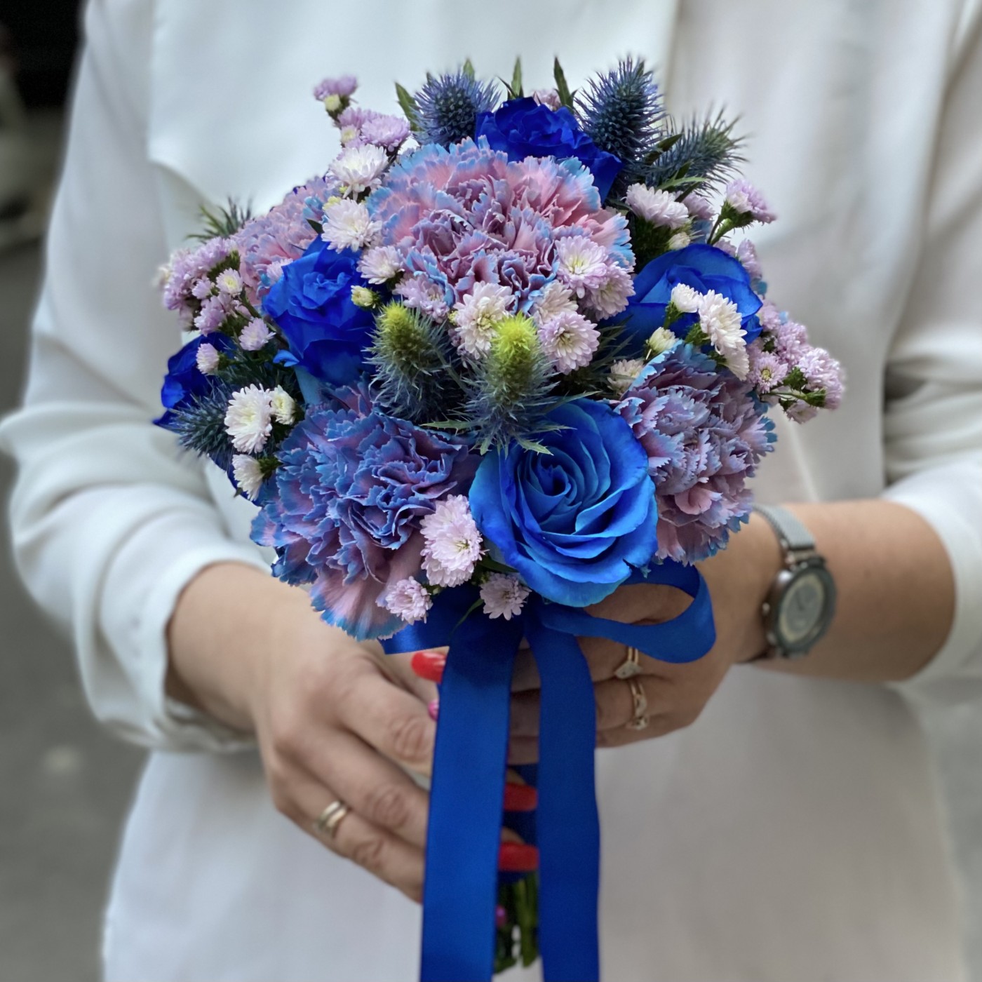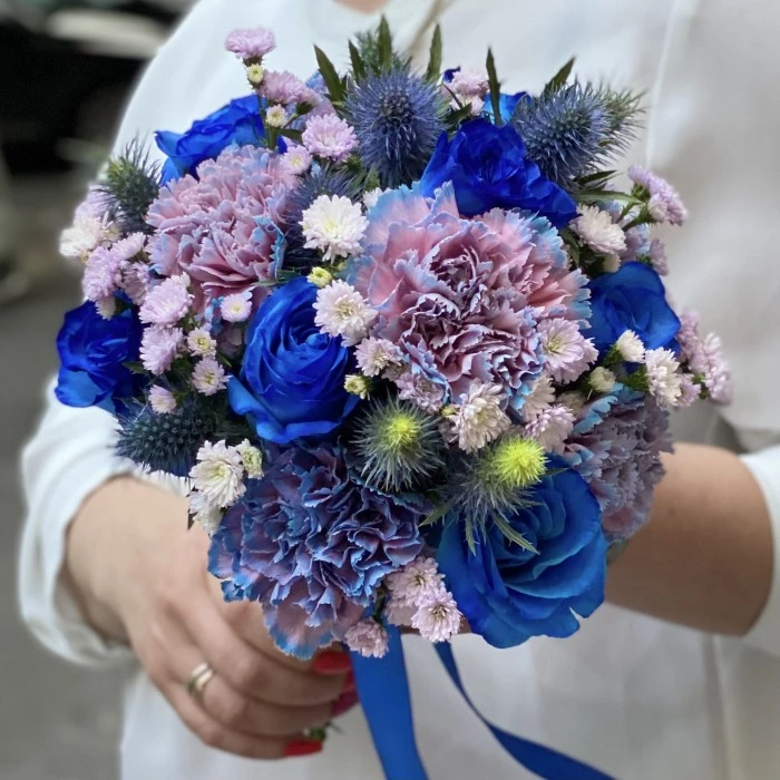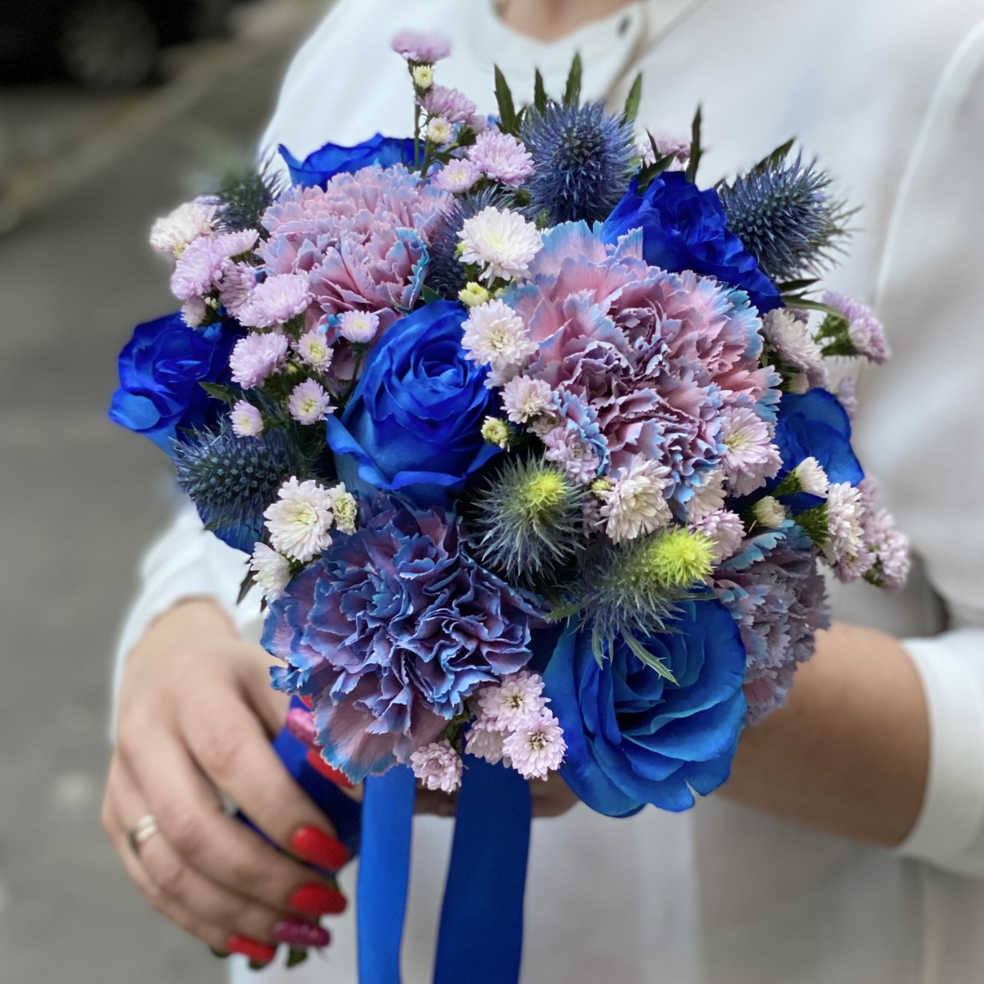 Букет невесты из синих роз и необычных гвоздик сорта Пинк блю молли подойдет для самой стильной невесты и несомненно станет изюминкой Вашего свадебного образа.