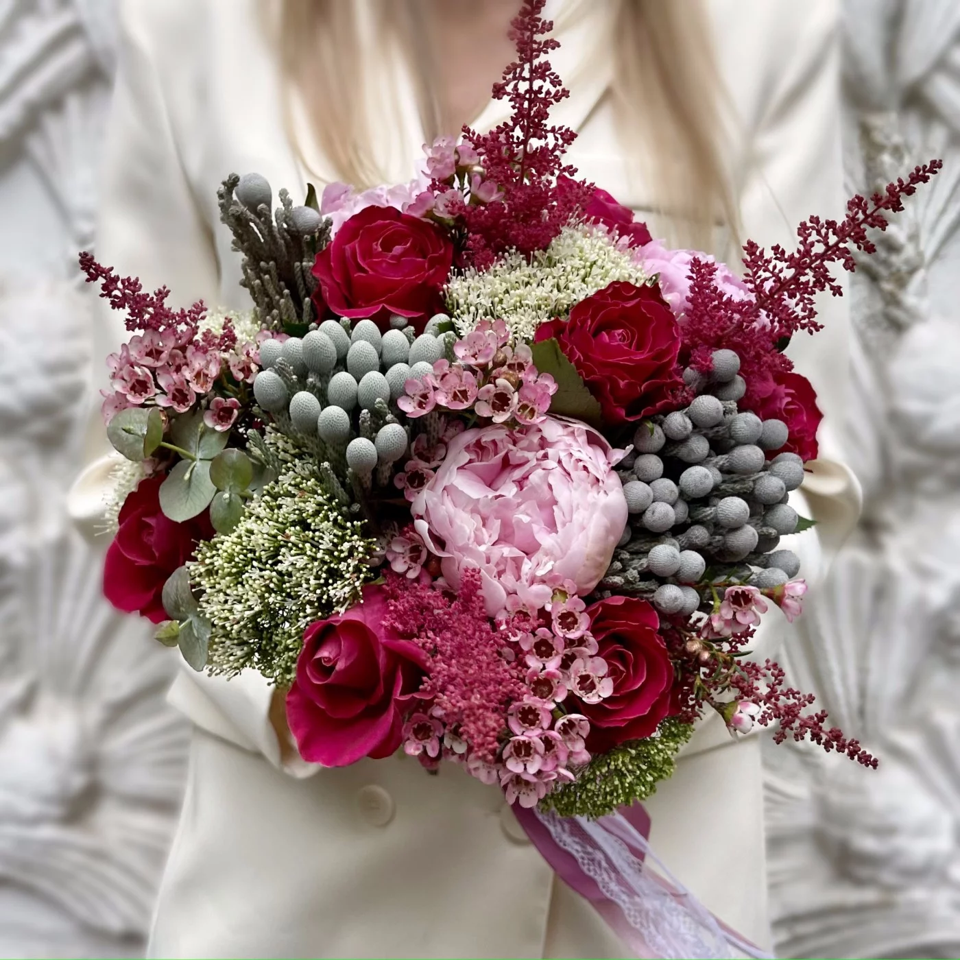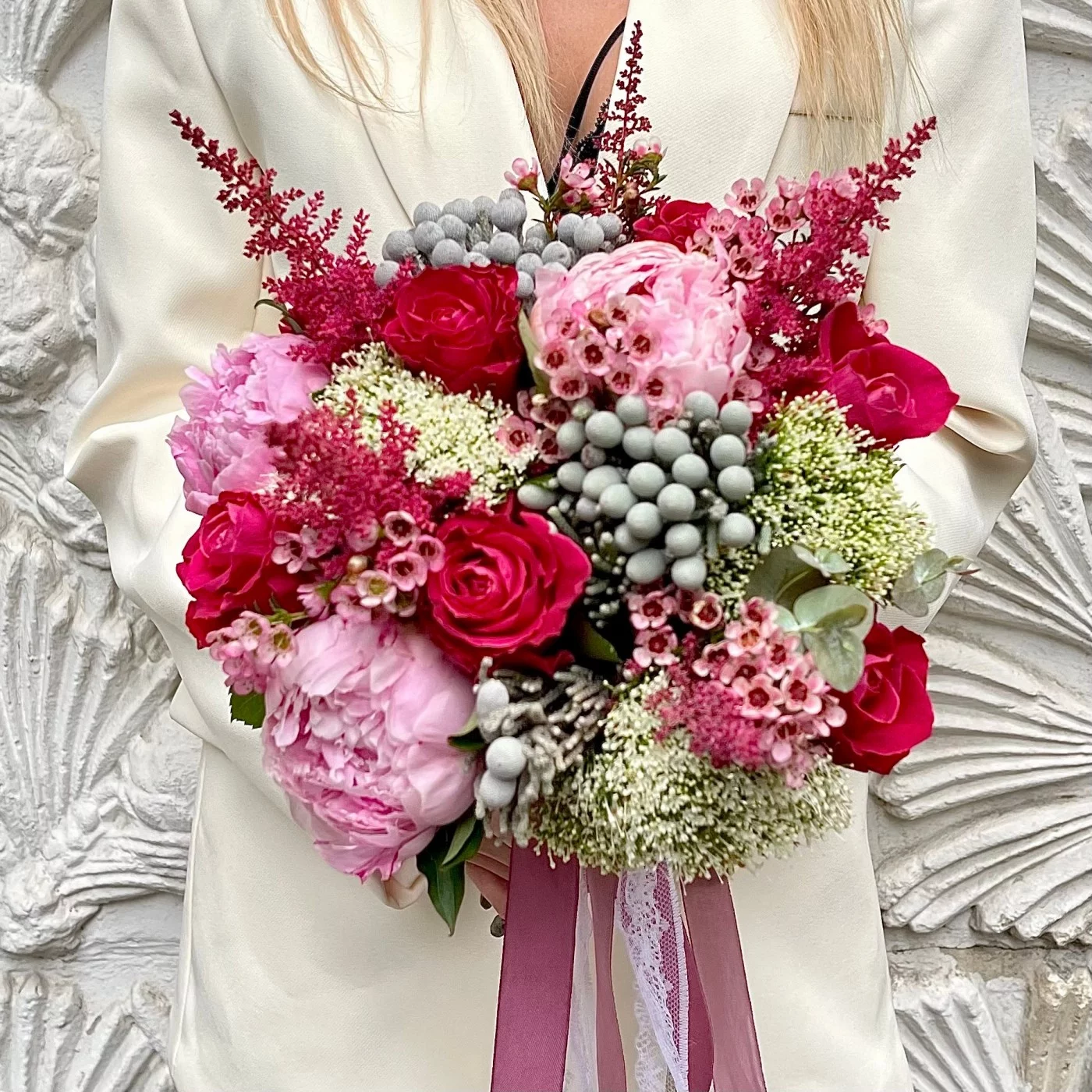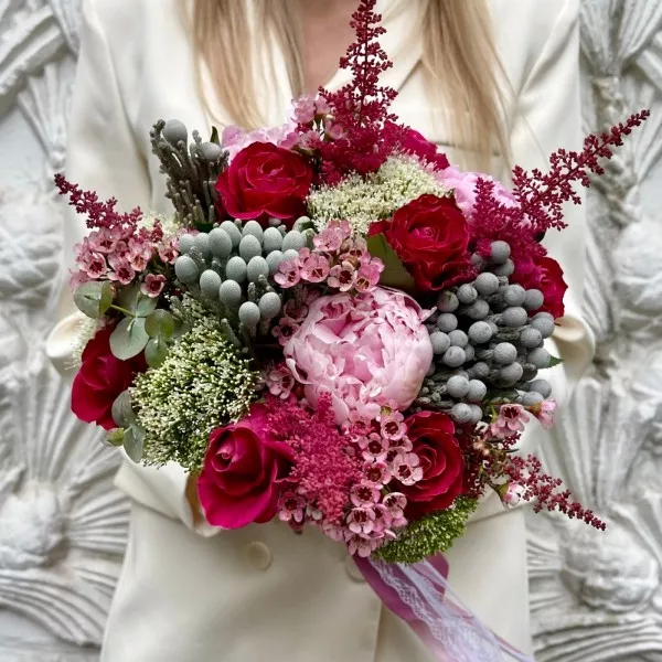 Букет невесты в ягодно-розовых оттенках будет превосходно смотреться на ваших свадебных фотографиях. Он красиво контрастирует с классическим свадебным платьем, имеет тонкий аромат и состоит из самых изысканных цветов. Вы можете заказать бутоньерку в таком же стиле.