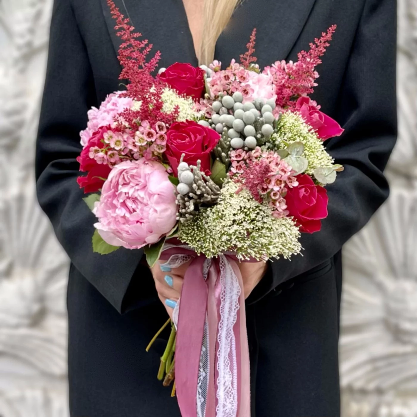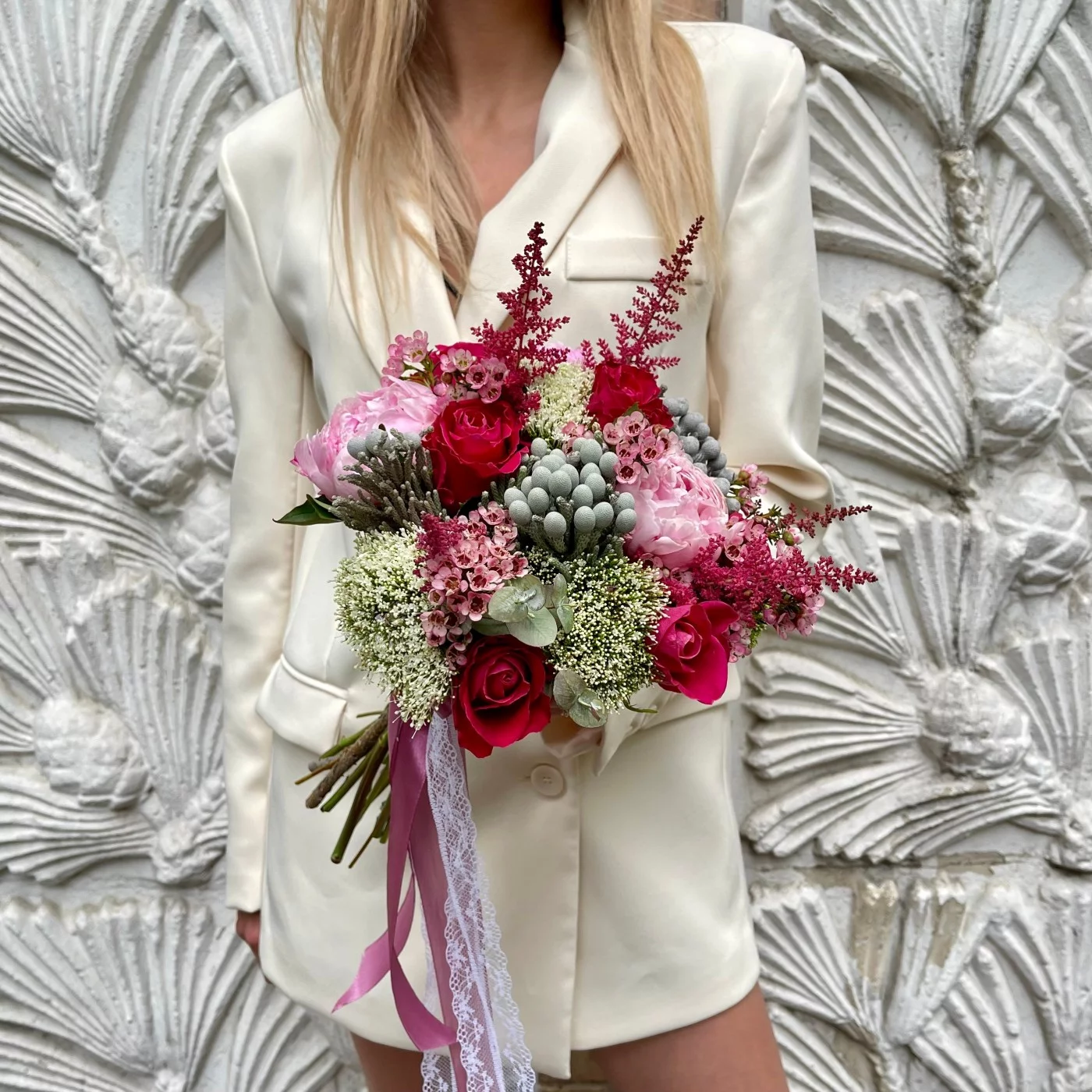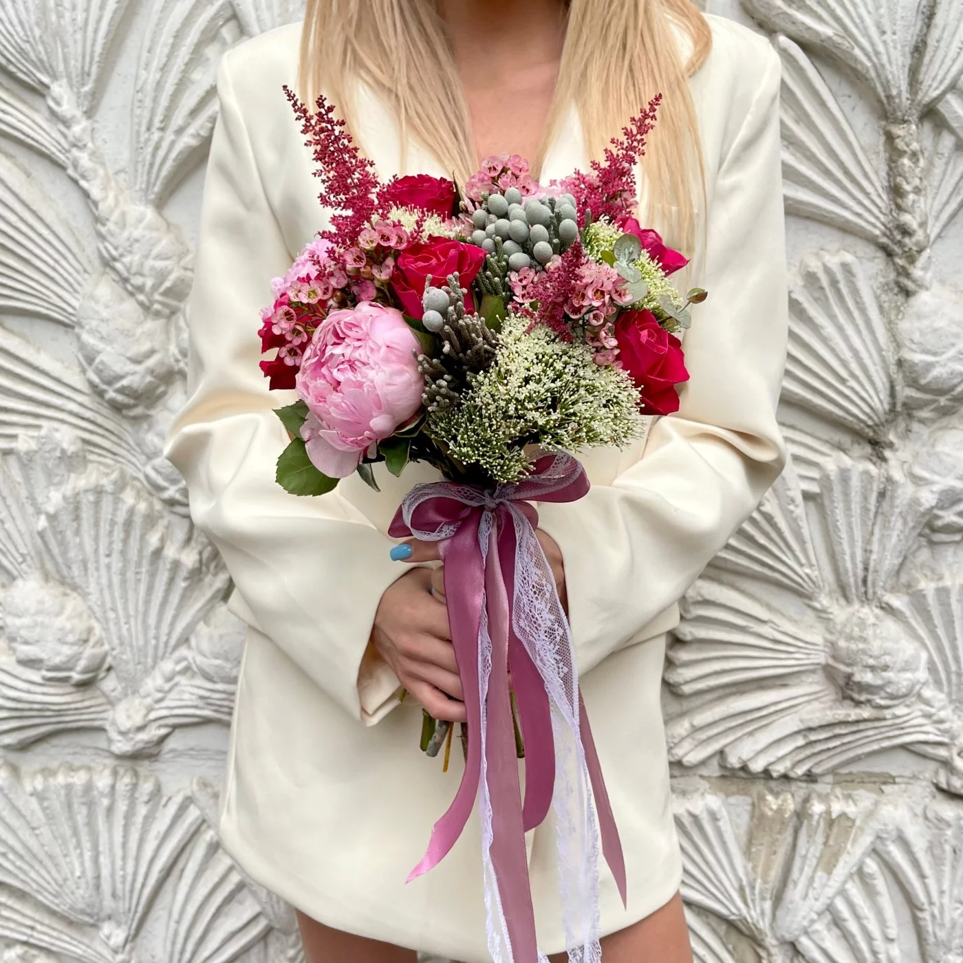 Букет невесты в ягодно-розовых оттенках будет превосходно смотреться на ваших свадебных фотографиях. Он красиво контрастирует с классическим свадебным платьем, имеет тонкий аромат и состоит из самых изысканных цветов. Вы можете заказать бутоньерку в таком же стиле.