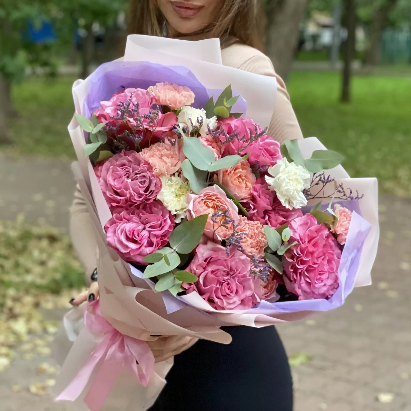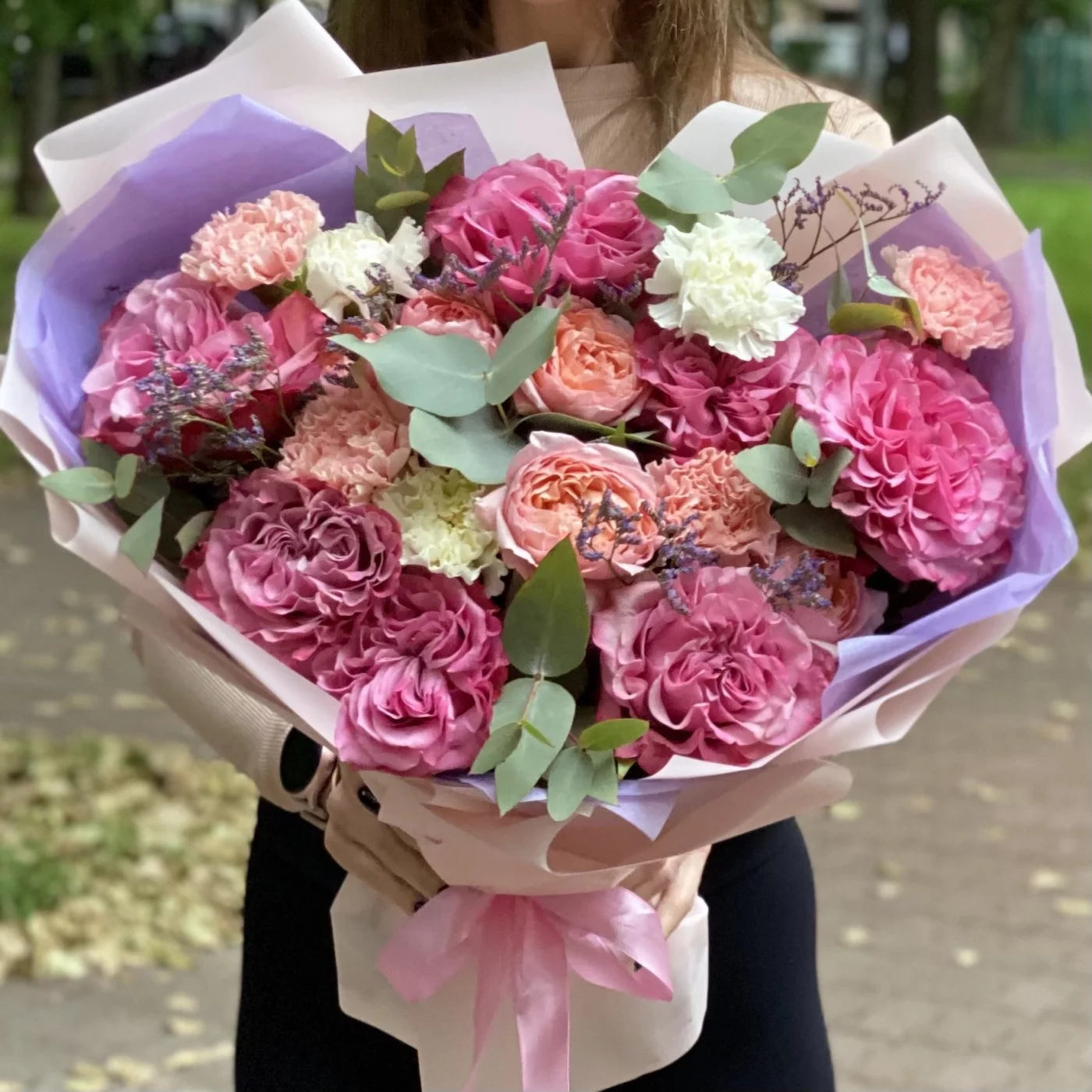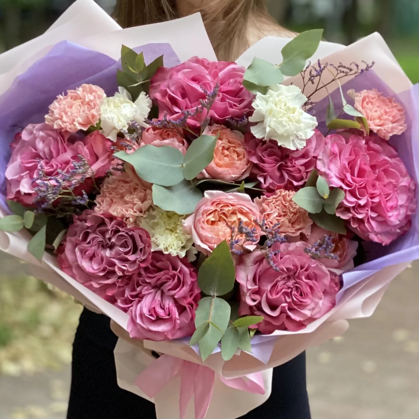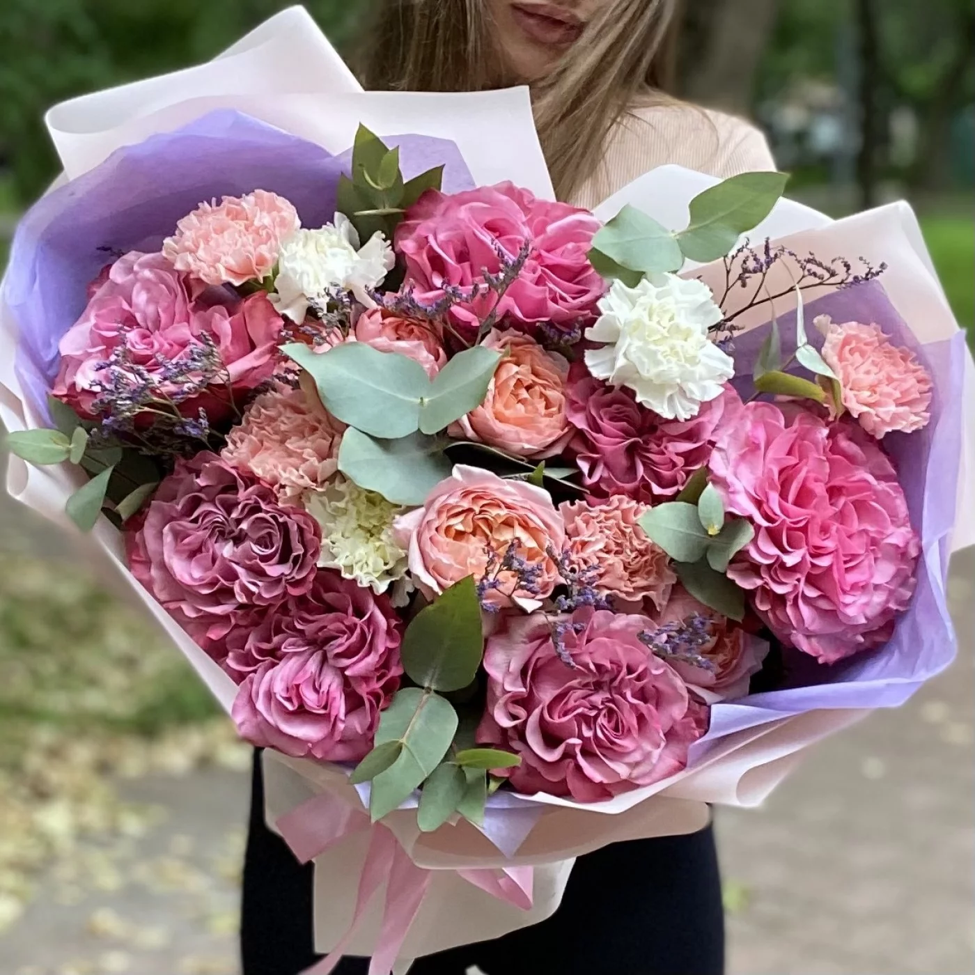 Сиреневый букет с пионовидными розами сорта Кантри Блюз. Букет упакован в стильную корейскую пленку. Доставляем цветы и букеты круглосуточно.
