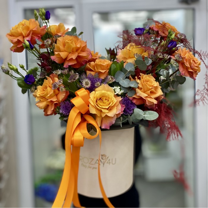 Композиция выполнена в ярком оранжевом оттенке, крупные розы сорта Фри Спирит создают солнечное настроение и обязательно подарят улыбку своей получательнице.